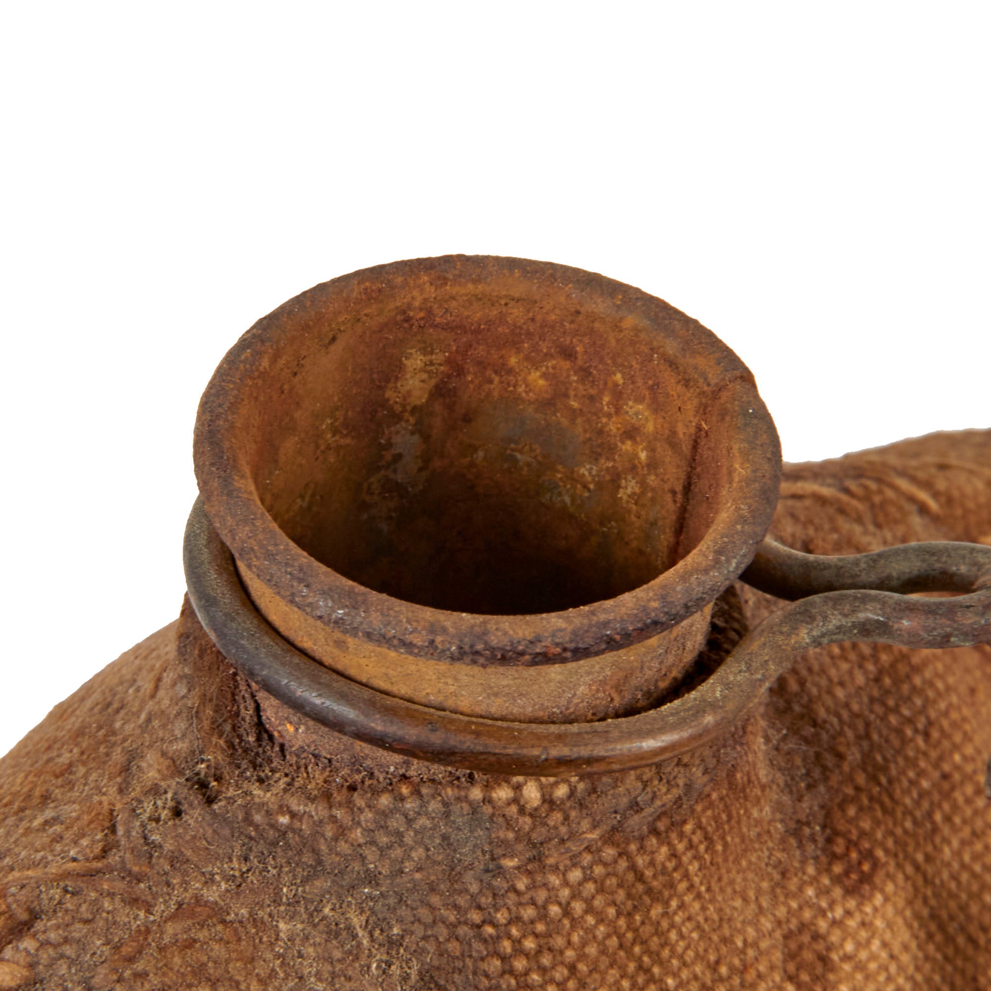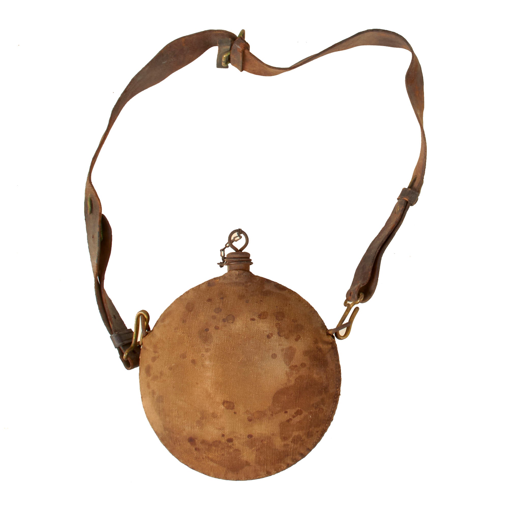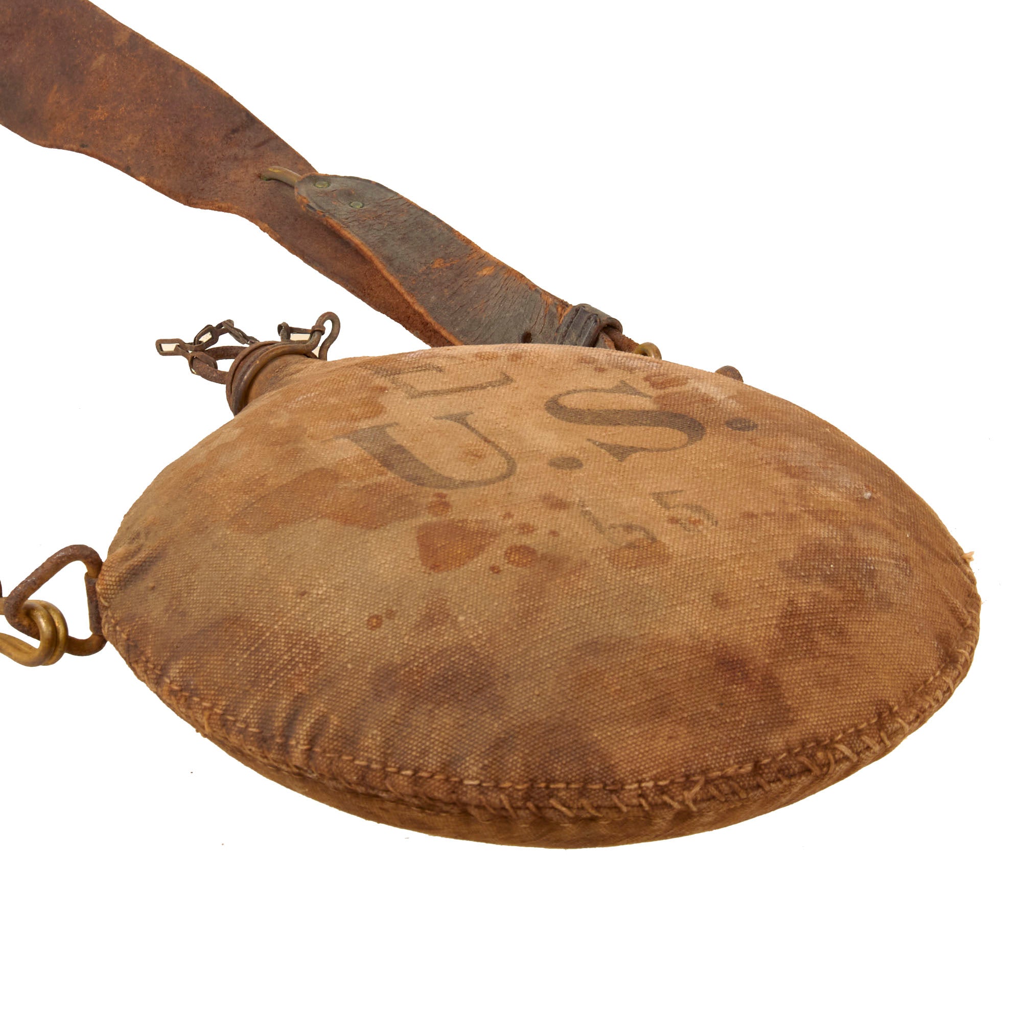 The canteen is complete with its original cork stopper secured to the neck of the canteen by a brass ring and chain. The cork itself is complete but has shrunk due to age. It also has the proper pattern leather shoulder strap, of the later adjustable style in fair condition, but has dried out and heavy cracks and scaling are present in the finish, which is expected. There is a stamp in the strap reading ROCK ISLAND ARSENAL.