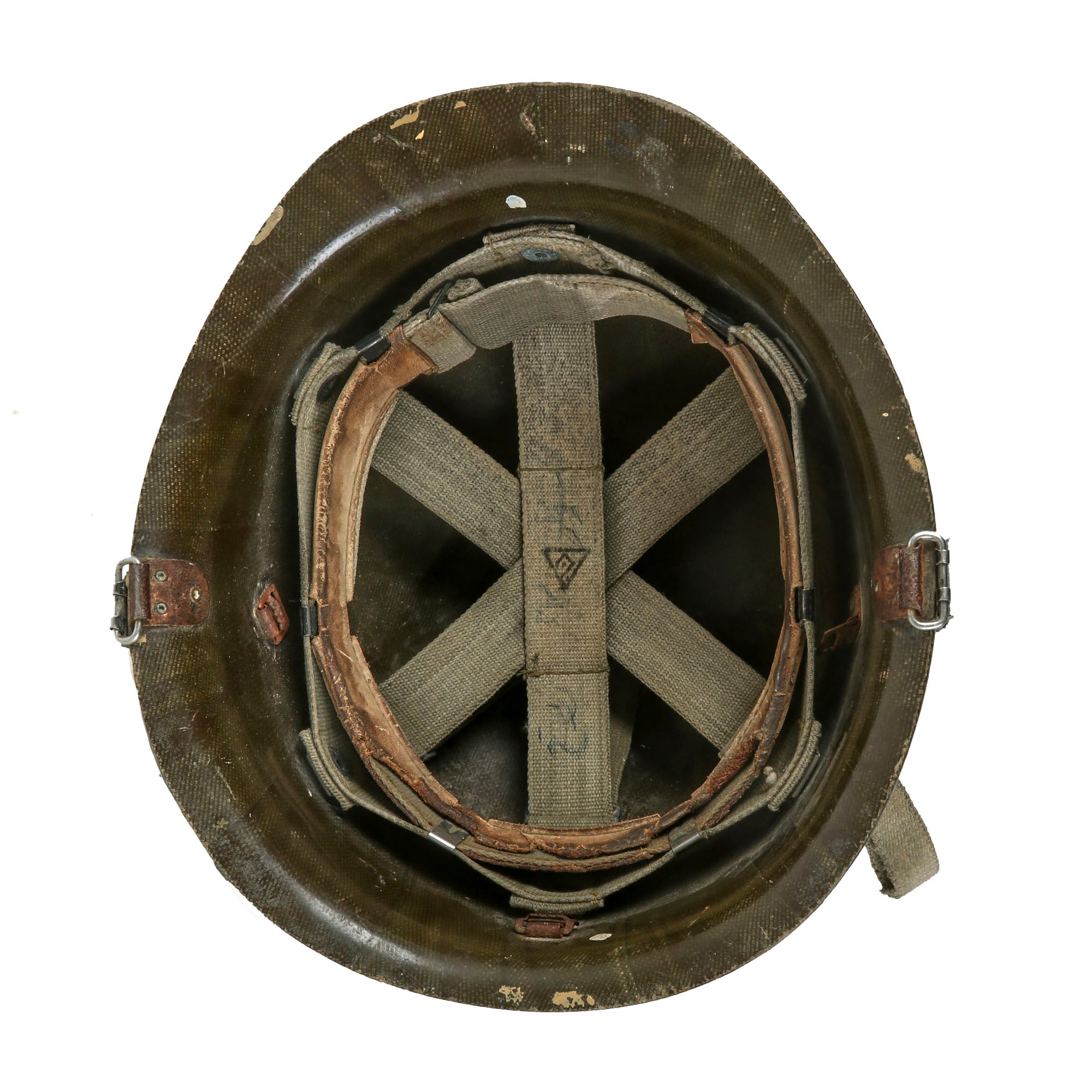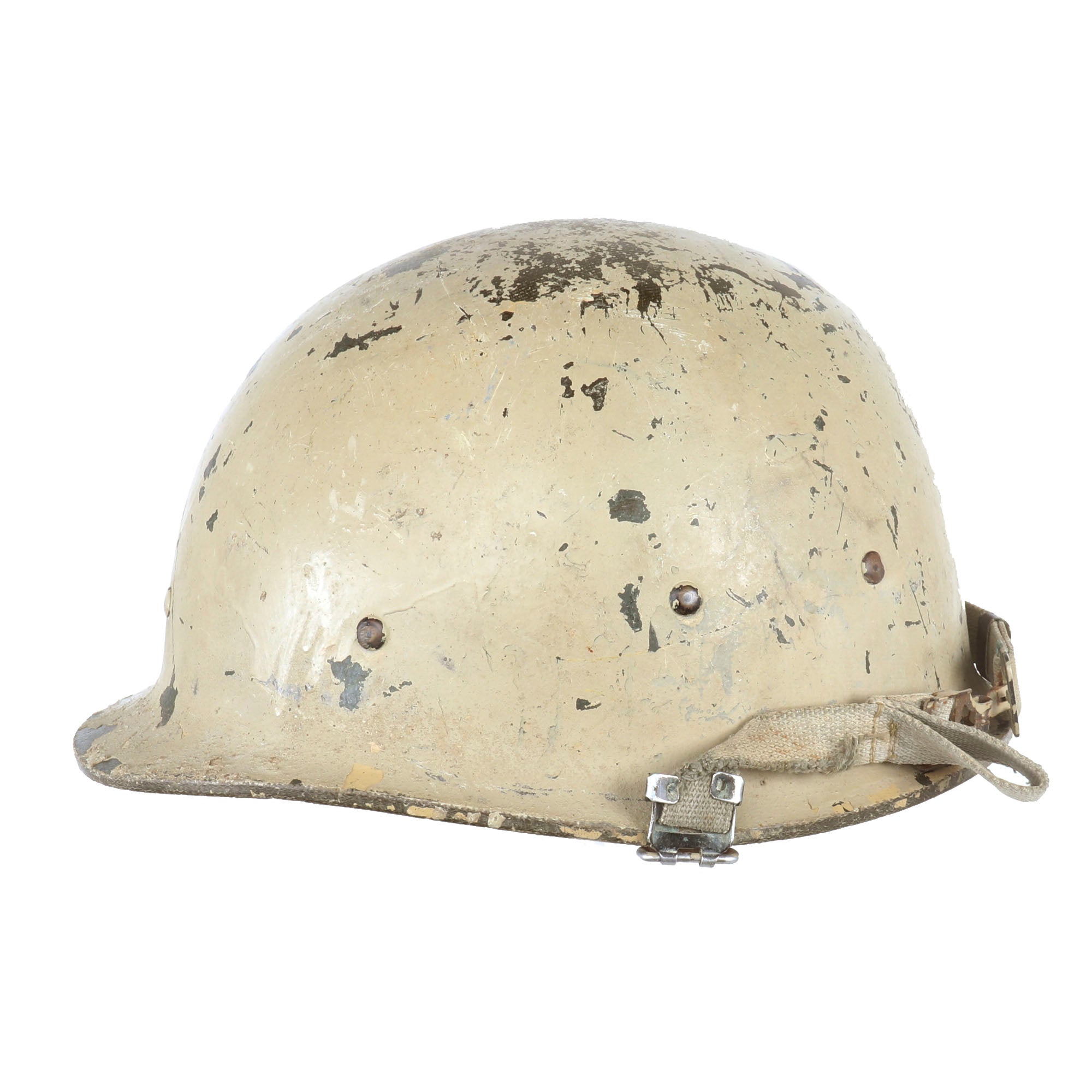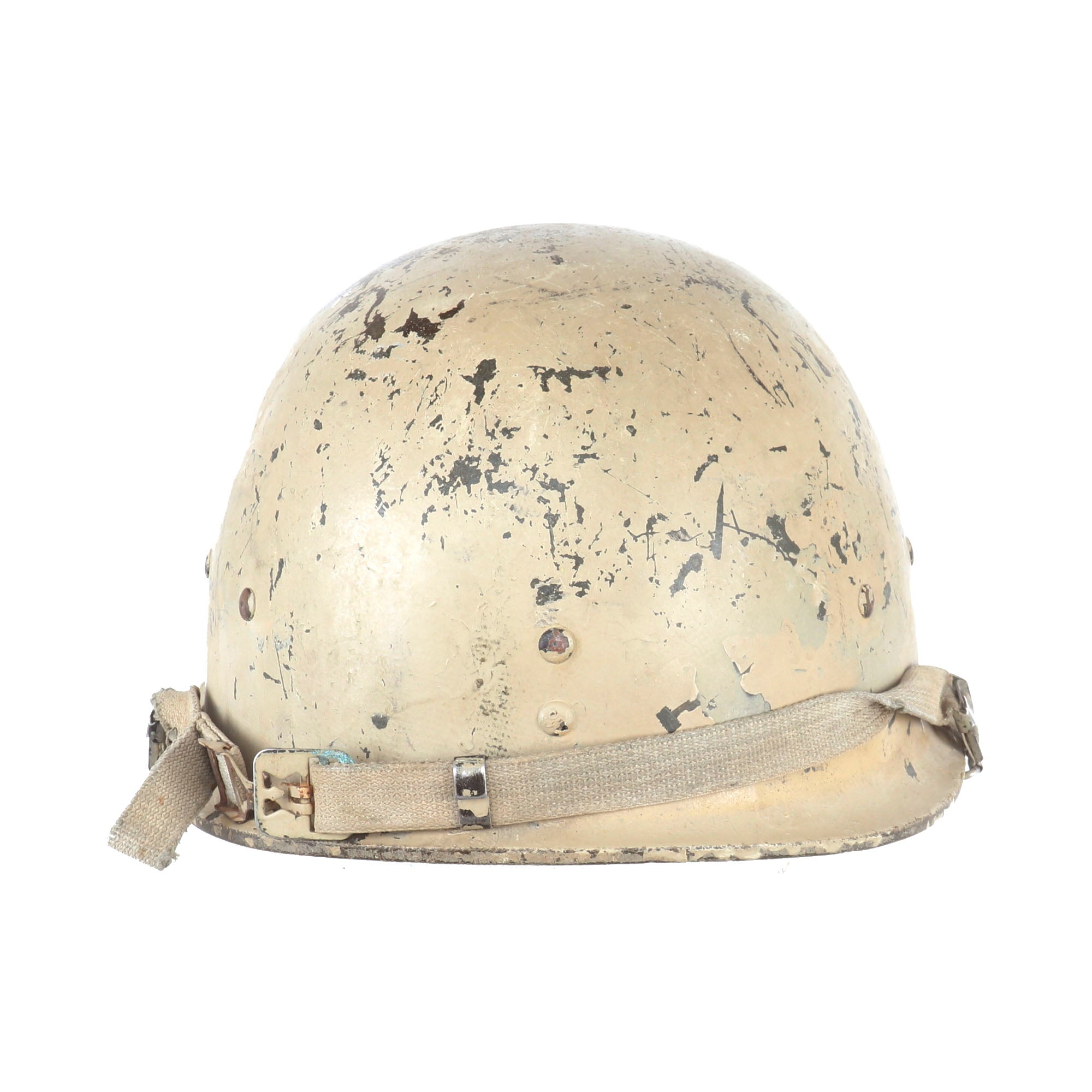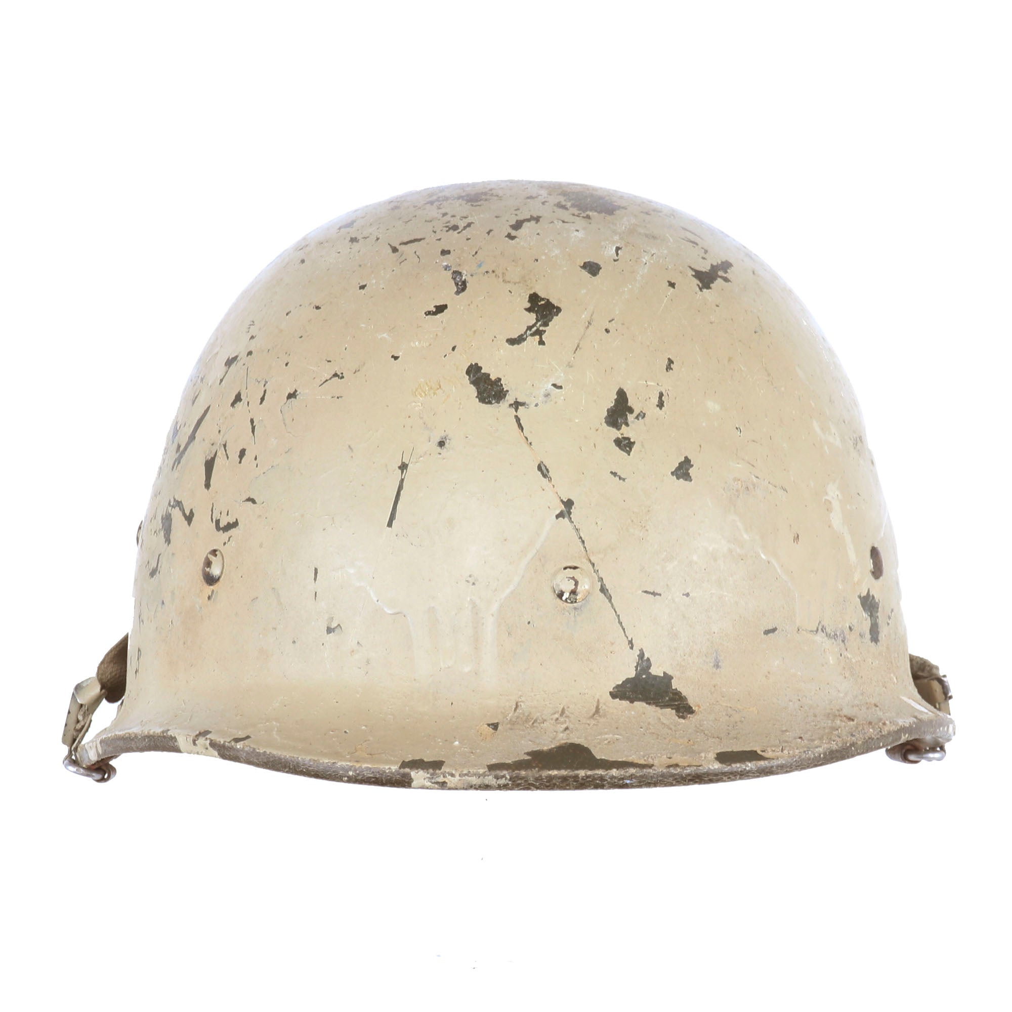 - M80 Iraqi Helmet with original liner and chinstrap. The sweatband is worn and chipping, and there are some faint markings on the suspension system.