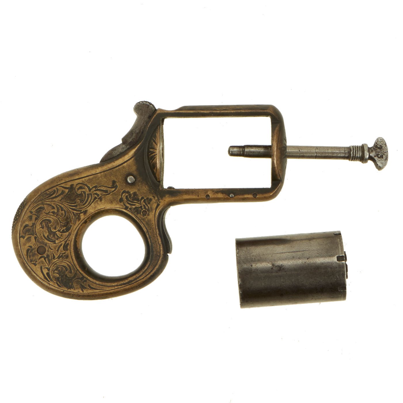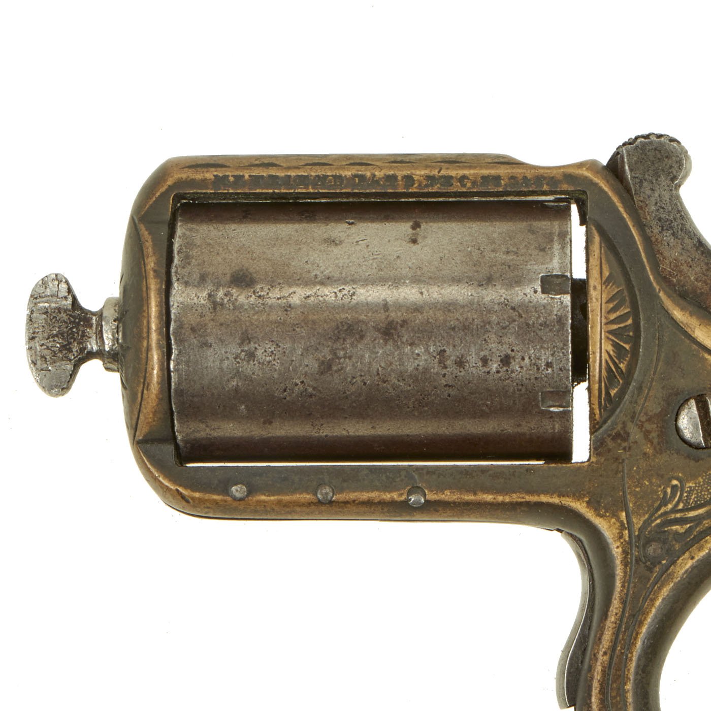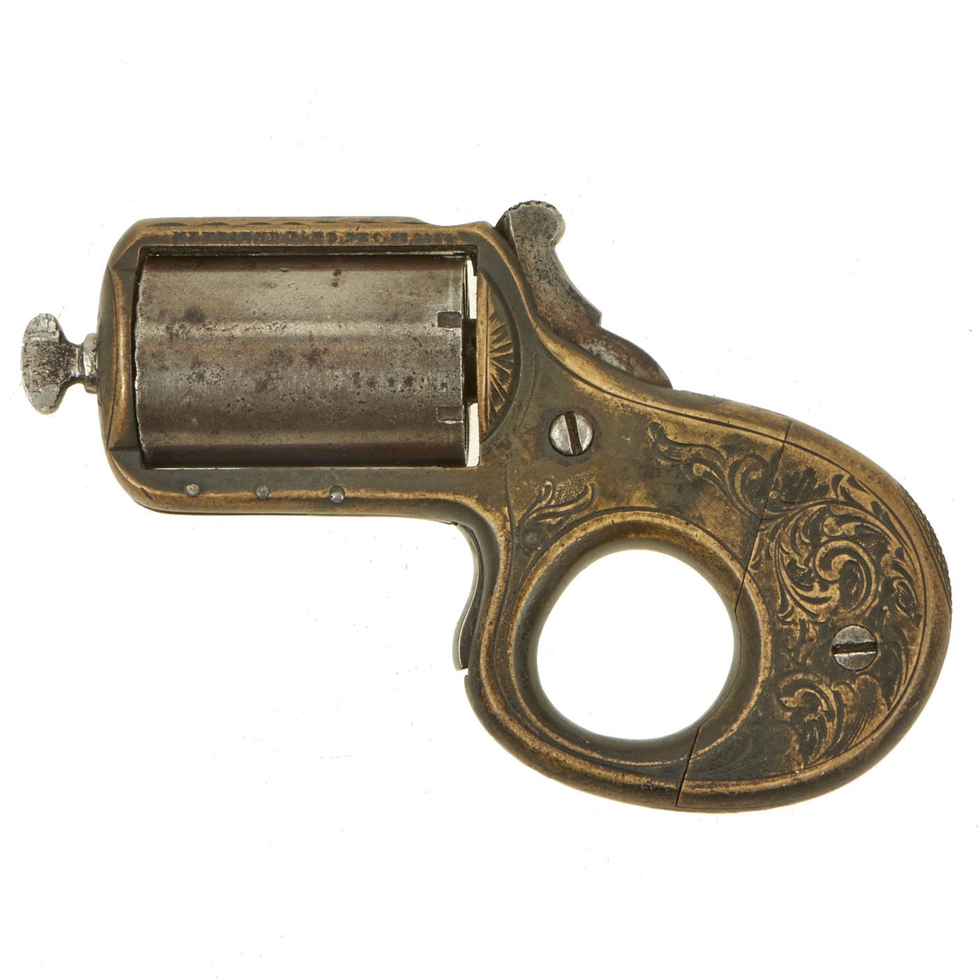 The concept was simple, this revolver carries SEVEN .22 caliber rimfire cartridges in the pepperbox style cylinder. However, it was also designed so that by adjusting how it was being held, it could be used as a knuckle duster for self defense. Most certain the name "MY FRIEND" became most appropriate. It is marked above the cylinder with: