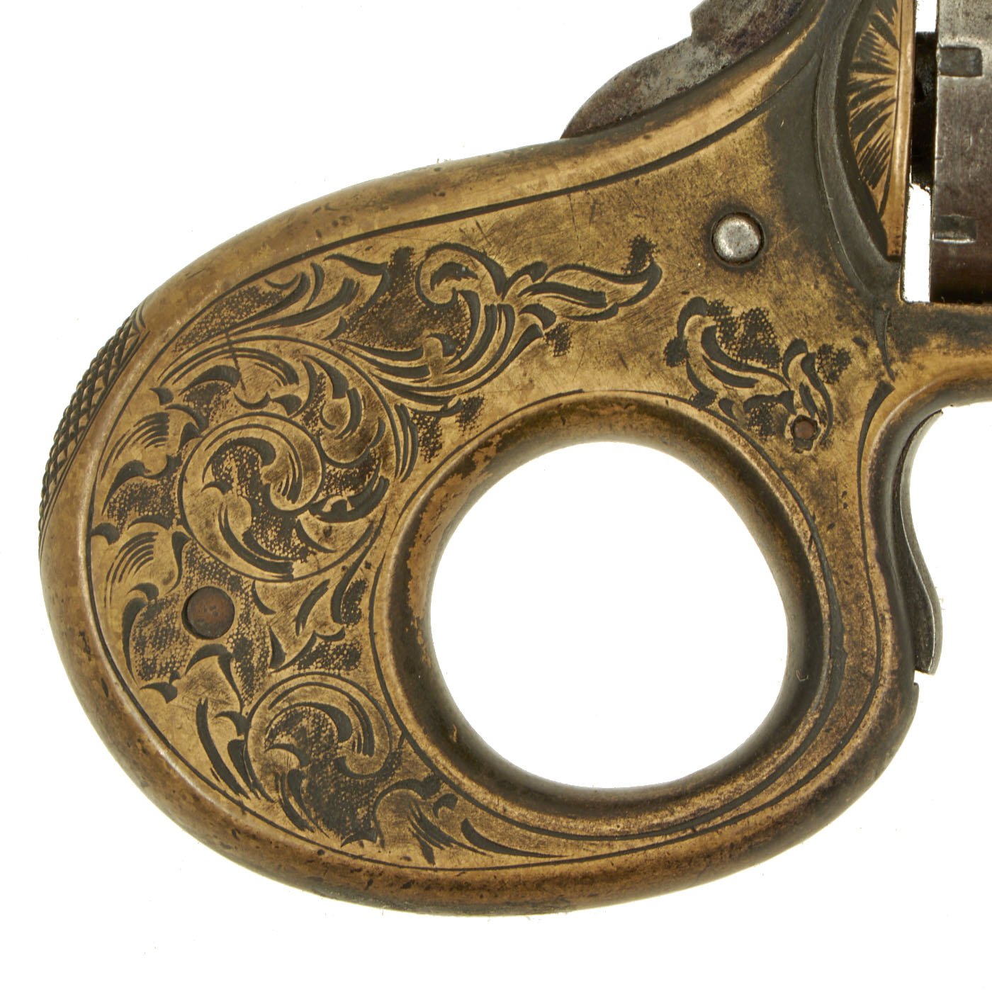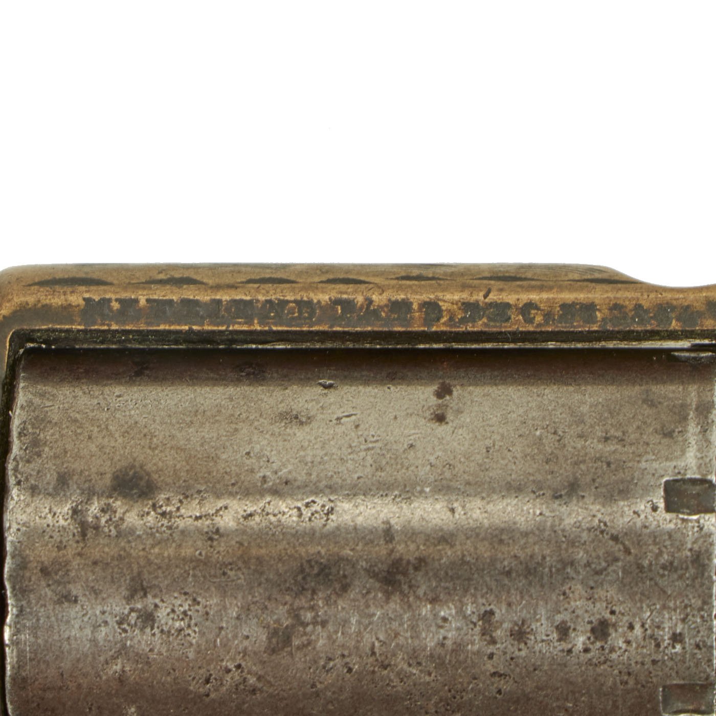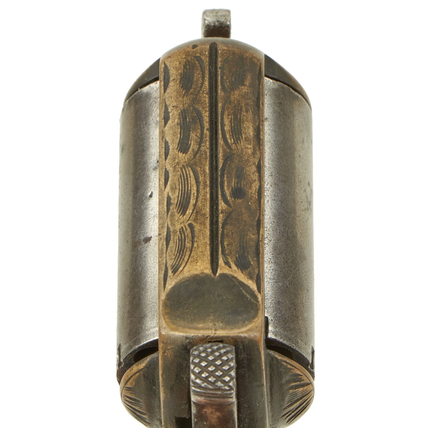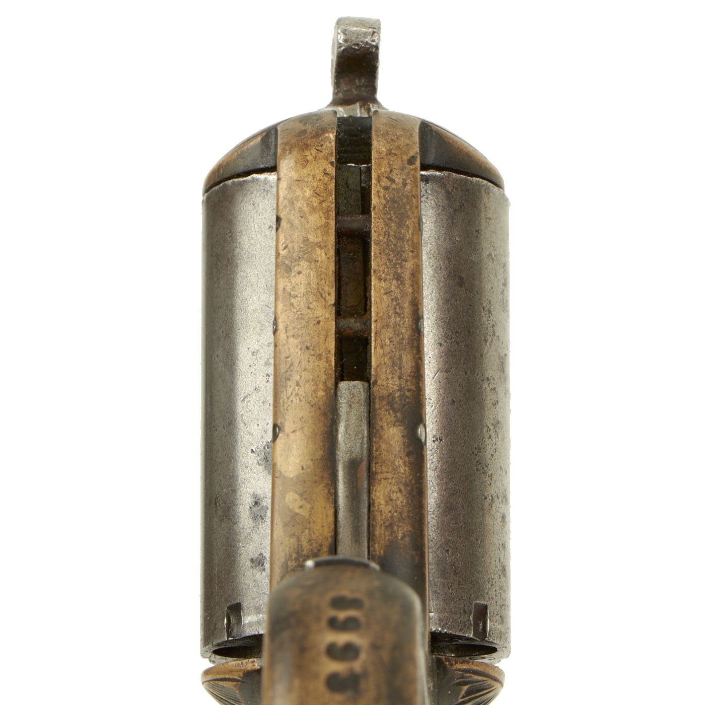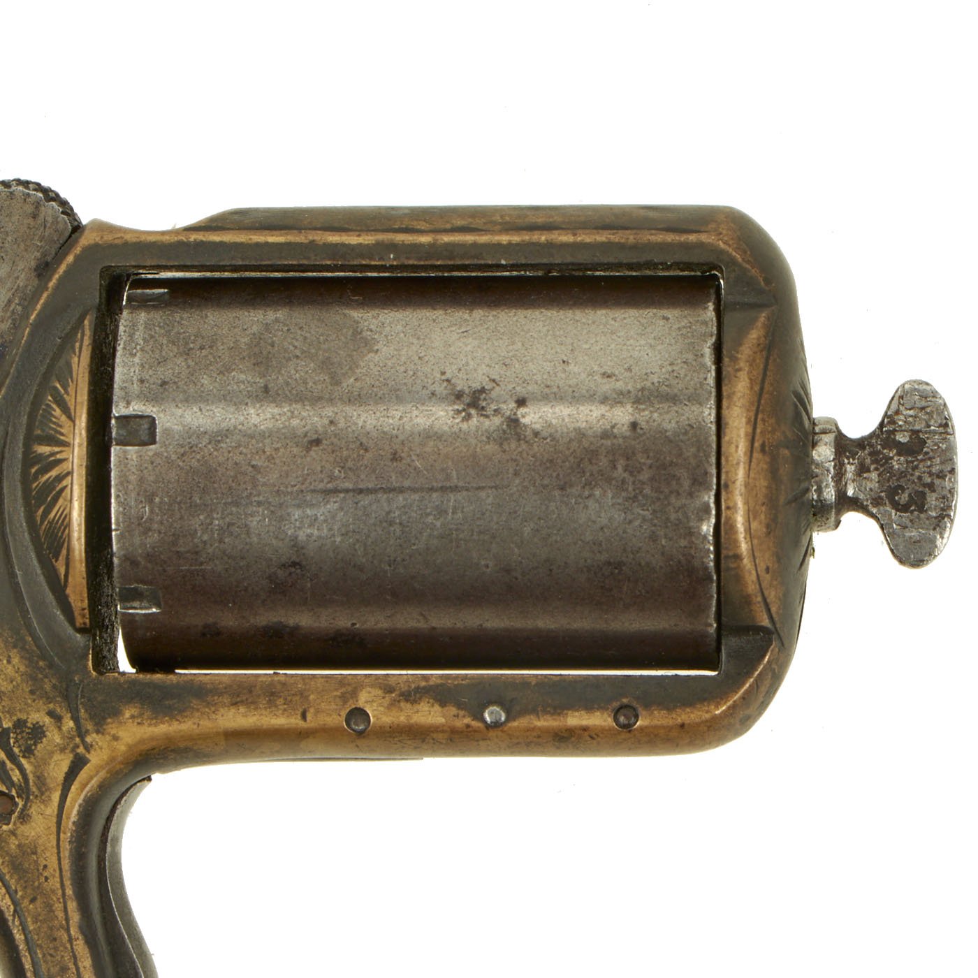 Our example, like many we see on the market, has lost almost all of the original nickel plating on the brass frame. There is dark patination in a lot of areas, possibly the remains of some plating, or just from oxidation and wear. It is in full working order as far as we can tell, and did not exhibit any finicky behavior when cycled. The cylinder removes easily for reloading and cleaning. There is some of the spring cover under the cylinder missing, though the retaining pins are still present. It bears serial number 8993 below the low profile trigger, while the back of the cylinder and end of the cylinder arbor pin are marked with shorter number 93.