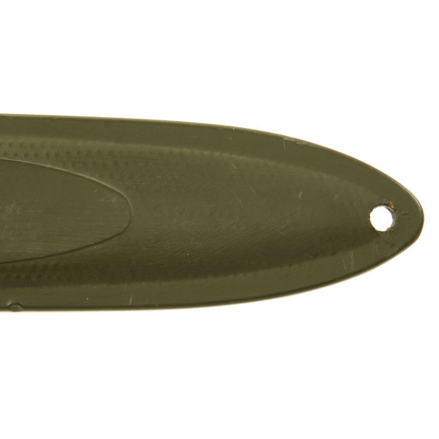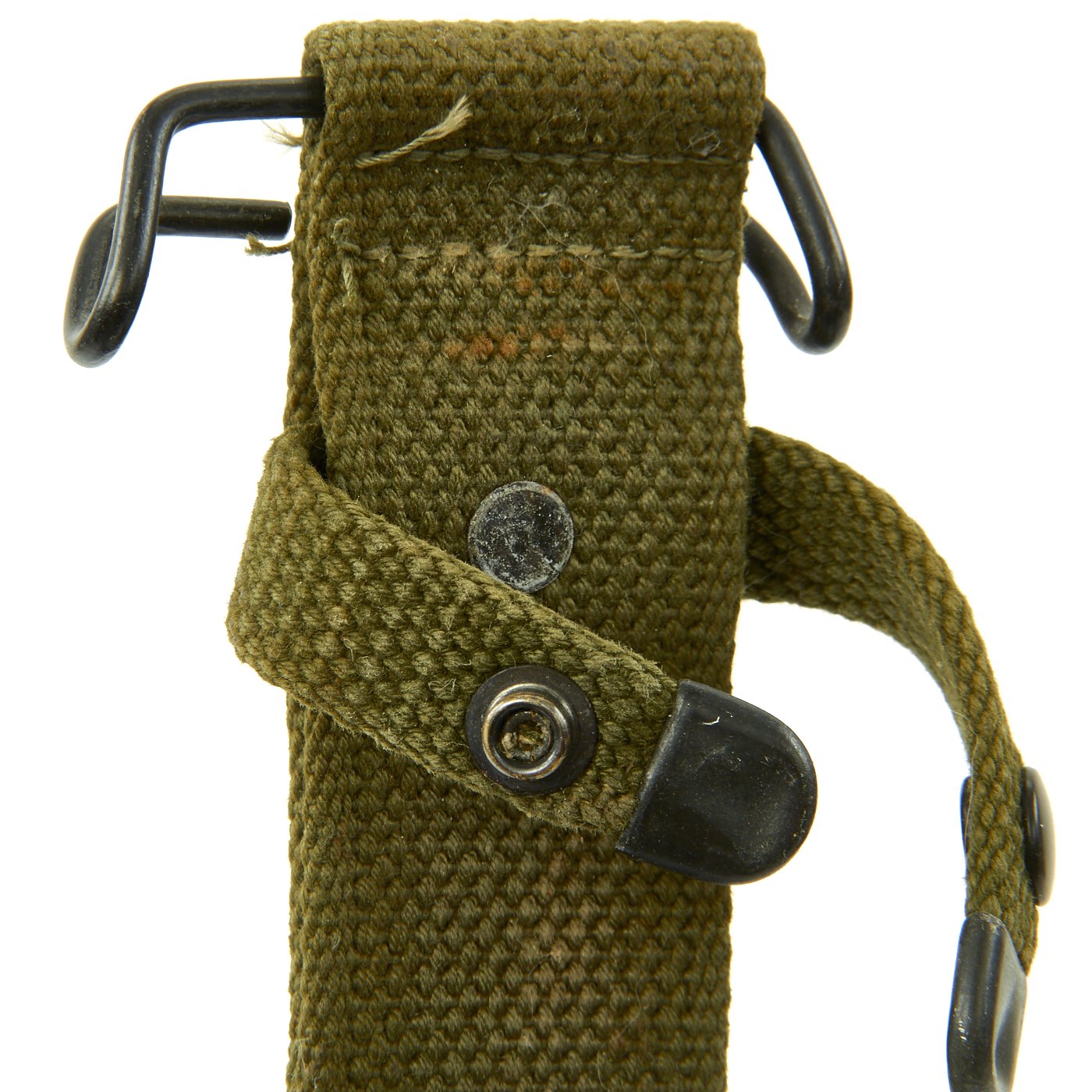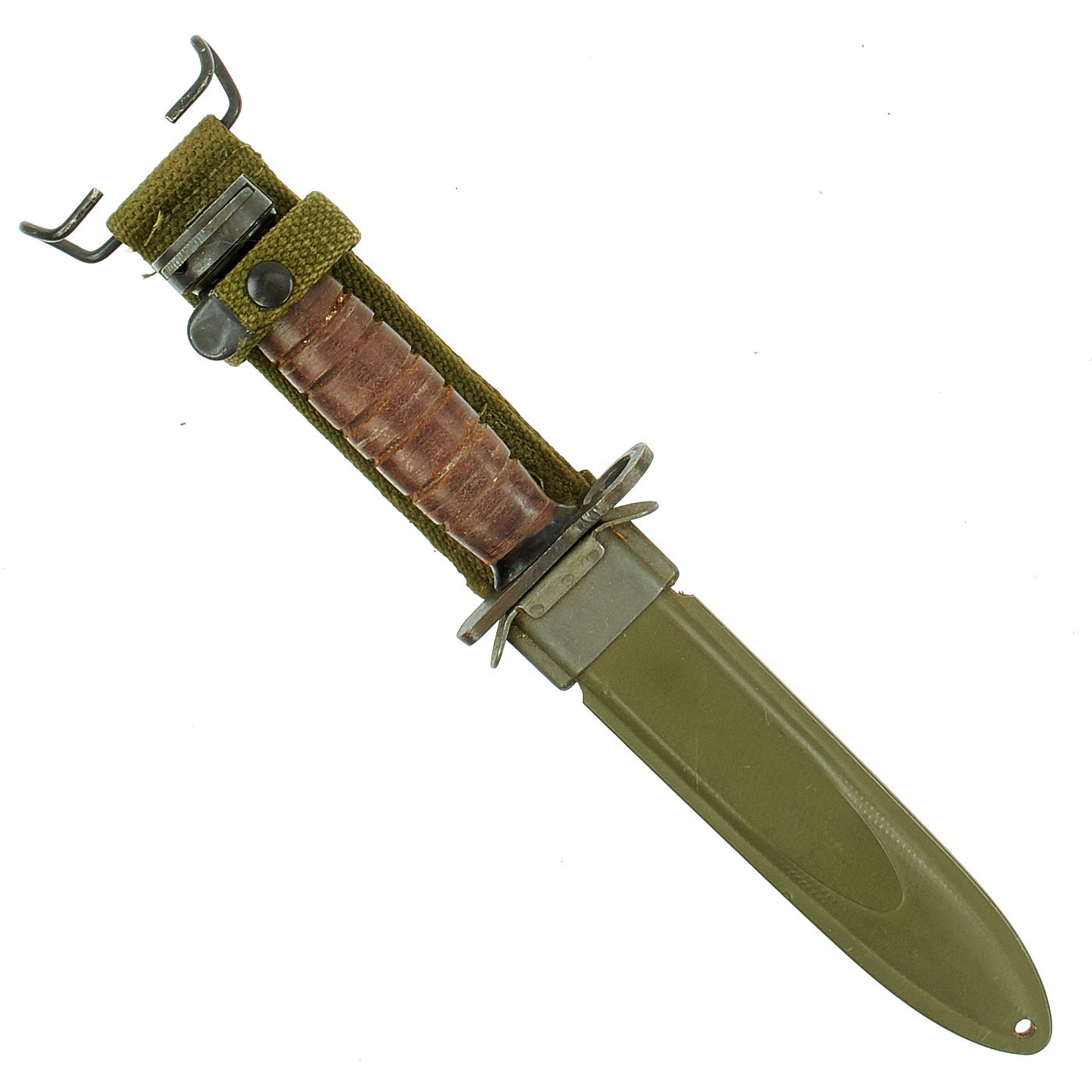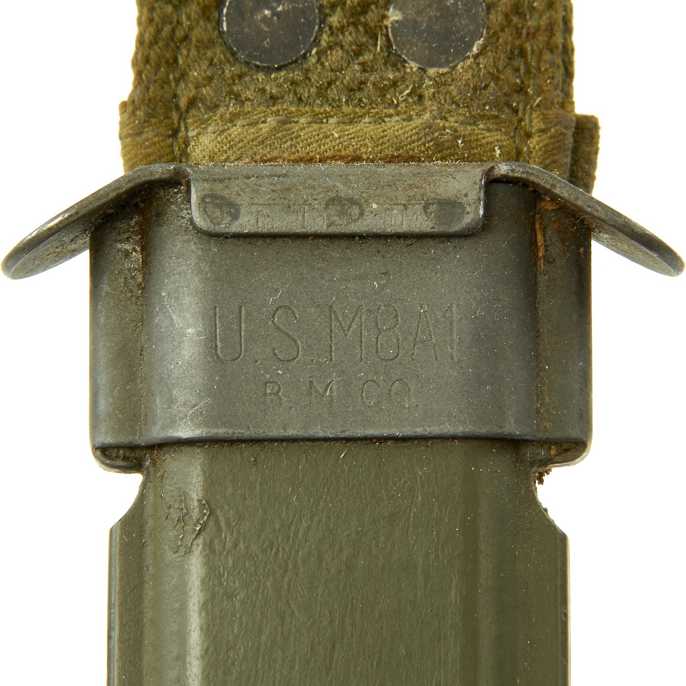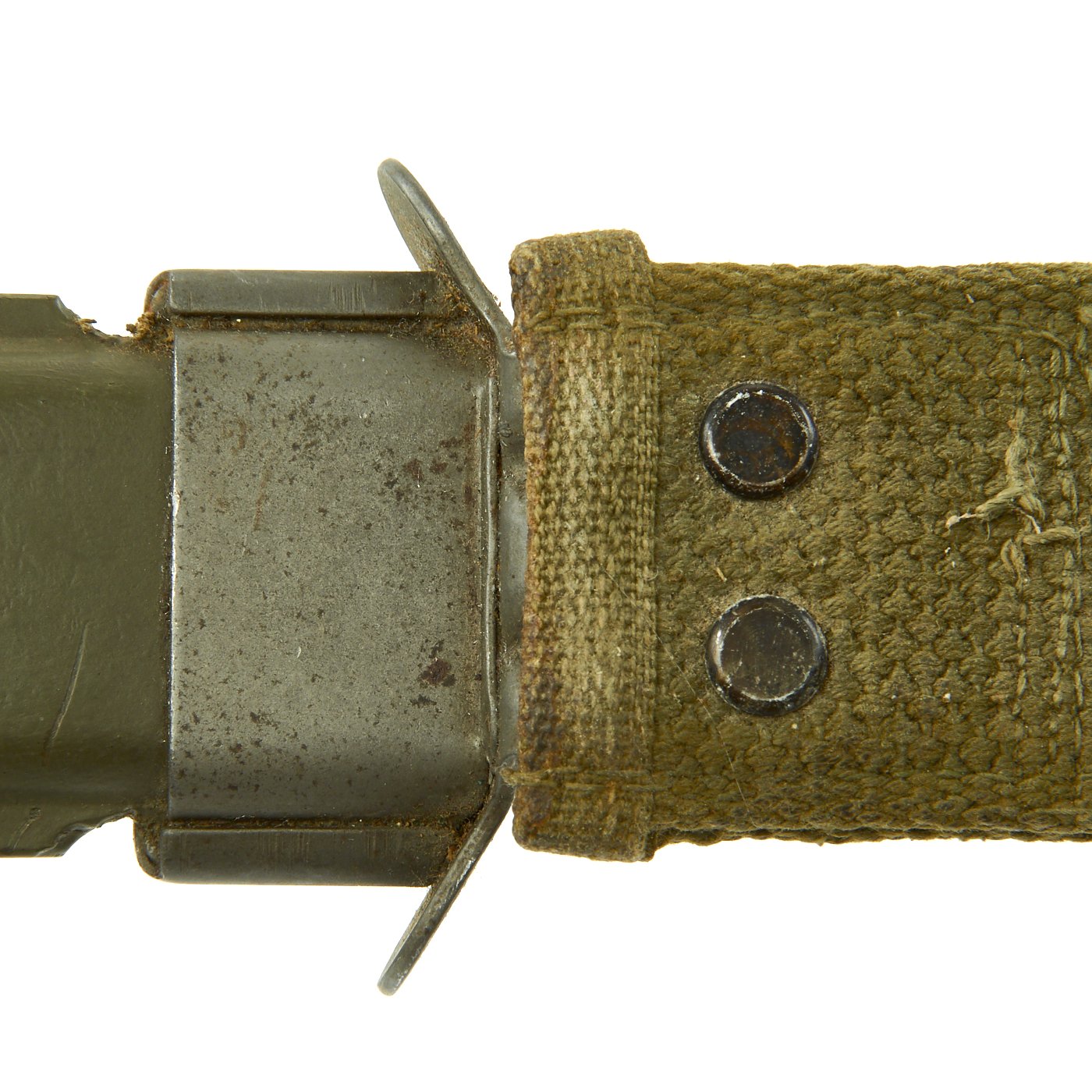 Comes with an OD green fiber scabbard marked U.S. M8A1 / B.M. CO. also in offered in very good condition. This design features a fiberglass body, metal throat, and canvas frog and securing strap with a steel pistol belt hook. The scabbard was manufactured by Beckwith Manufacturing Co, a division of Victory Plastics, whose stylized V P logo is also present on the scabbard body. The canvas is in great shape, as are the metal fittings and snap. The original parkerized finish on the throat is in very good condition.