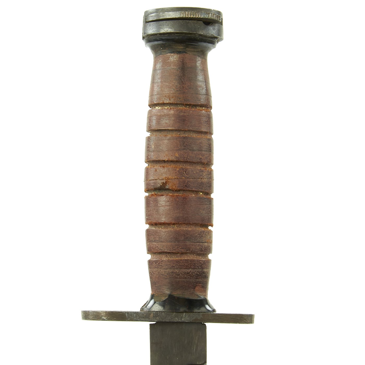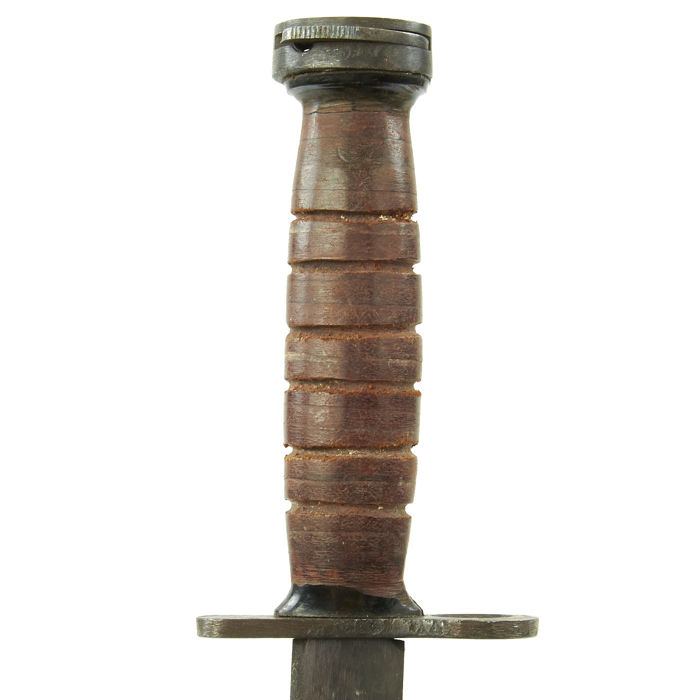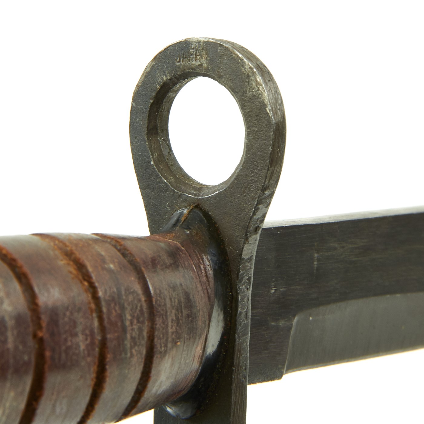Original Item: Only One Available. This is something rather interesting, which we have not had before. At first glance, we assumed this was a typical U.S. Made M4 bayonet, with a WWII Period stacked leather grip. However, it is not marked as it should be, so we assumed it was a Korean-made example. However further inspection showed a faint JAPAN stamped on the crossguard, so this is definitely a Japanese-Made M4 Bayonet for the M1 and M2 carbine, made by Kiffe in Japan. This is basically a copy of the U.S. WWII M4 bayonet, with the stacked leather grip and plastic end spacers, though without the holes in the bottom plastic piece to punch out the pins for the latch. It also does not have the starburst peened tang.