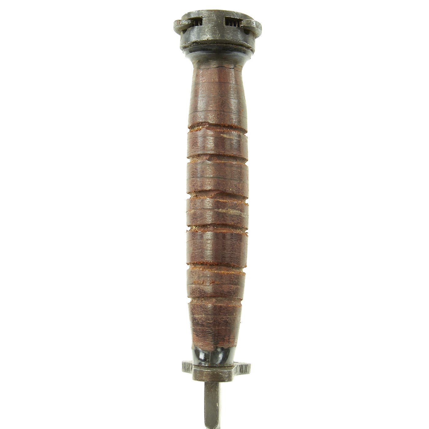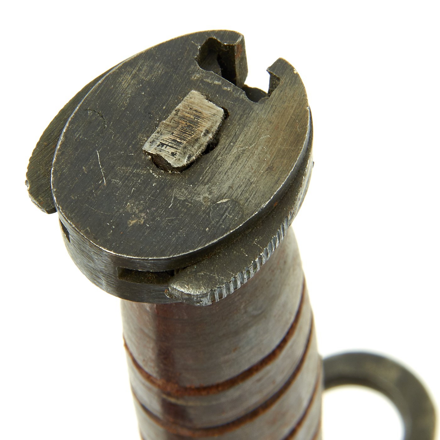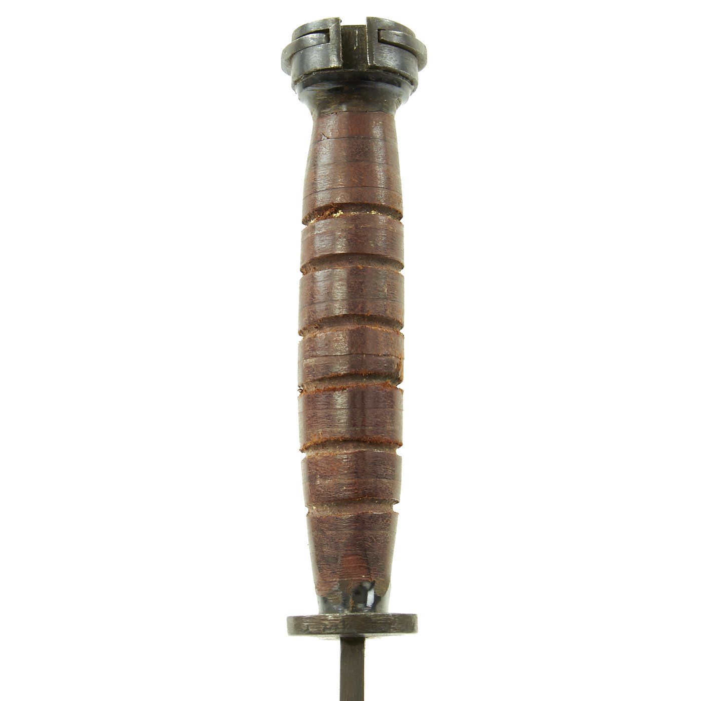 Original Item: Only One Available. This is something rather interesting, which we have not had before. At first glance, we assumed this was a typical U.S. Made M4 bayonet, with a WWII Period stacked leather grip. However, it is not marked as it should be, so we assumed it was a Korean-made example. However further inspection showed a faint JAPAN stamped on the crossguard, so this is definitely a Japanese-Made M4 Bayonet for the M1 and M2 carbine, made by Kiffe in Japan. This is basically a copy of the U.S. WWII M4 bayonet, with the stacked leather grip and plastic end spacers, though without the holes in the bottom plastic piece to punch out the pins for the latch. It also does not have the starburst peened tang.