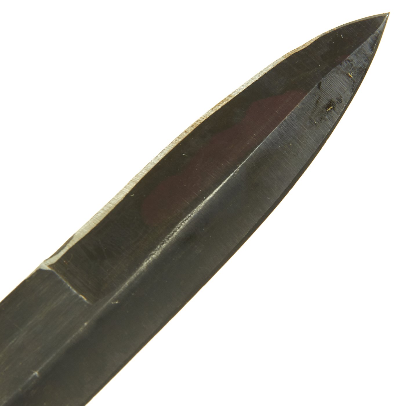These are generally considered to be of good construction, but definitely not as collectible as the U.S. made versions. These were originally produced to meet the demand for bayonet when many M1 Carbines were released from surplus. This one is still in great shape, with a nice blued body and factory lower edge. The upper edge has been sharpened somewhat. The pommel lock works fine, and it's altogether solid, though the crossguard wiggles a tiny bit.