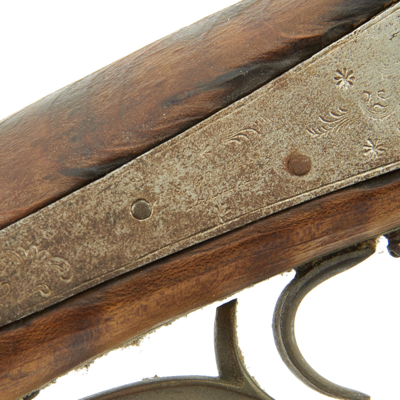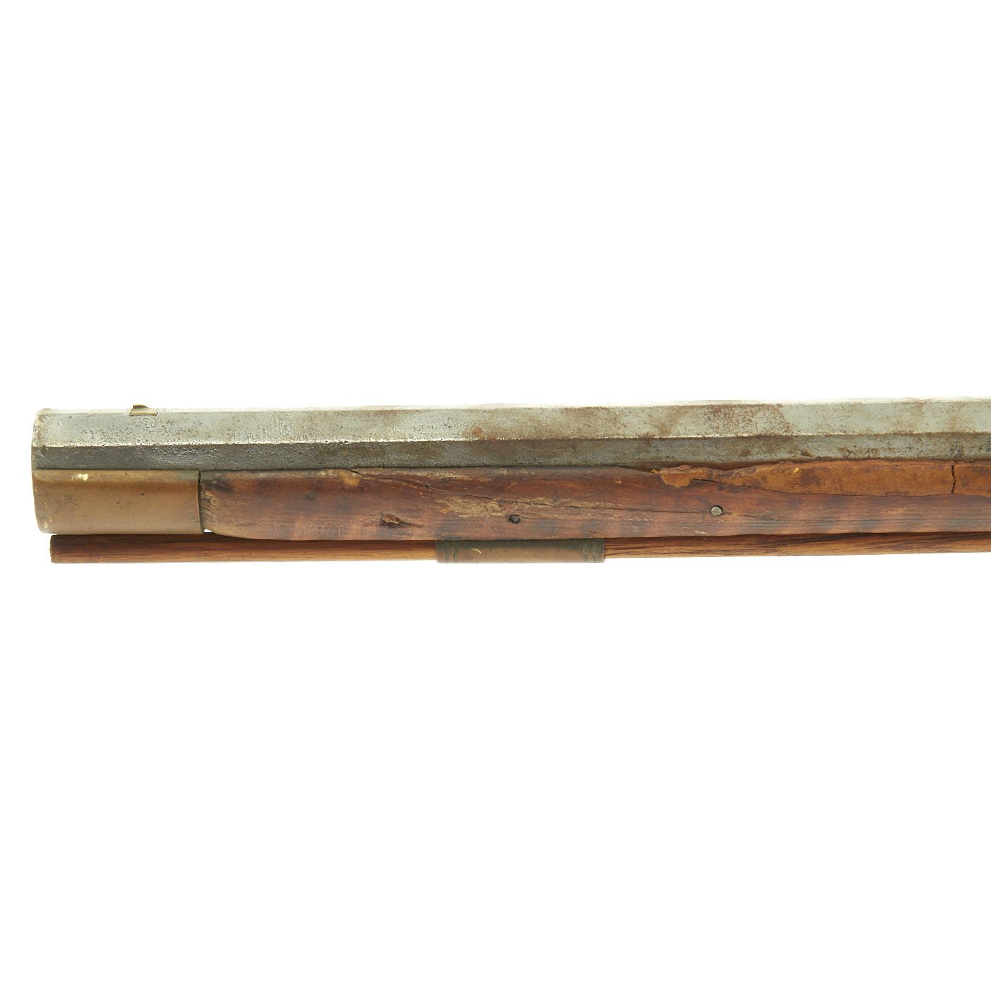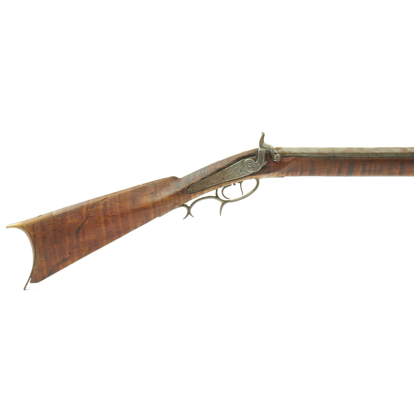 Original Item: Only one available. Here is an octagonal barreled "Kentucky" style rifle, which more correctly is known as a Pennsylvania Rifle. It is in the standard caliber we usually see these in, .39", and has a very heavy barrel. The rifle was built in the United States using a percussion lock made by James Golcher of Philadelphia, who operated in the 1820s - 1830s. It is marked JAs GOLCHER / PHILADA amidst traces of foliate engravings.