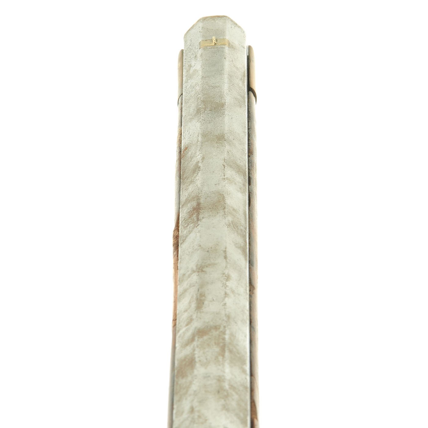 The stock is made from beautiful Tiger Maple with very distinctive stripes, and is full stocked, though the front stock was added as a separate piece. The mounts are all brass, including a somewhat ornate trigger guard, with multiple spurs for a very secure grip.