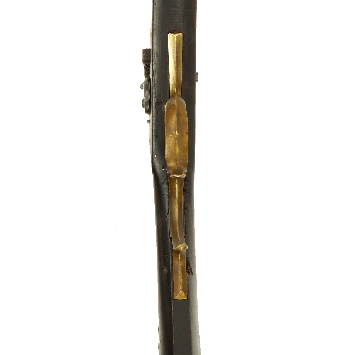 The full length stock looks to be made of walnut, with a dark finish. There are some repairs to the stock, particularly around wrist area, going up on the left side to the lock screw. While popular and attractive, the highly curved stocks also put a lot of stress on the wood, which was prone to breaking. This rifle looks to have seen its fair share of use, and probably broke during use, or possibly just from being dropped on the butt stock.