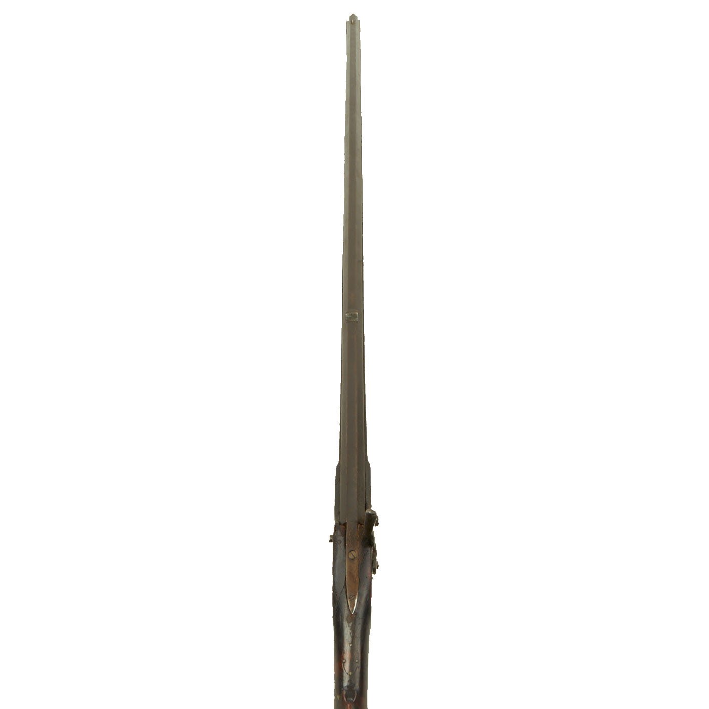 The bore shows clear rifling, but also oxidation and fouling. Based on the amount of powder burn around the lock, the rifle was used quite a bit. The rifle also still has both front and rear sights, and a ramrod, though it is just for display.