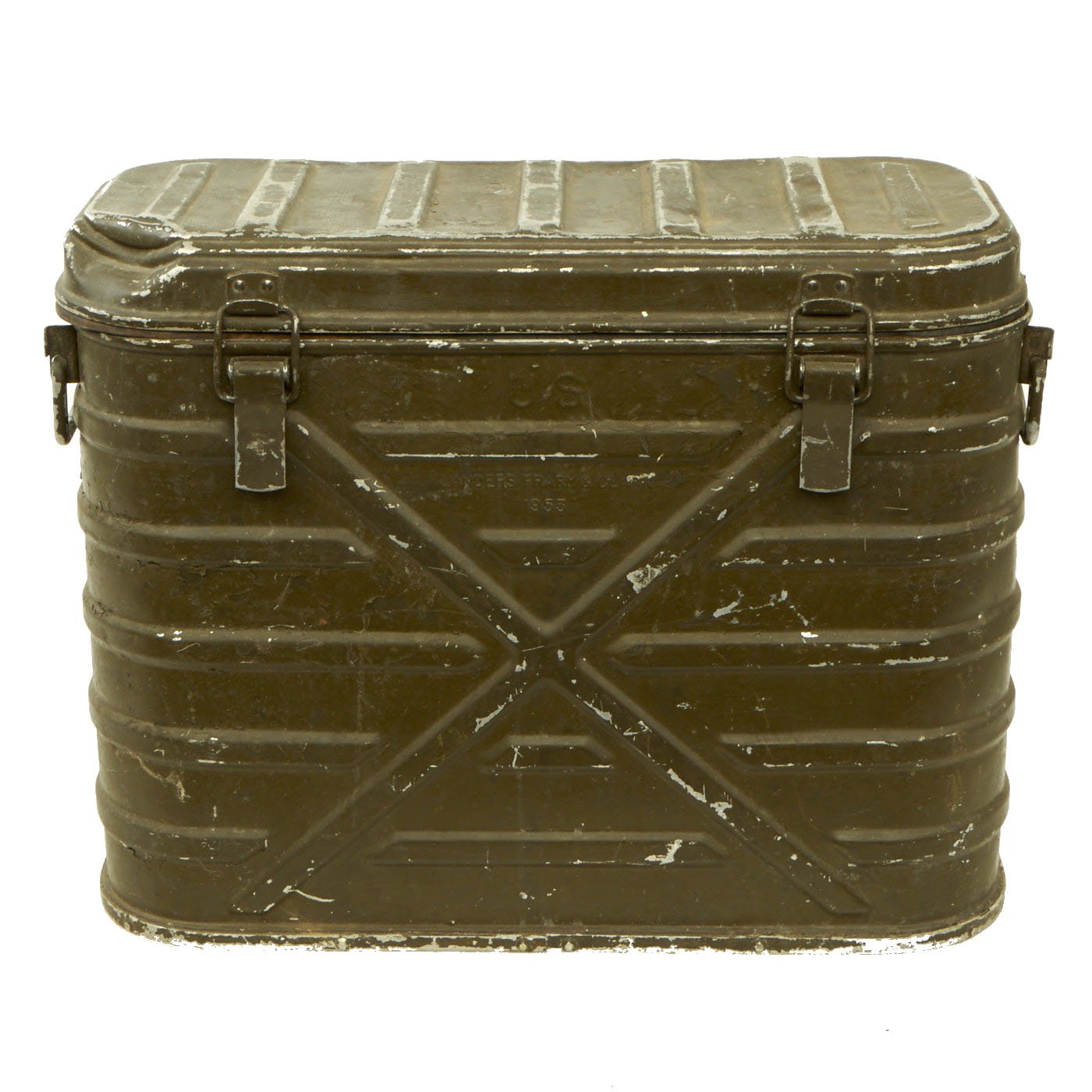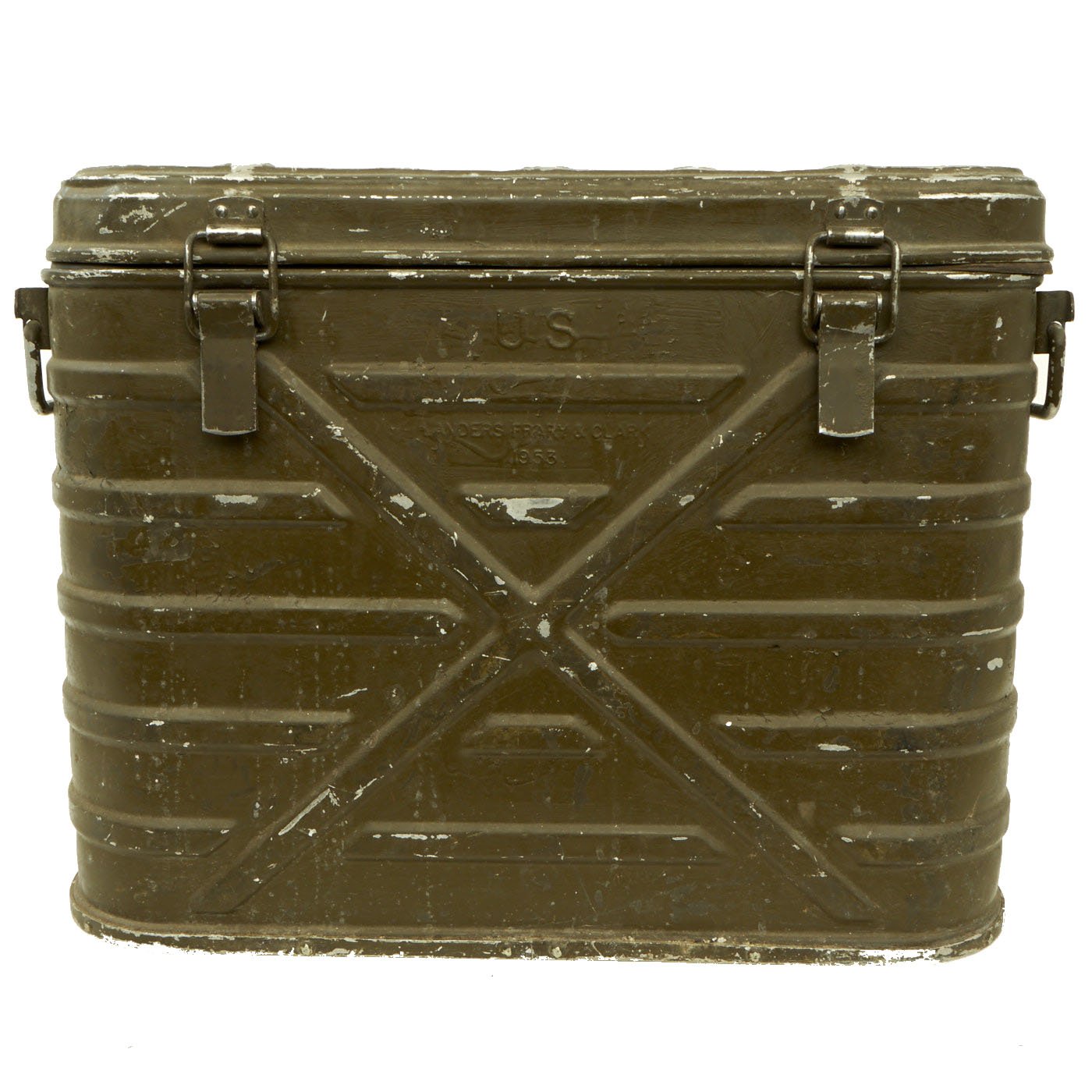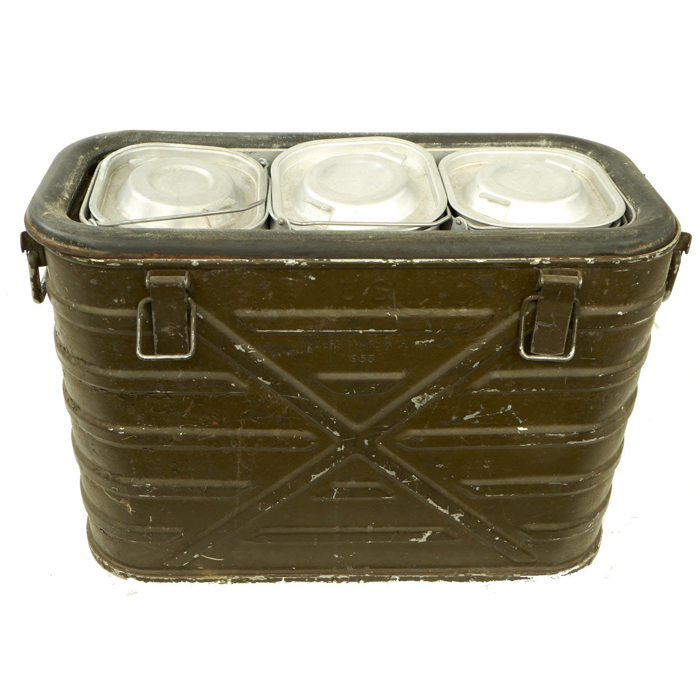 Highly insulated unit is made for military use in order to keep food or fluids hot or cold, it's a very effect system and can keep ice frozen for days. The outer container itself measures 20 1/2"W x 15 3/4"H x9 3/4"D. It is maker marked on the side by LANDERS, FRARY & CLARK over a 1953 production date. The individual containers are all dated 1953 as well.