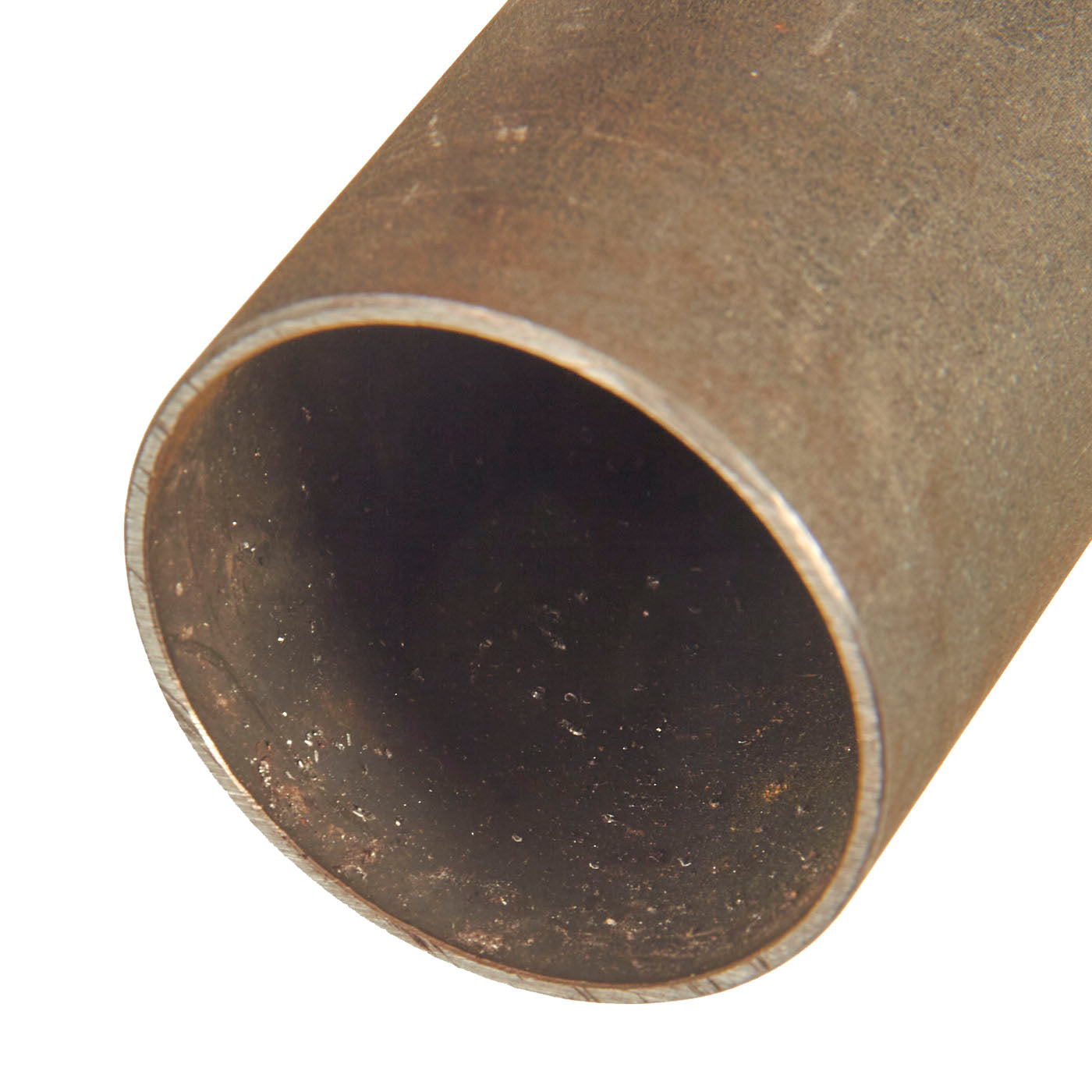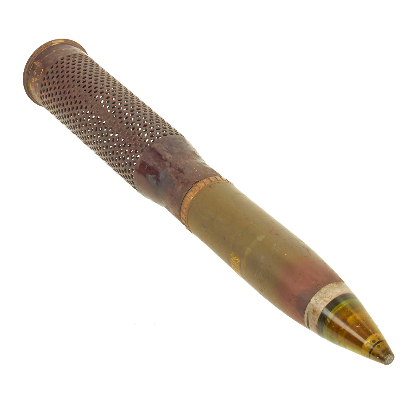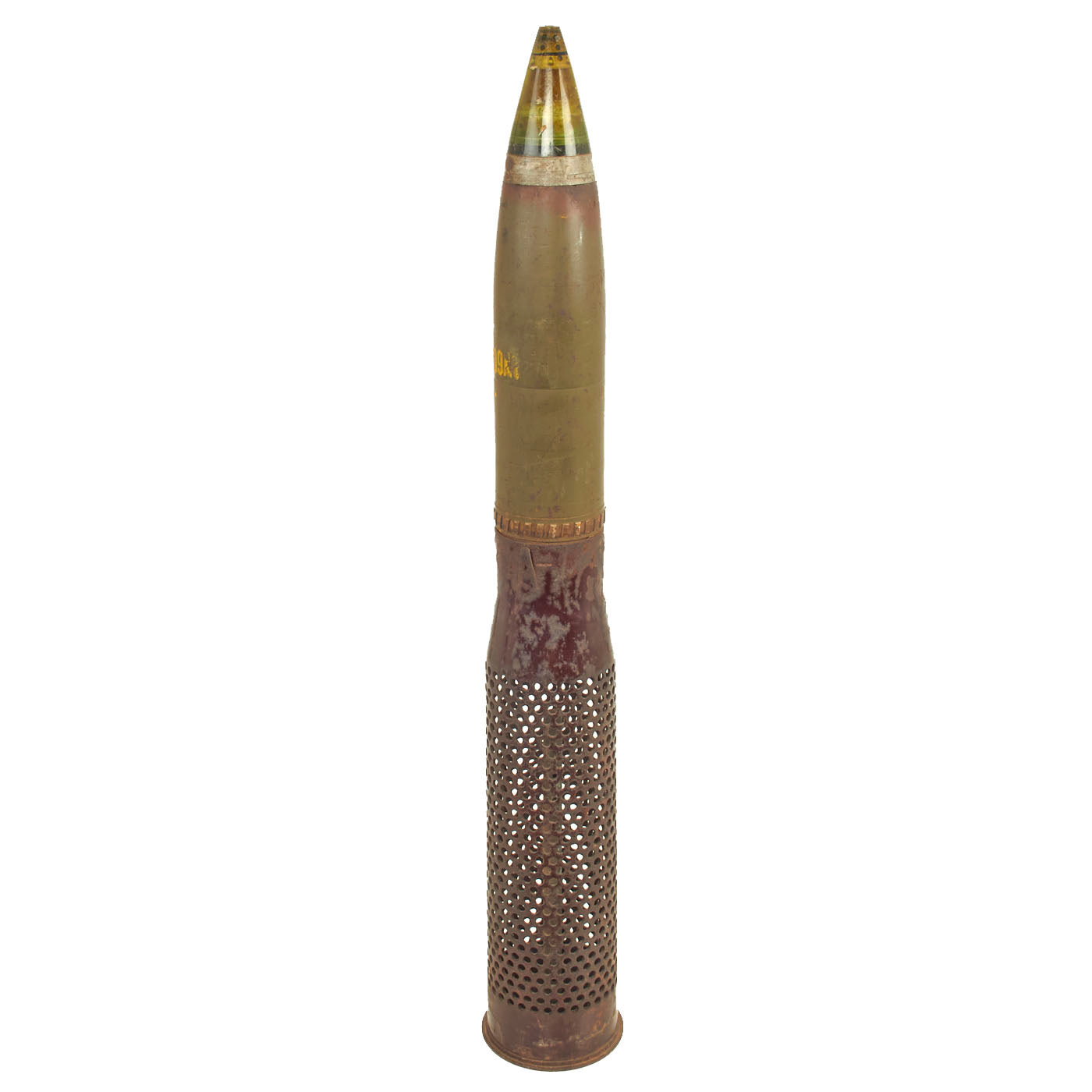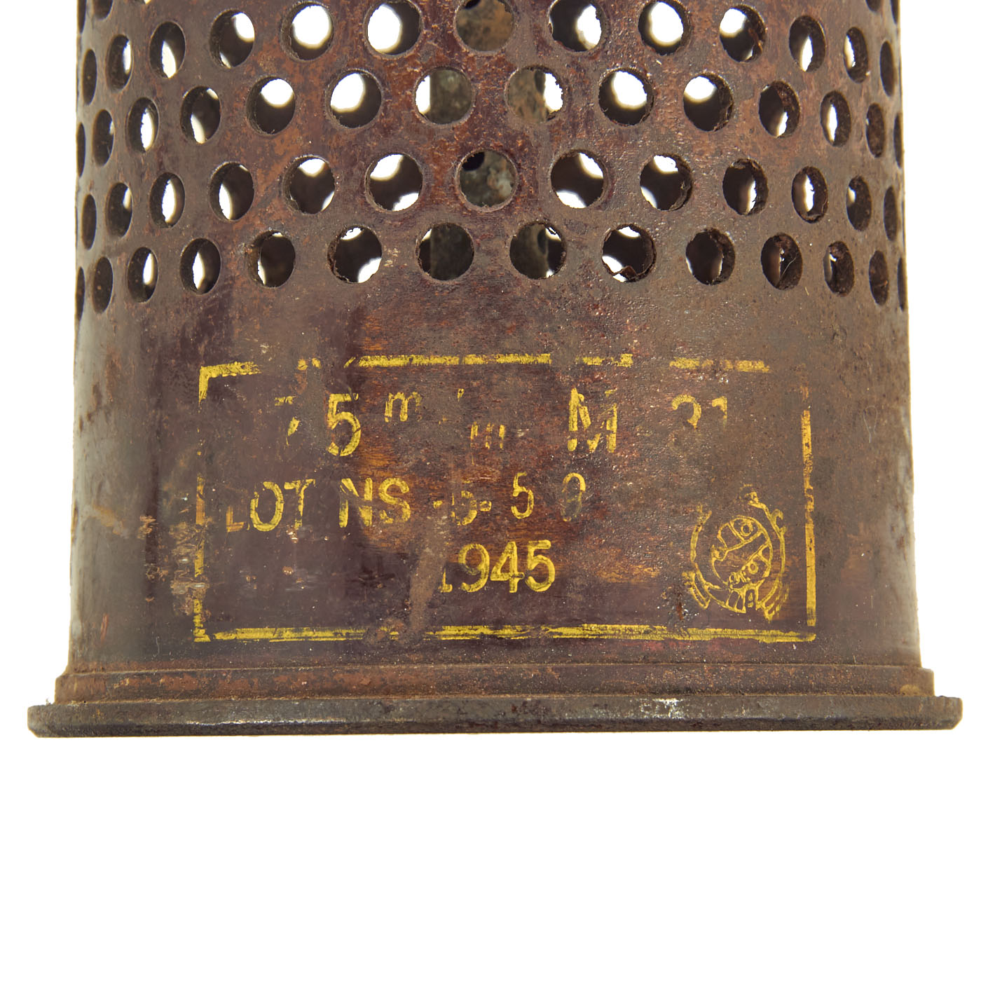 The condition is quite nice with much of the paint retained on the exterior, and the original plastic resin housed fuze still unscrews so that the interior can be examined. The shell is fitted into the correct lacquered steel perforated 75mm shell casing, which still has a partial yellow stamped paint marking. It shows the U.S. Ordnance "crossed cannons" cartouche and a 1945 date. The shell casings were often re-used, and this example still has the internal detonator tube that helps spread the ignition charge through the propellant.