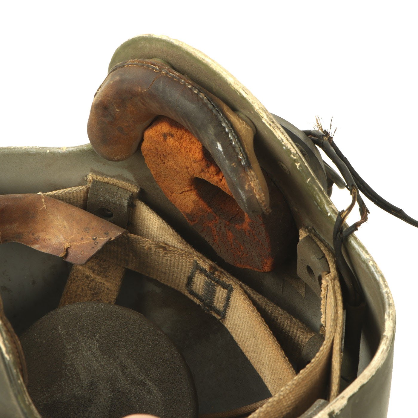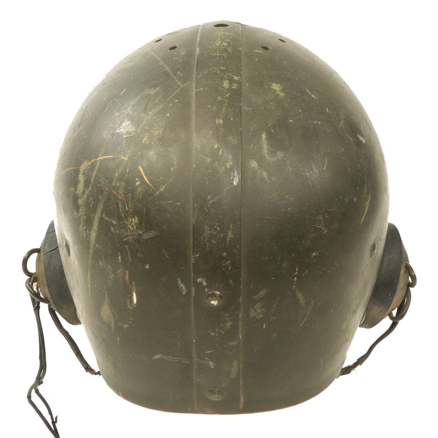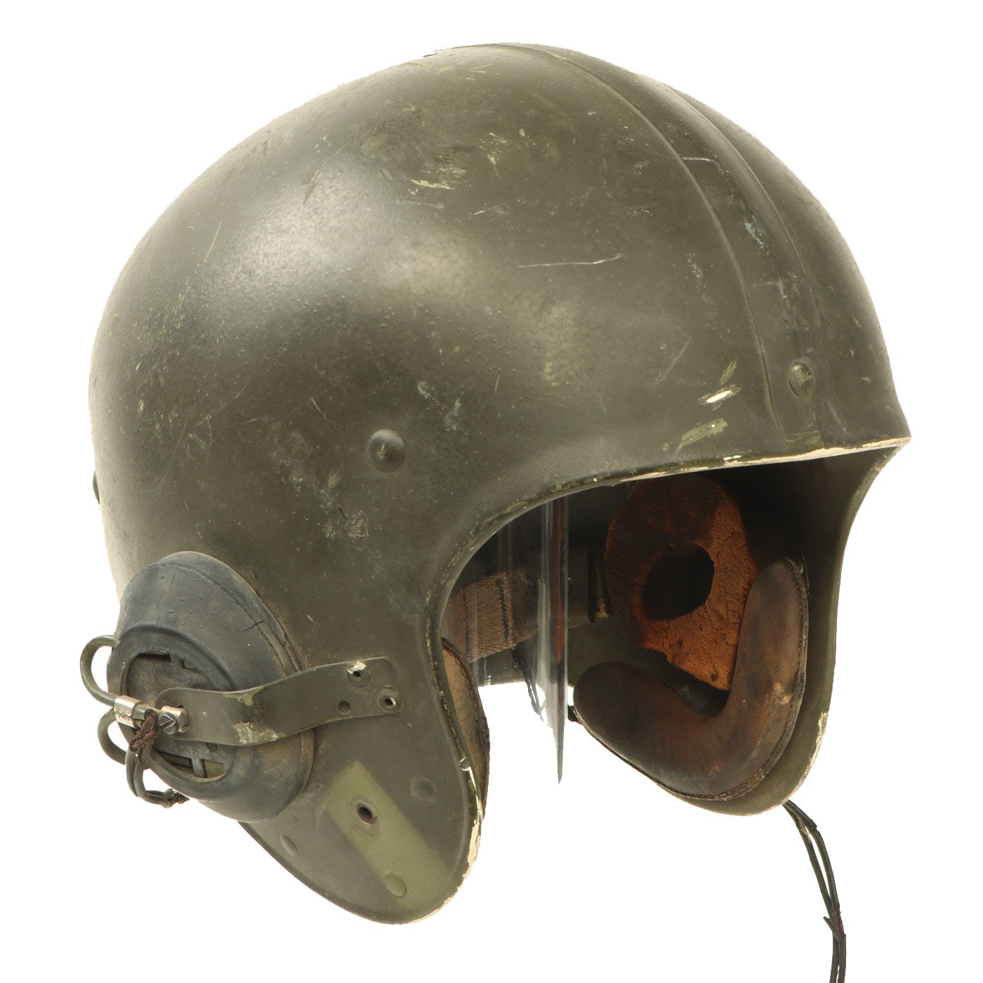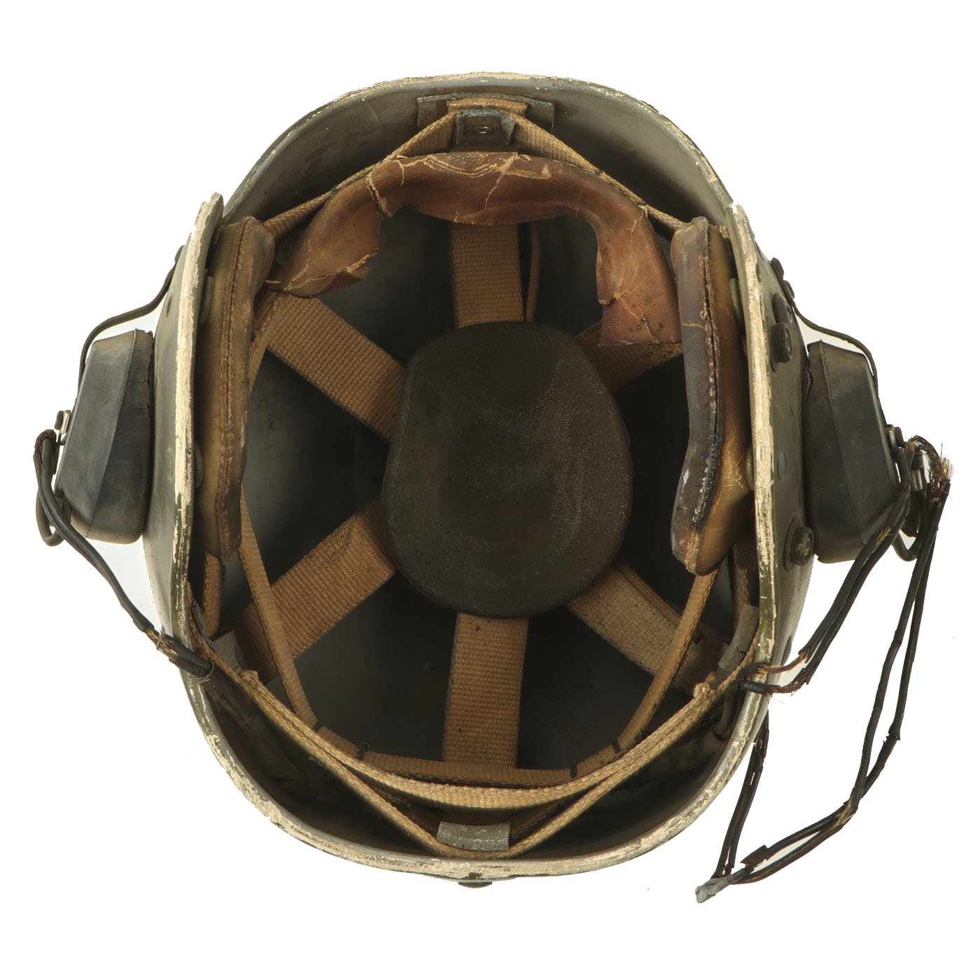 Original Item: Only One Available. This is a 1950s Korean War Era Armored Vehicle & Tanker Helmet, most likely manufactured by Riddell, but the label is under one of the glued on pads. Like most of the early tanker helmets after WWII, the design is very similar to the football helmets of the time. This example features complete rigging on the inside, with a mostly intact crown pad, though it is torn where it goes through the center ring of the rigging.