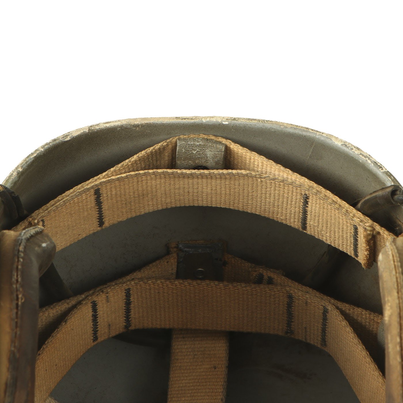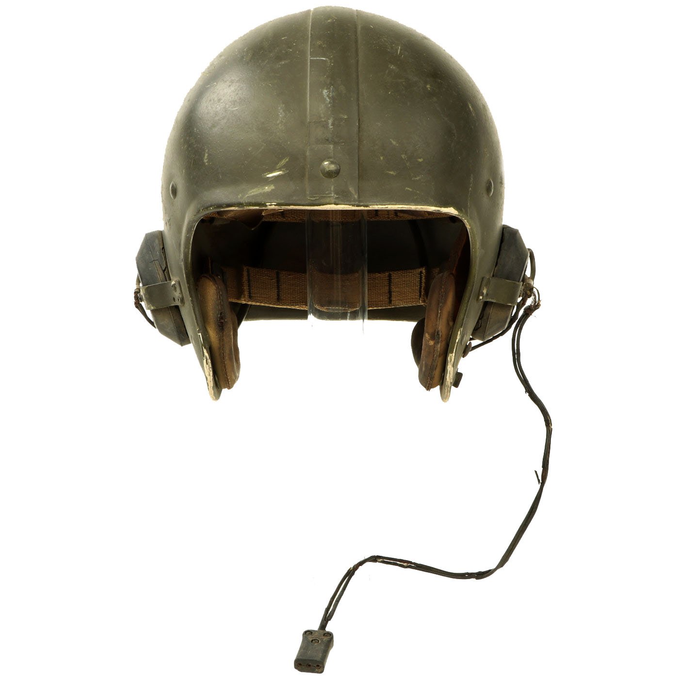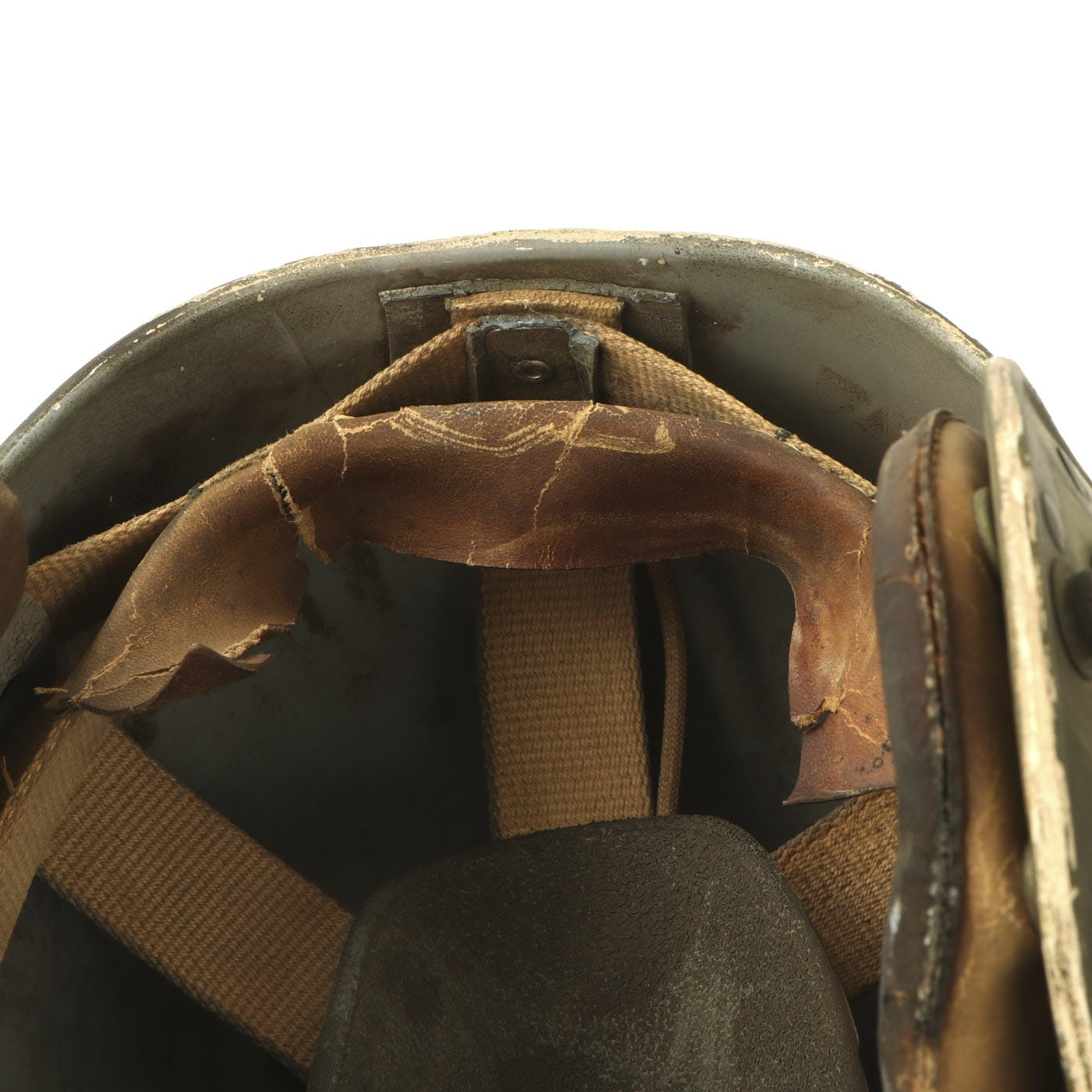 Original Item: Only One Available. This is a 1950s Korean War Era Armored Vehicle & Tanker Helmet, most likely manufactured by Riddell, but the label is under one of the glued on pads. Like most of the early tanker helmets after WWII, the design is very similar to the football helmets of the time. This example features complete rigging on the inside, with a mostly intact crown pad, though it is torn where it goes through the center ring of the rigging.