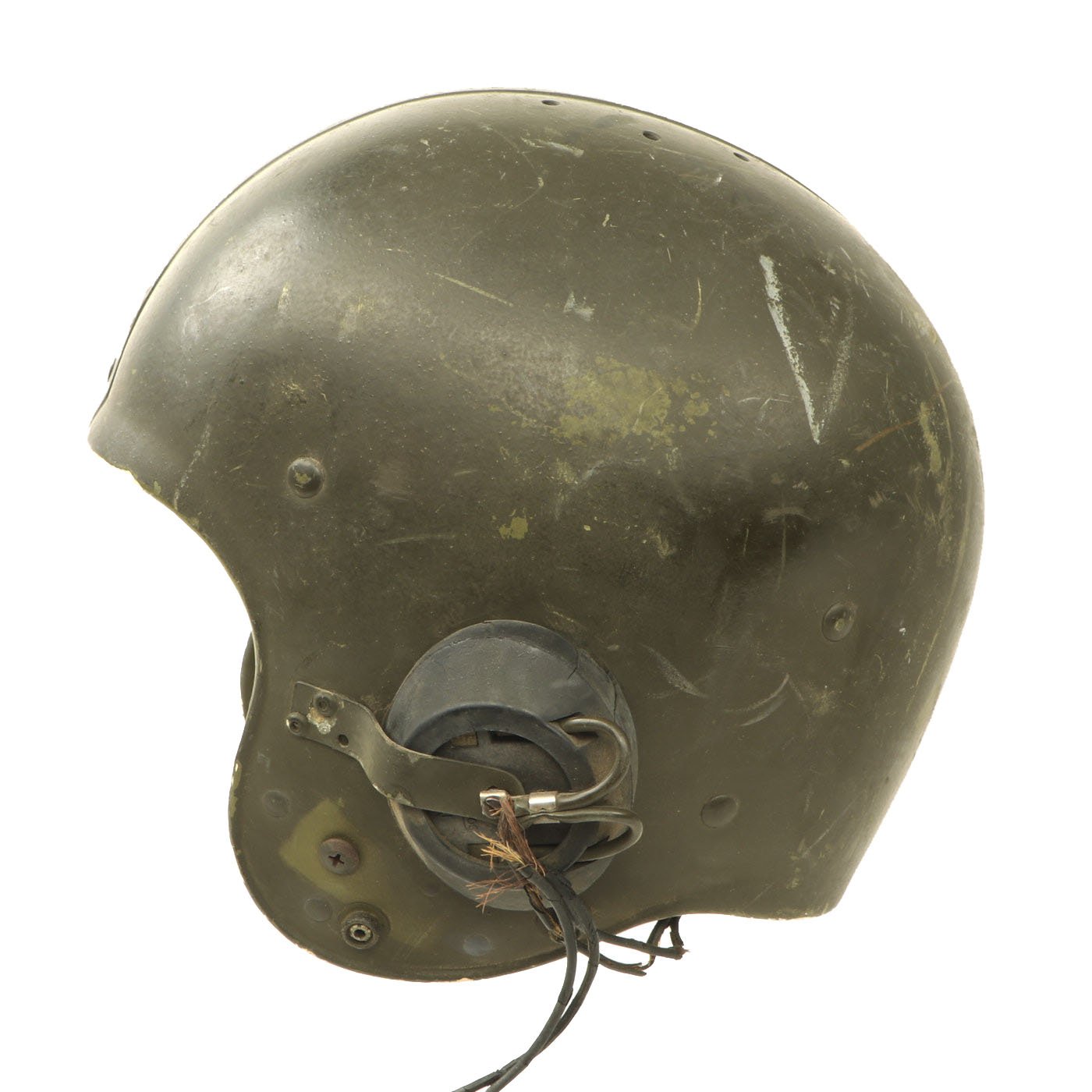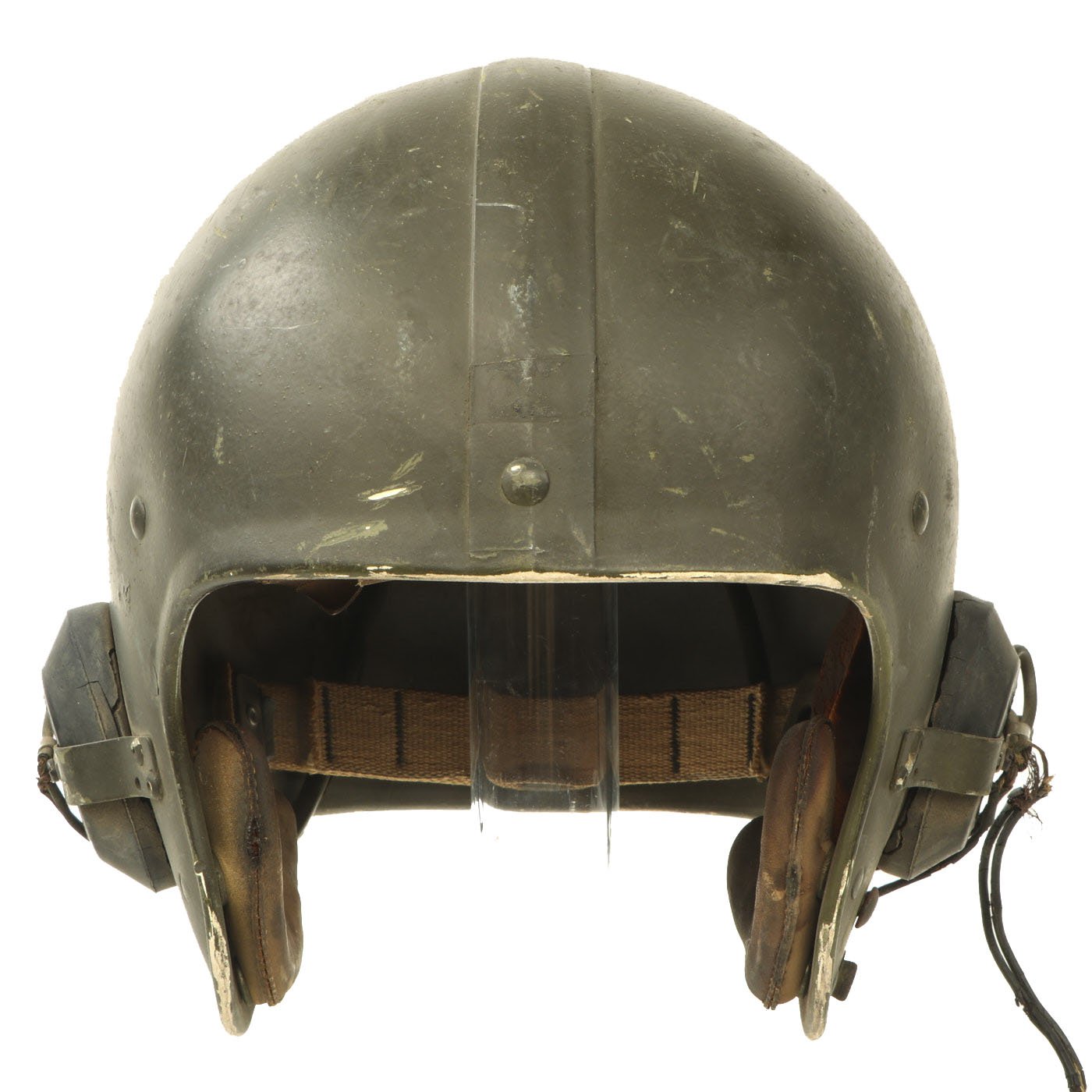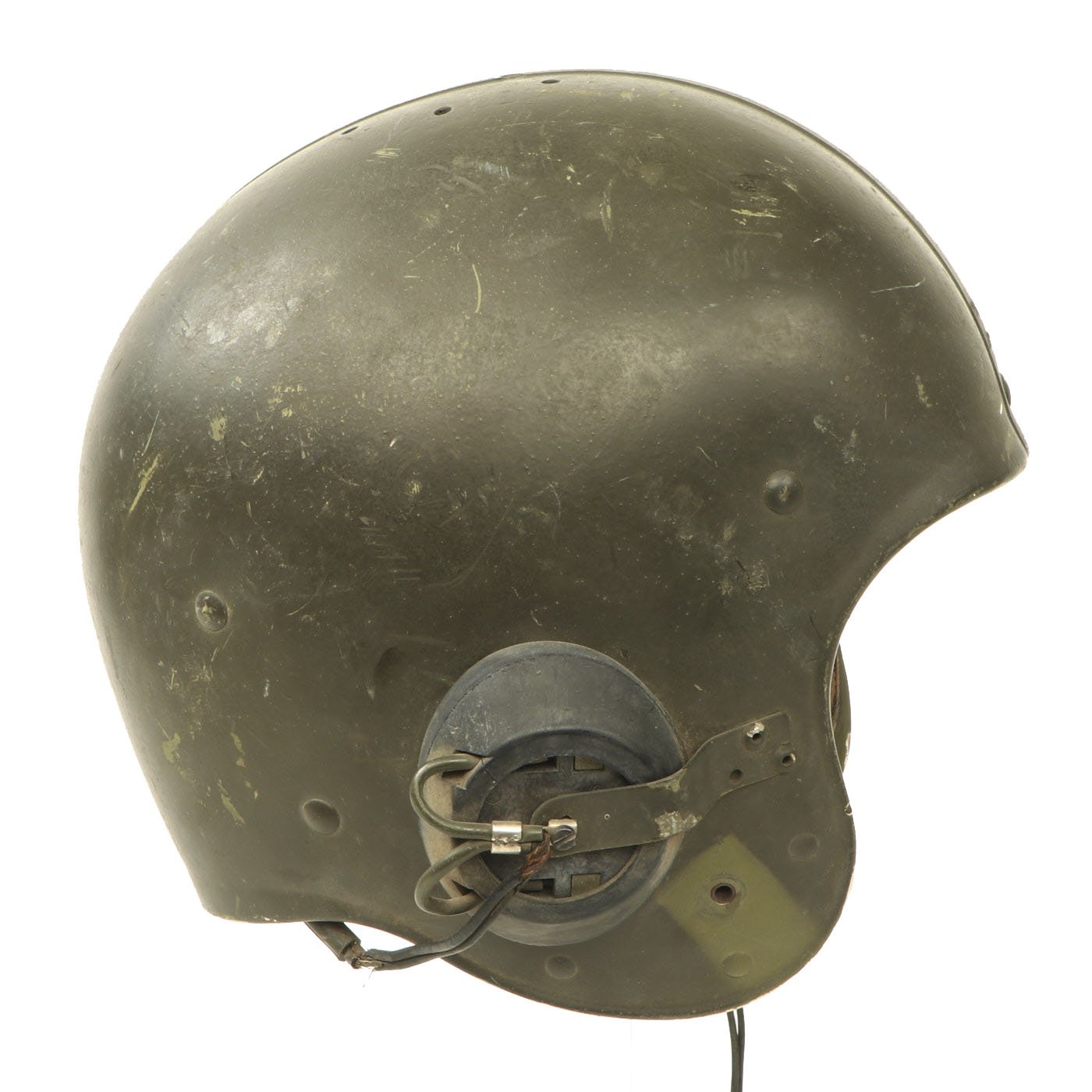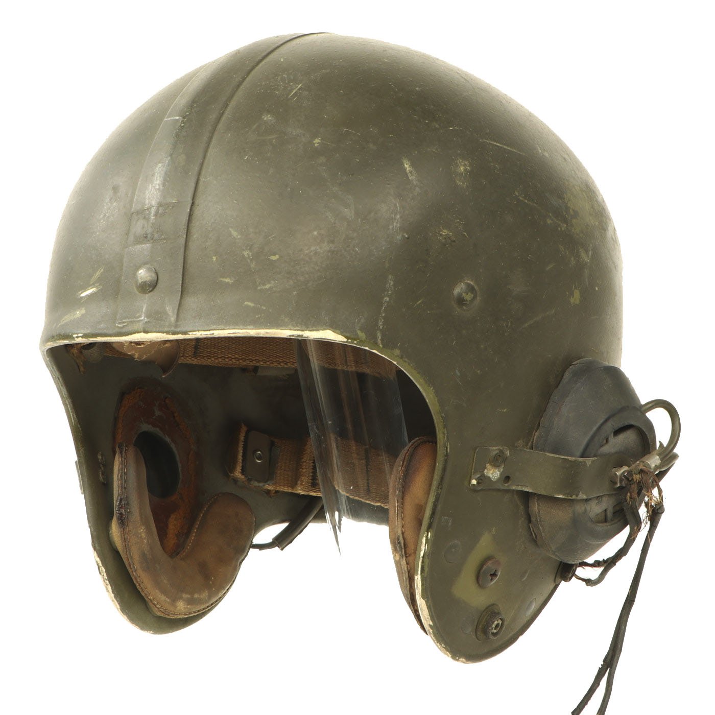 Original Item: Only One Available. This is a 1950s Korean War Era Armored Vehicle & Tanker Helmet, most likely manufactured by Riddell, but the label is under one of the glued on pads. Like most of the early tanker helmets after WWII, the design is very similar to the football helmets of the time. This example features complete rigging on the inside, with a mostly intact crown pad, though it is torn where it goes through the center ring of the rigging.
