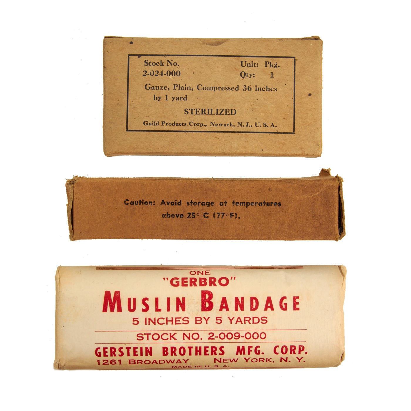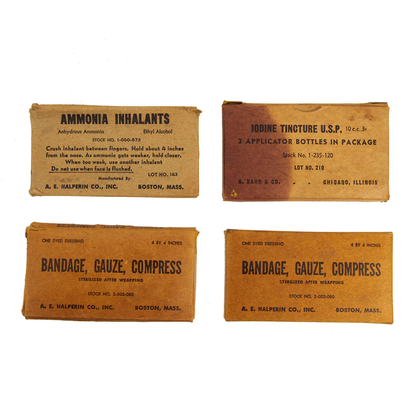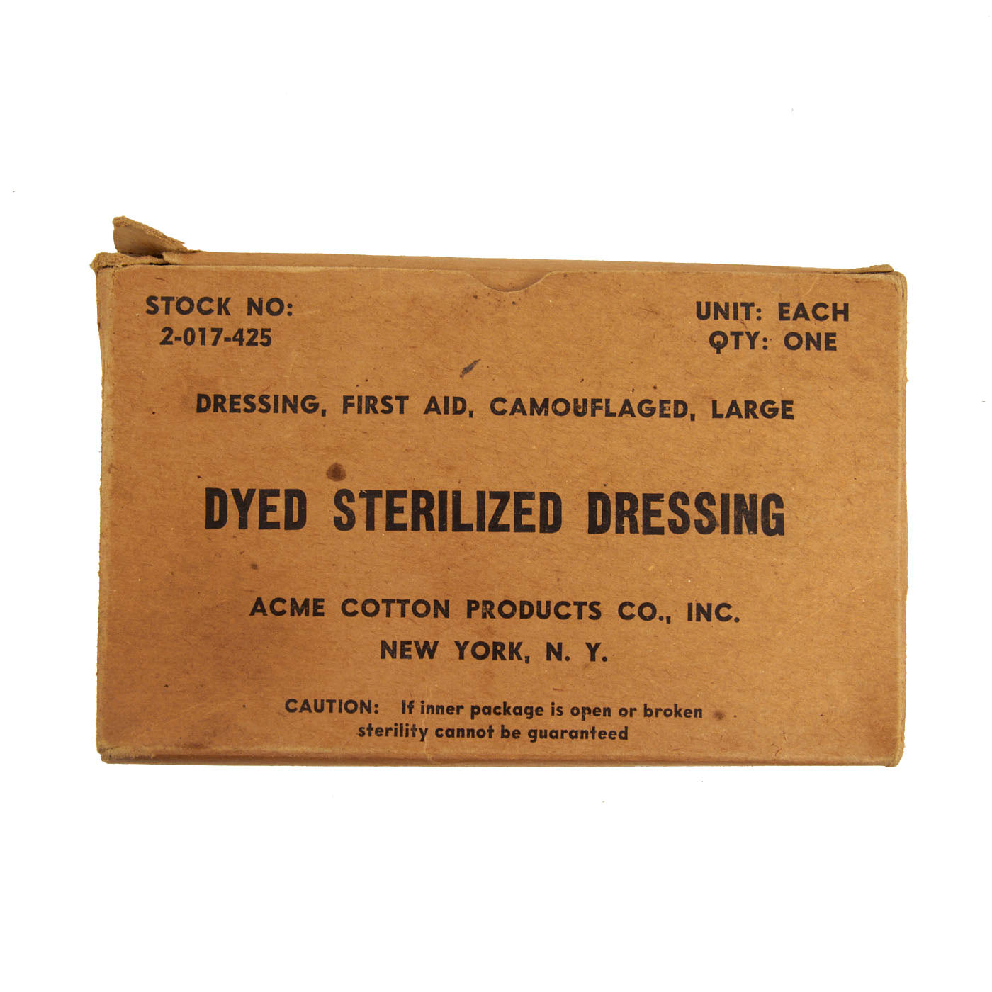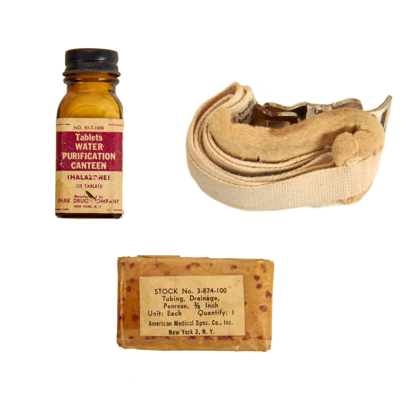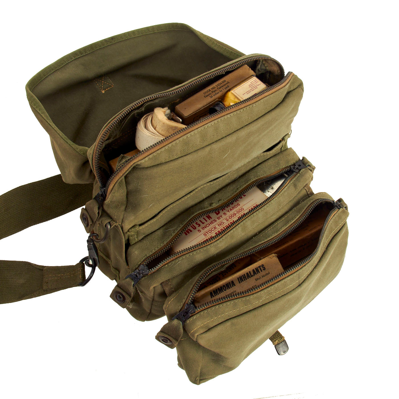 This M3 medics’ bag is free of any major damage but does show signs of use due to the wear and fading to the exterior. The contents inside consist of various Korean War dated bandages, which was also not uncommon to see during the Vietnam War. There are unopened battle dressings, foot powder, delousing powder, gauze, water purification tablets and more!