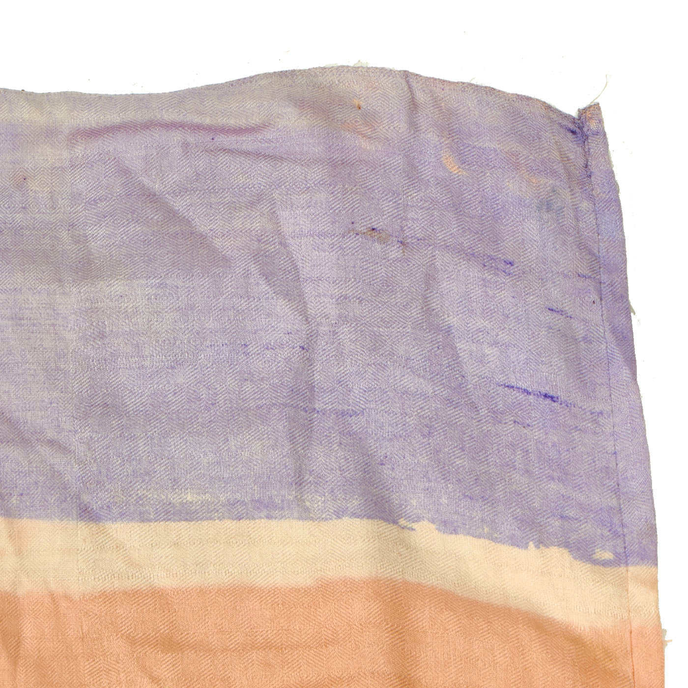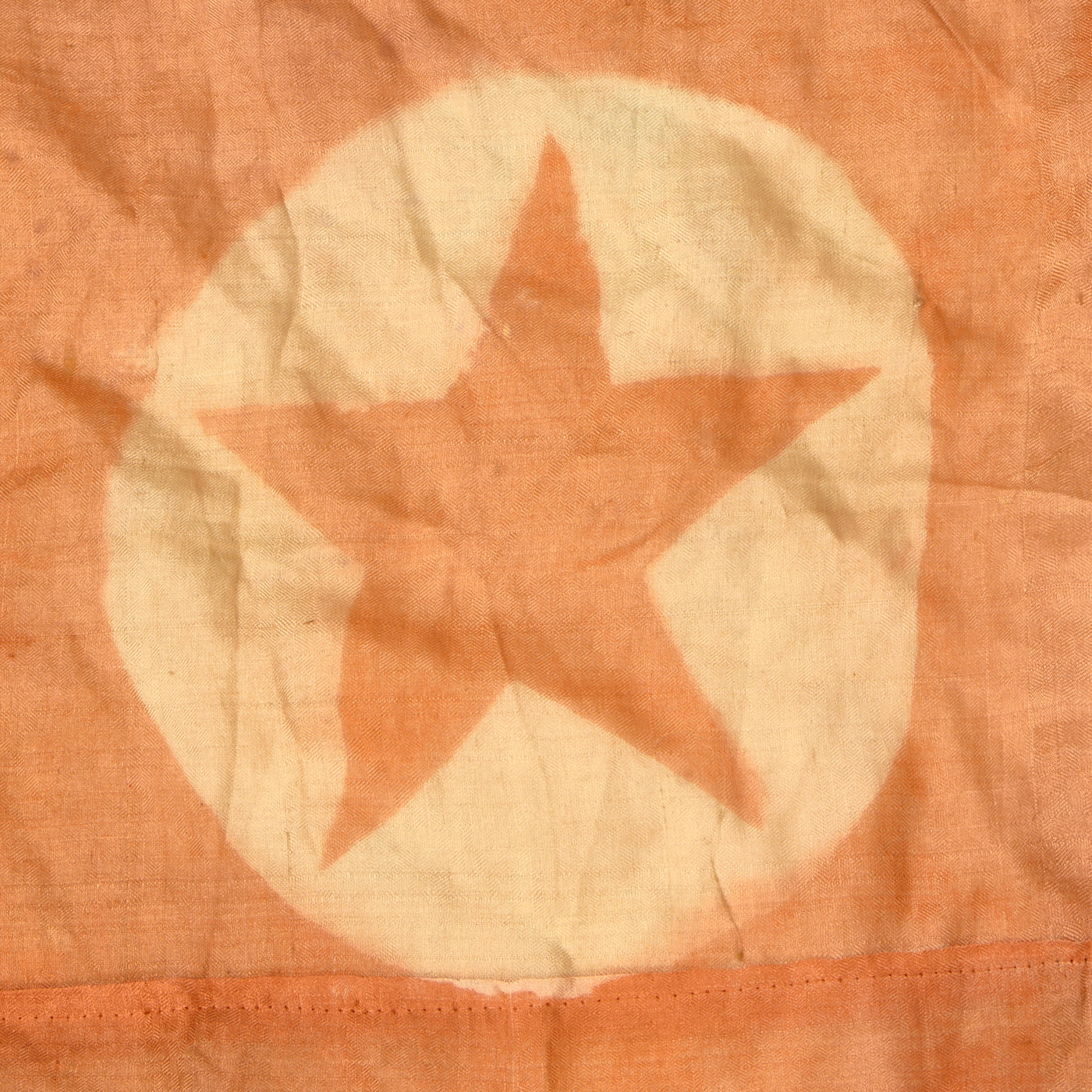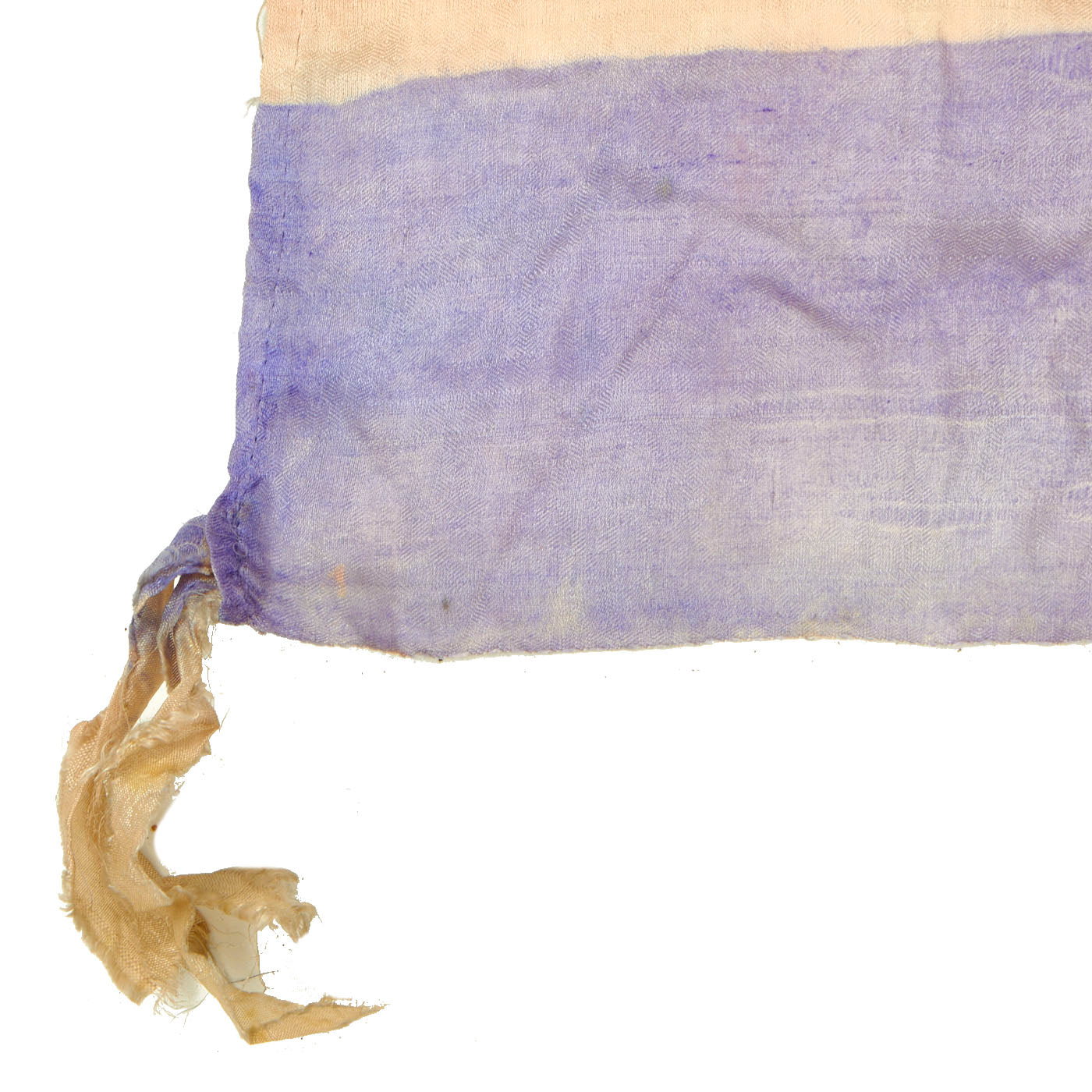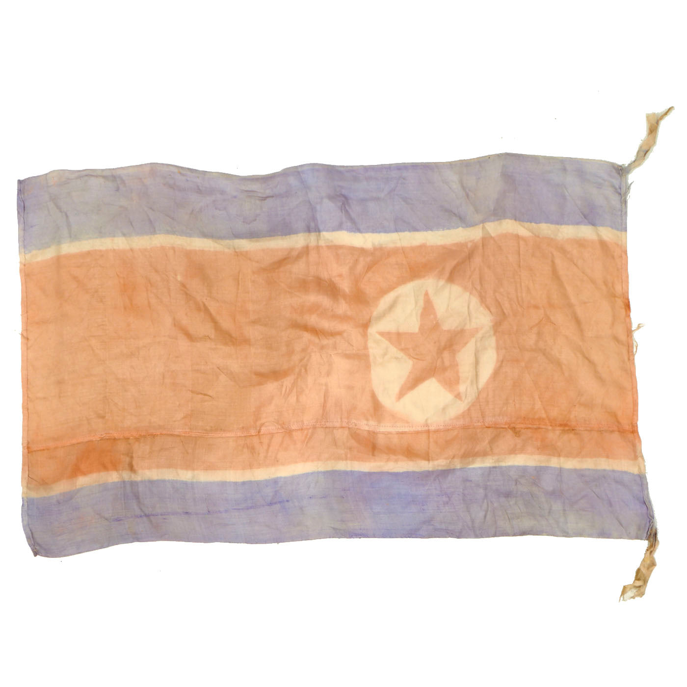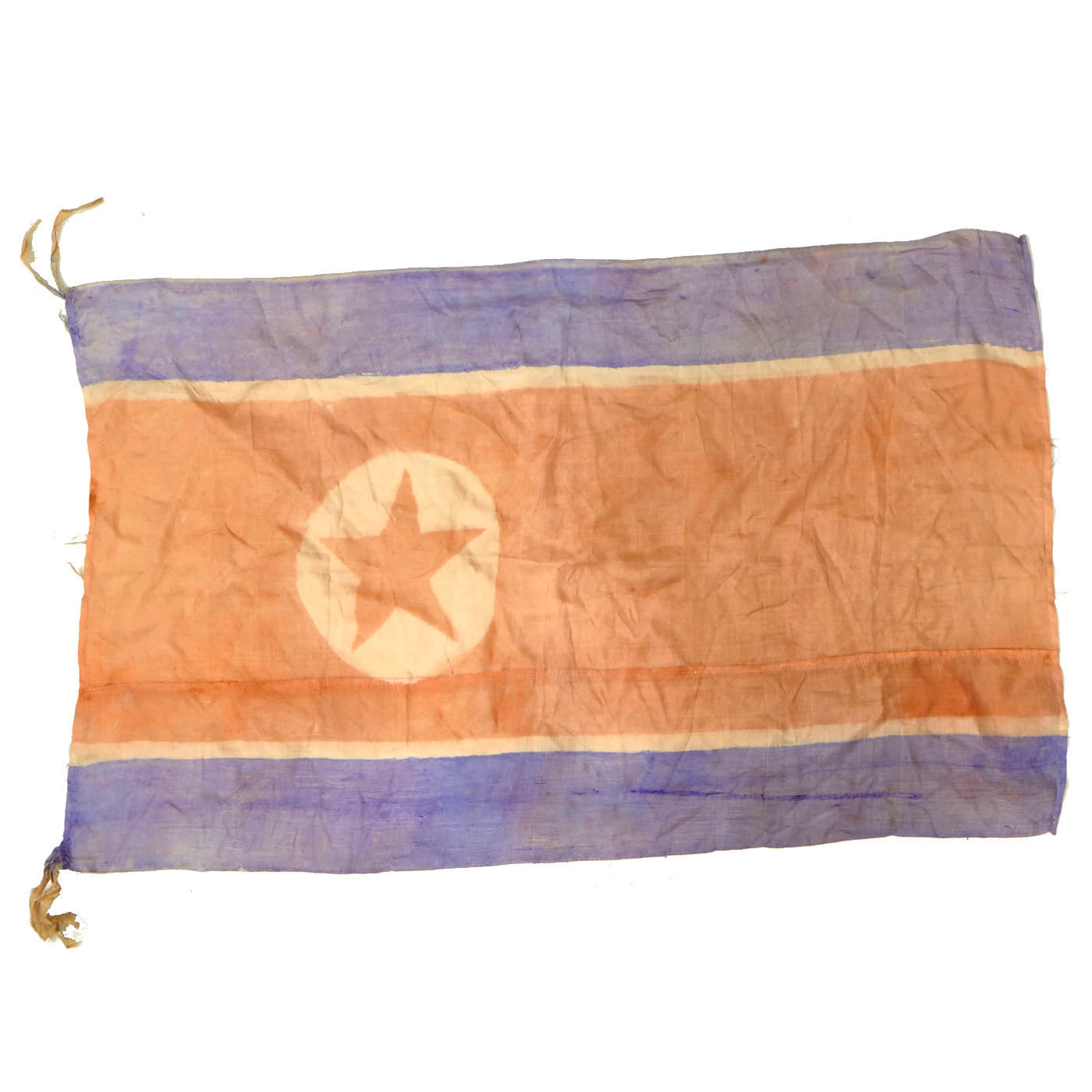 This example measures 21.5" x 31.5", and was captured and brought back during the Korean war, which lasted Jun 25, 1950 – Jul 27, 1953. It looks to be made of Rayon cloth, an early partial synthetic cloth made from wood. The colors are retained but not well, this is a flag that saw many years of service as it is heavily faded. It does have hanging hardware or but no header, so it is most likely the type of flag that was attached to a wall or building.