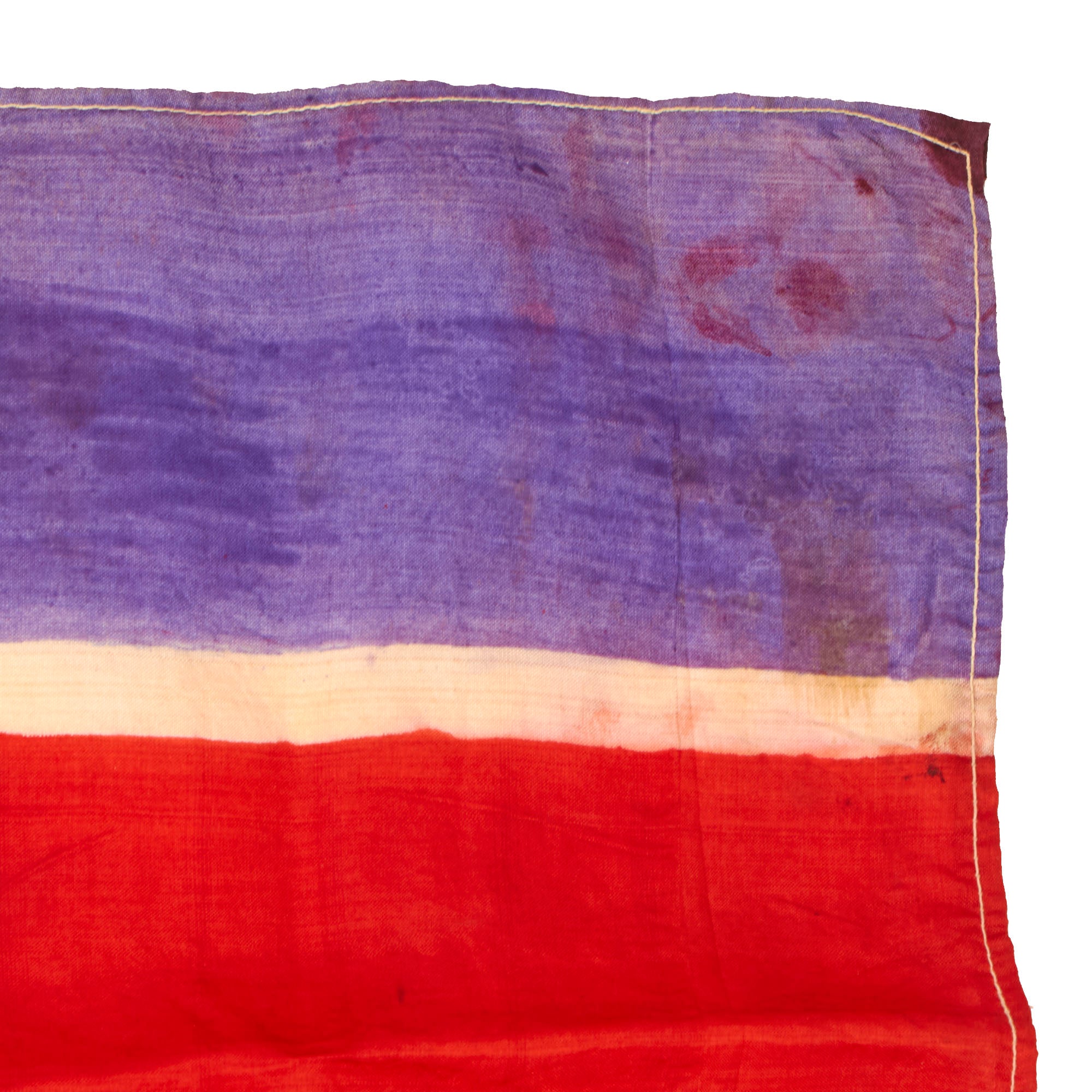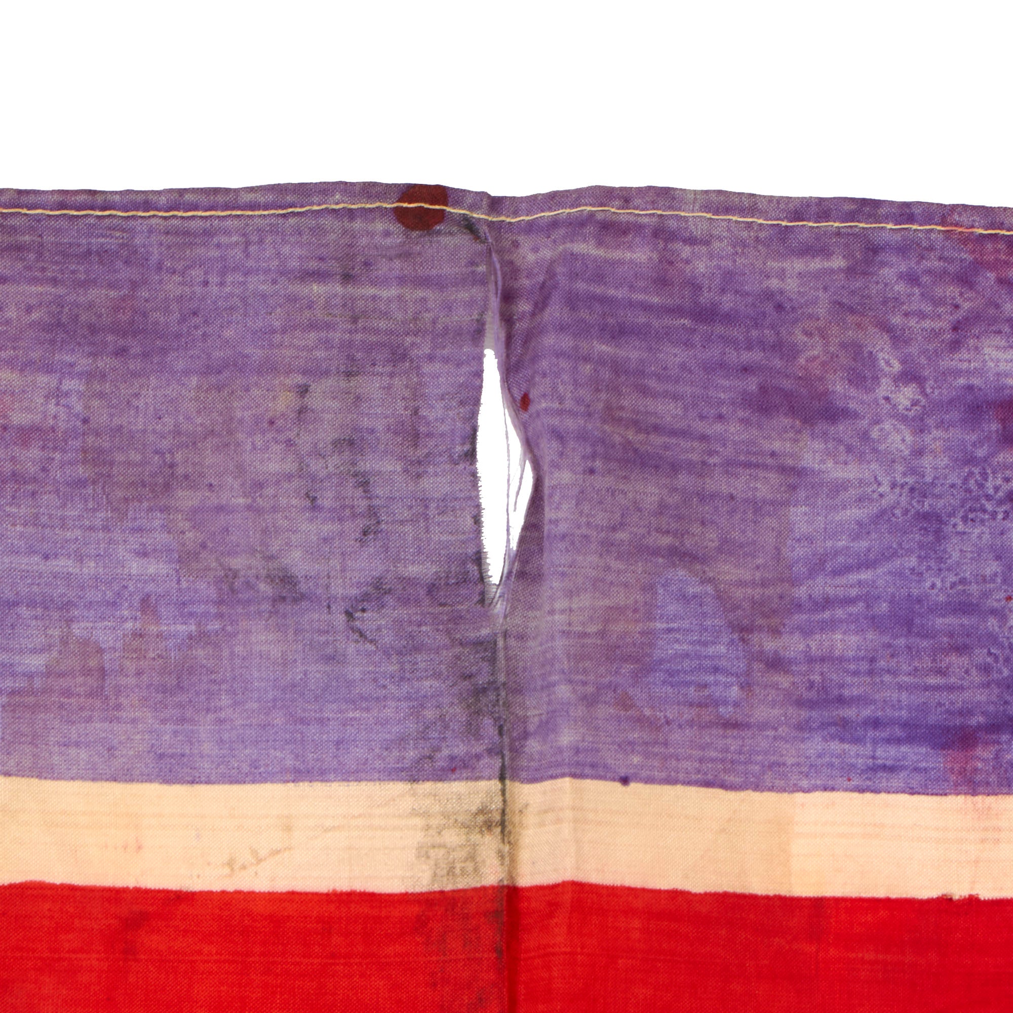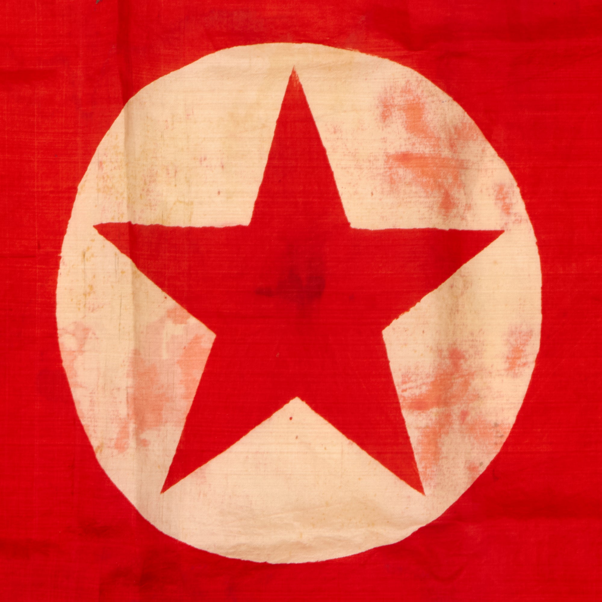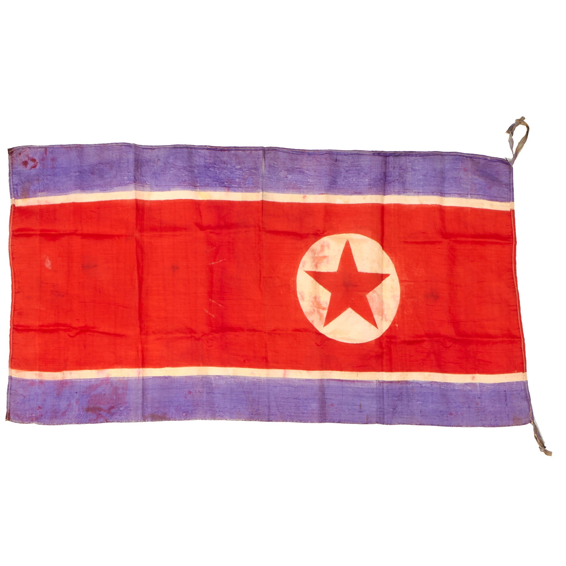 This example measures 21" x 35", and was “captured” and brought back during the Korean war, which lasted Jun 25, 1950 –Jul 27, 1953. It looks to be made of Rayon cloth, an early partial synthetic cloth made from wood. The colors are retained but not well, this is a flag that saw many years of service as it is heavily faded. It does have hanging hardware or but no header, so it is most likely the type of flag that was attached to a wall or building.