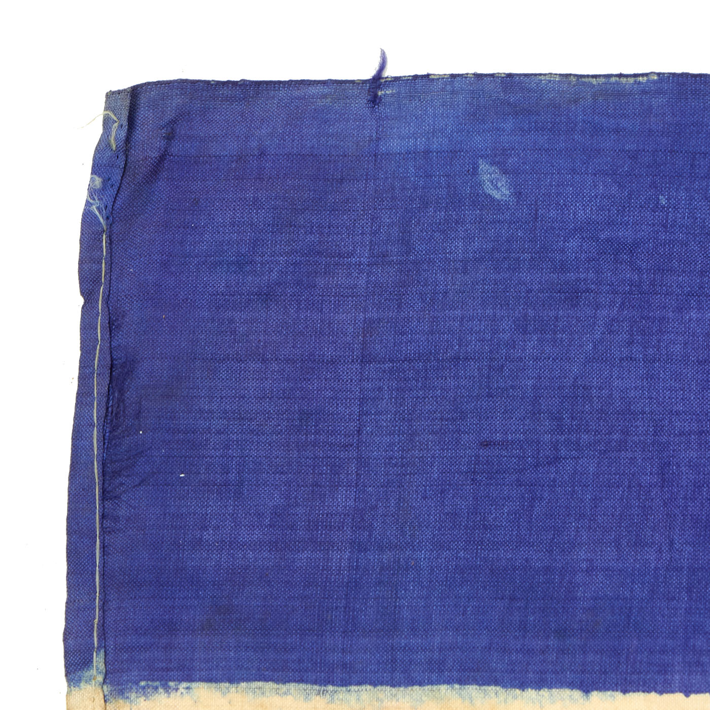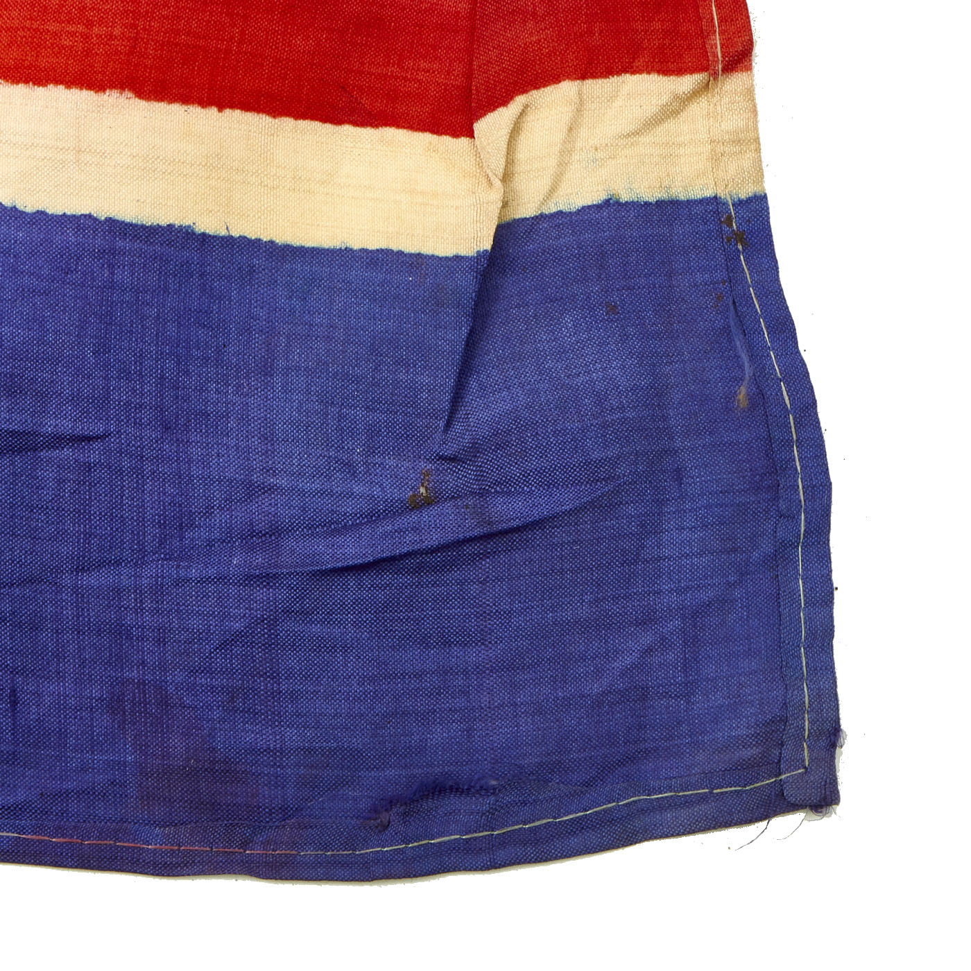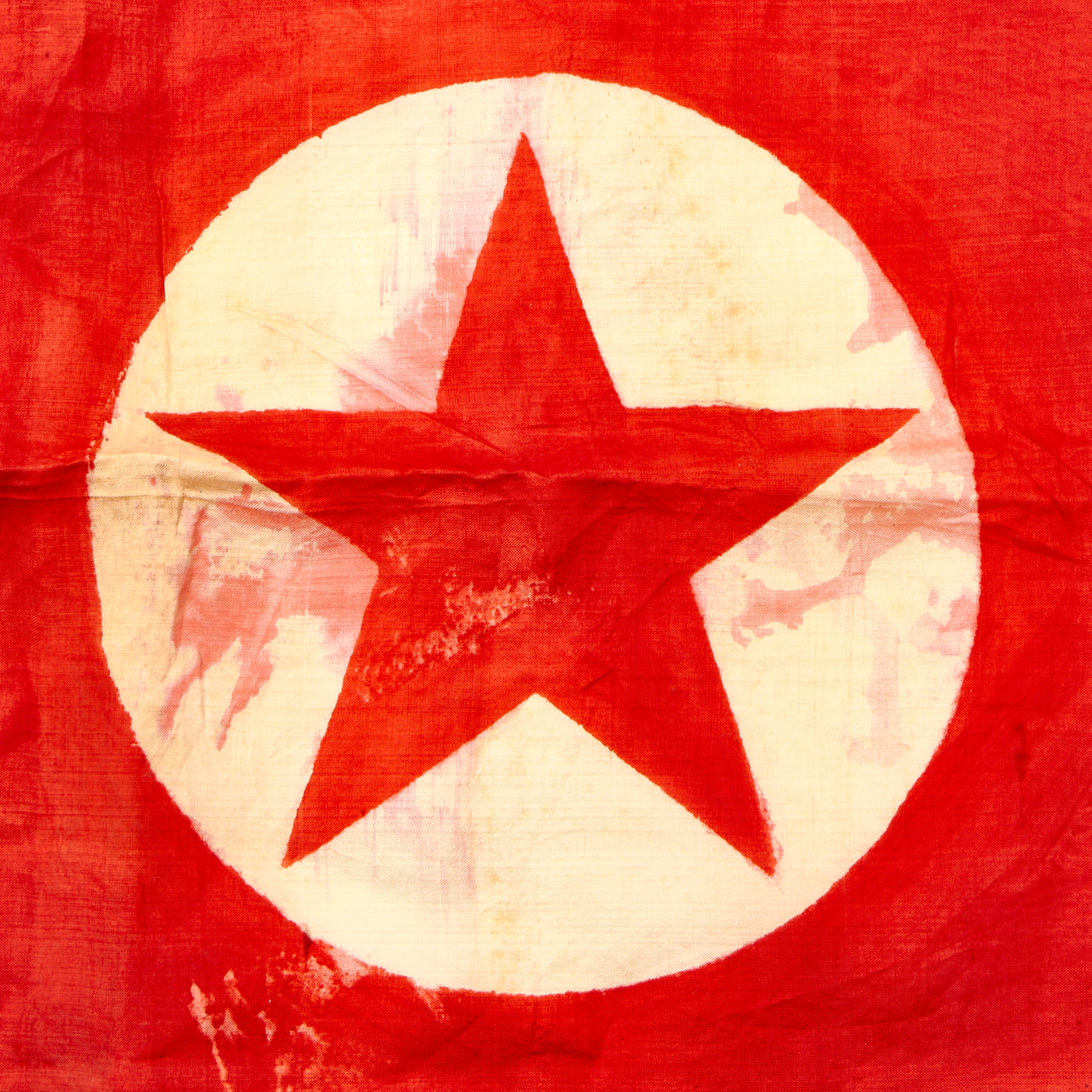 This example measures 39" x 20", and was captured and brought back during the Korean war, which lasted Jun 25, 1950 – Jul 27, 1953. It looks to be made of Rayon cloth, an early partial synthetic cloth made from wood. The colors are retained but not well, this is a flag that saw many years of service as it is faded, torn and battered. It does not have hanging hardware, no header, so it is most likely the type of flag that was attached to a wall or building.