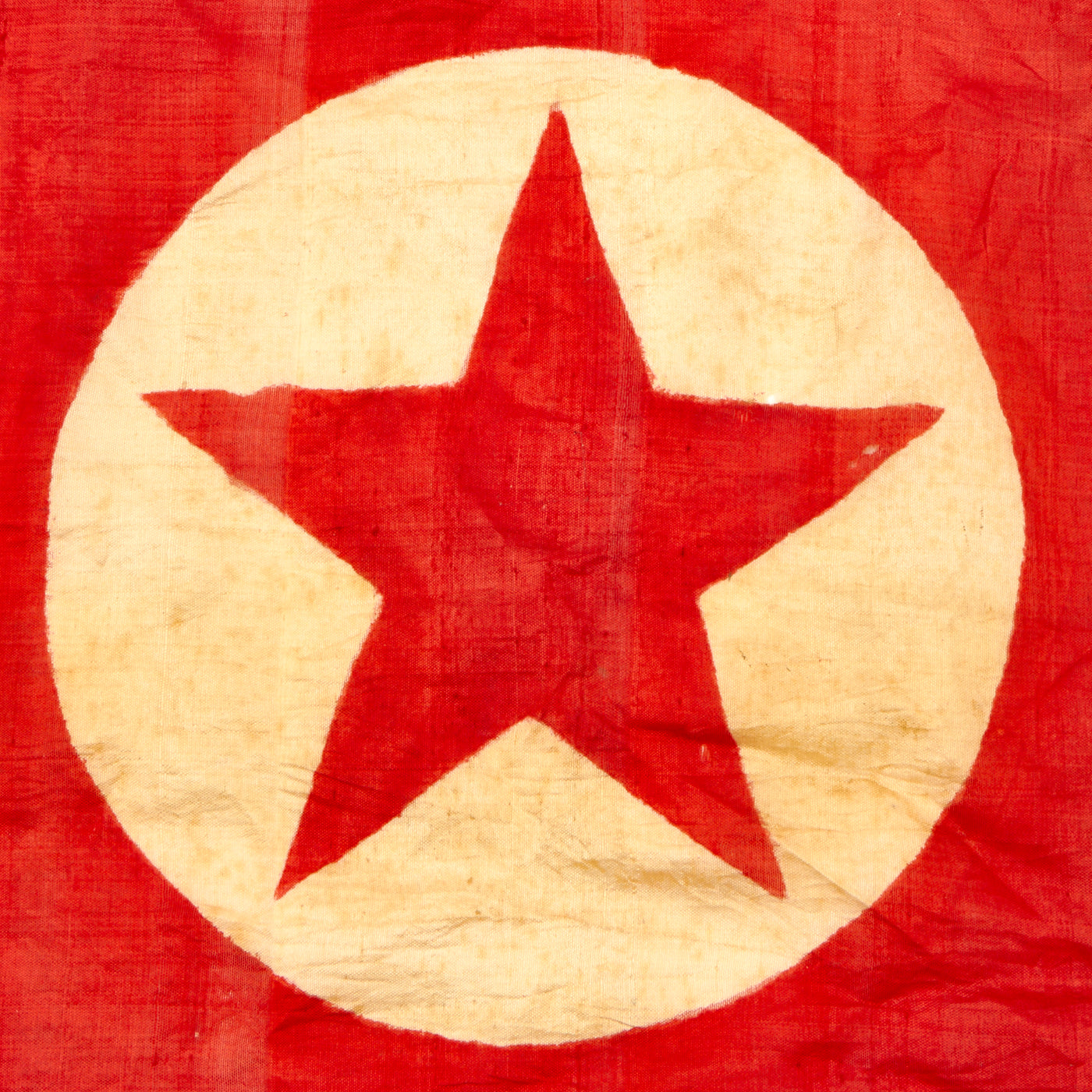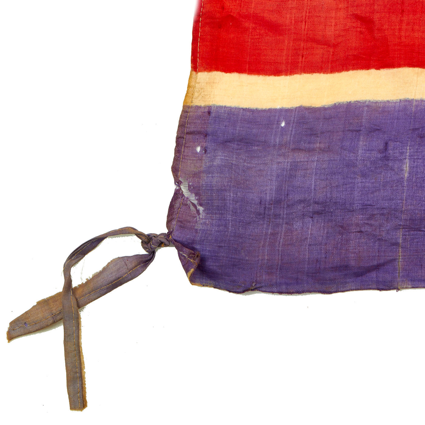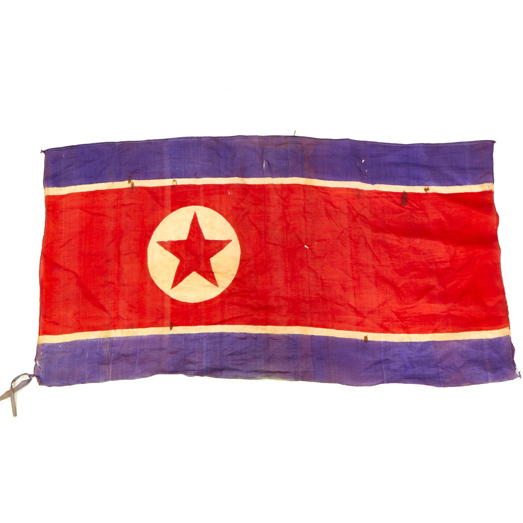 This example measures 40" x 21", and was captured and brought back during the Korean war, which lasted Jun 25, 1950 – Jul 27, 1953. It looks to be made of Rayon cloth, an early partial synthetic cloth made from wood. The colors are retained but not well, this is a flag that saw many years of service as it is faded, torn and battered. It does have hanging hardware, but no header, so it is most likely the type of flag that was attached to a wall or building.