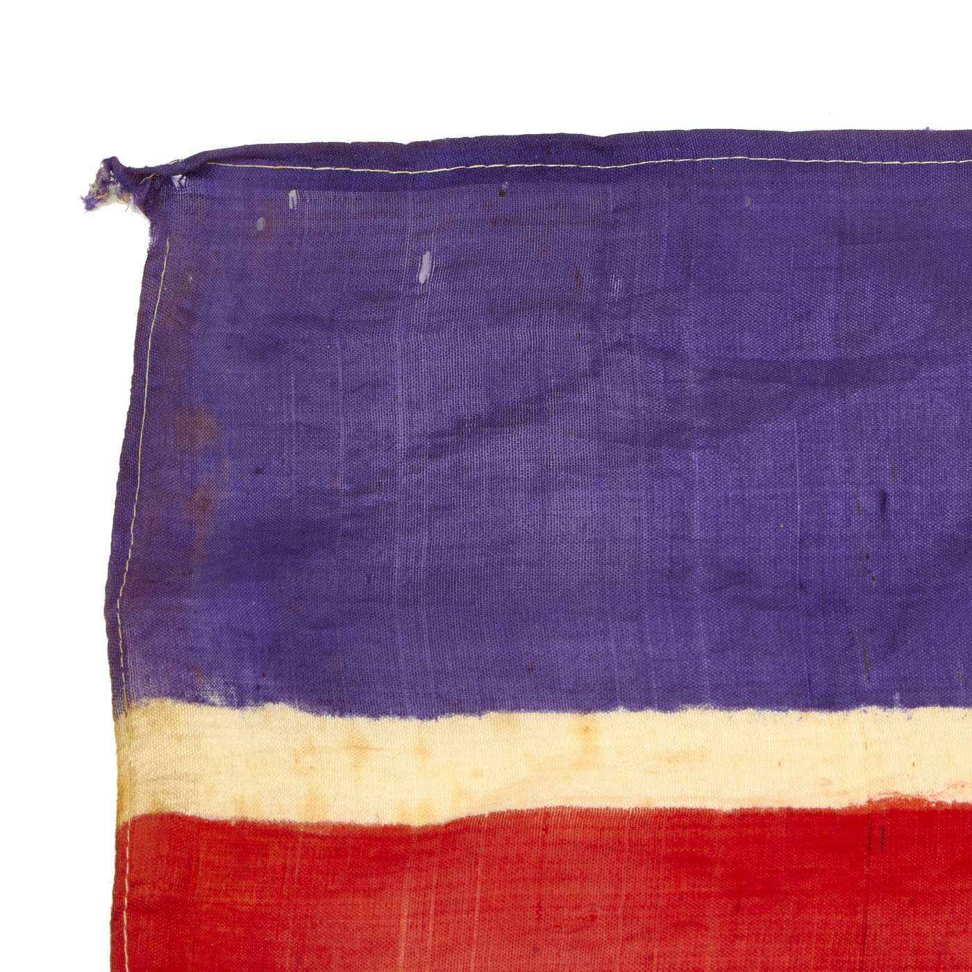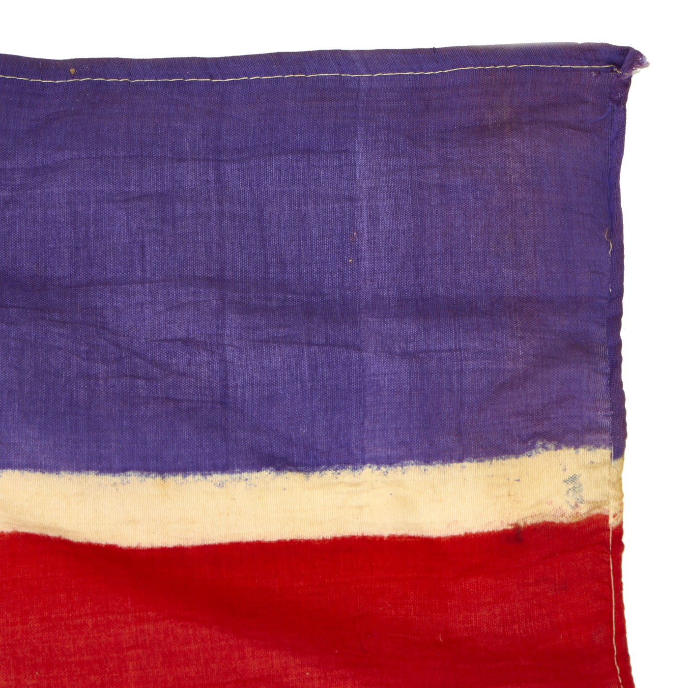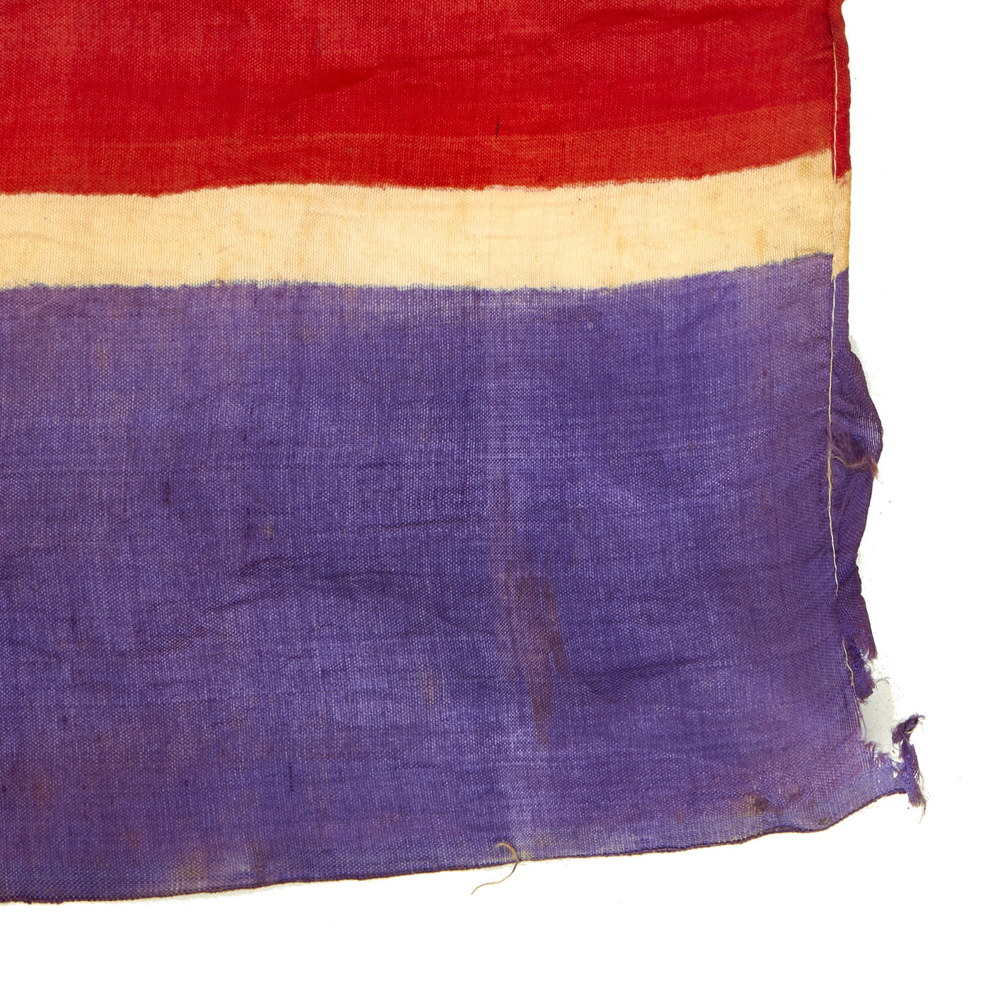 This example measures 40" x 21", and was captured and brought back during the Korean war, which lasted Jun 25, 1950 – Jul 27, 1953. It looks to be made of Rayon cloth, an early partial synthetic cloth made from wood. The colors are retained but not well, this is a flag that saw many years of service as it is faded, torn and battered. It does have hanging hardware, but no header, so it is most likely the type of flag that was attached to a wall or building.