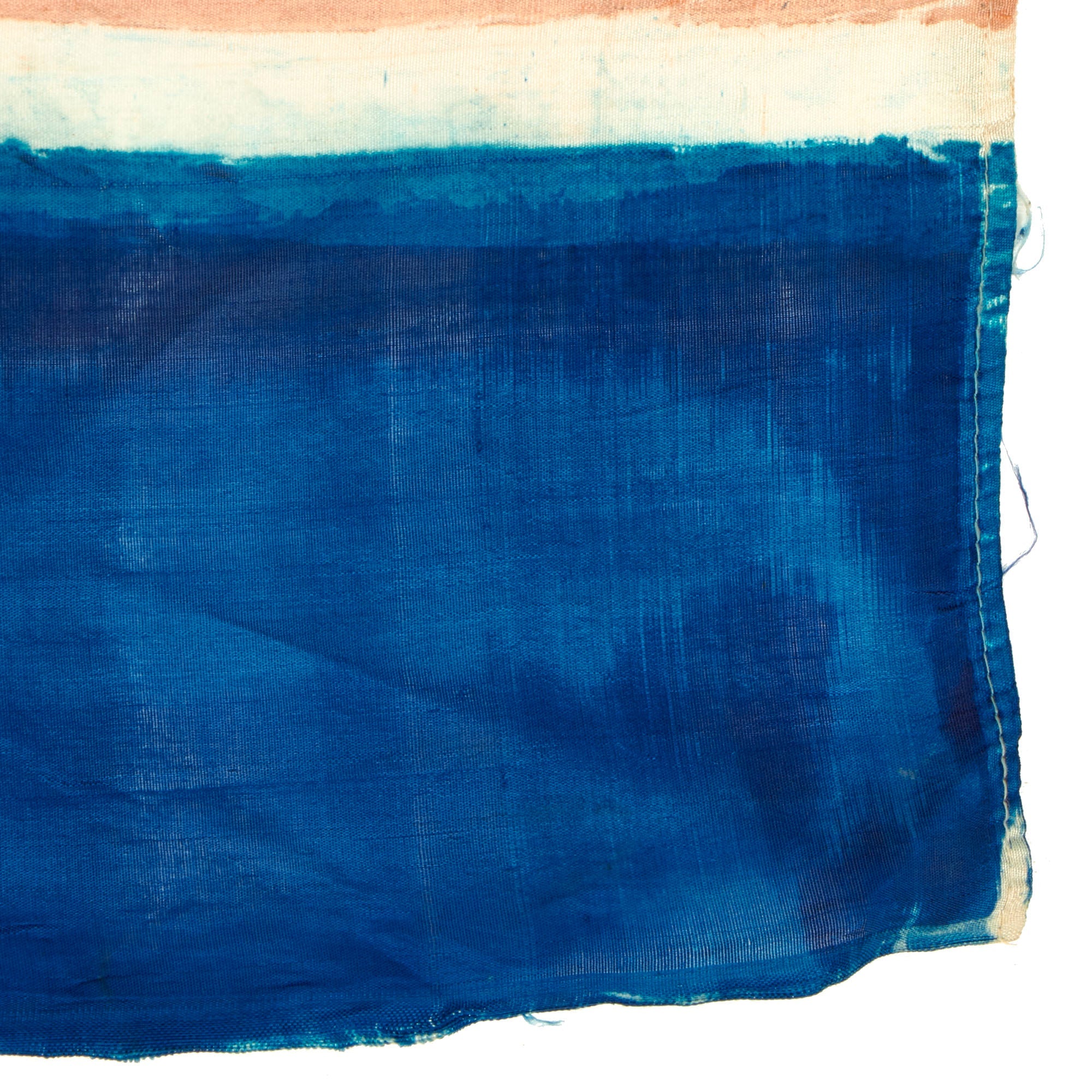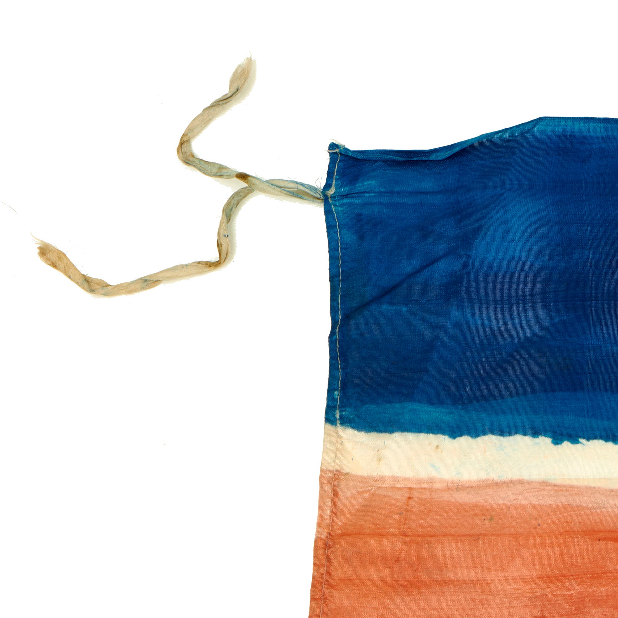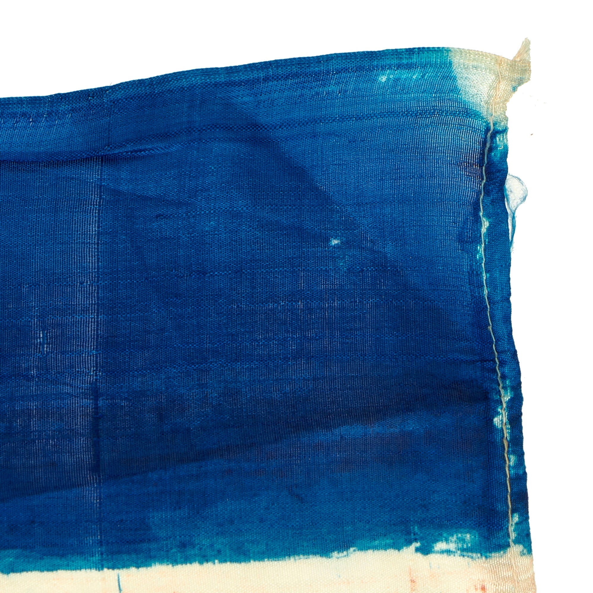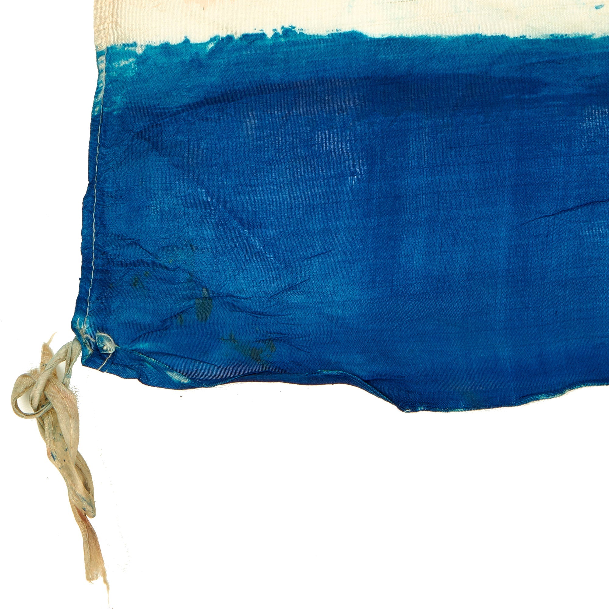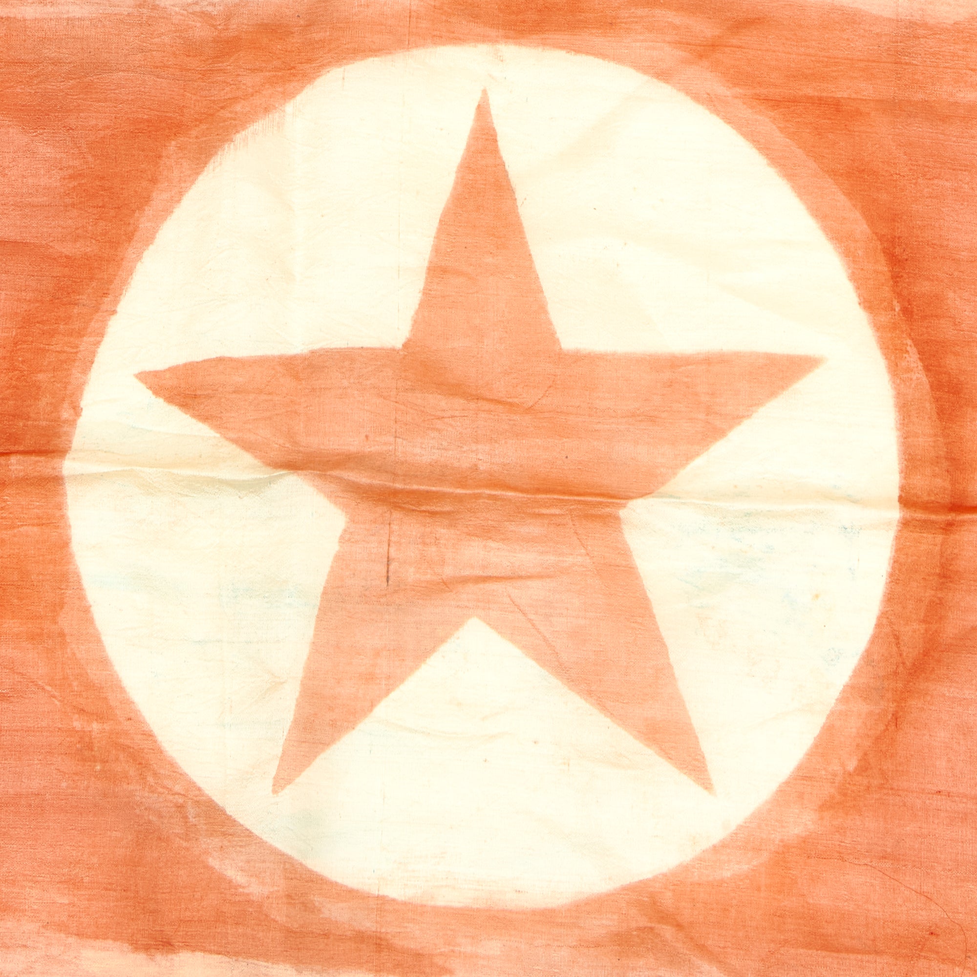 This example measures 51" x 28", and was captured and brought back during the Korean war, which lasted Jun 25, 1950 – Jul 27, 1953. It looks to be made of Rayon cloth, an early partial synthetic cloth made from wood. The colors are retained but not well, this is a flag that saw many years of service as it is heavily faded with bleeding in the colors. It does have hanging hardware but no header, so it is most likely the type of flag that was attached to a wall or building.