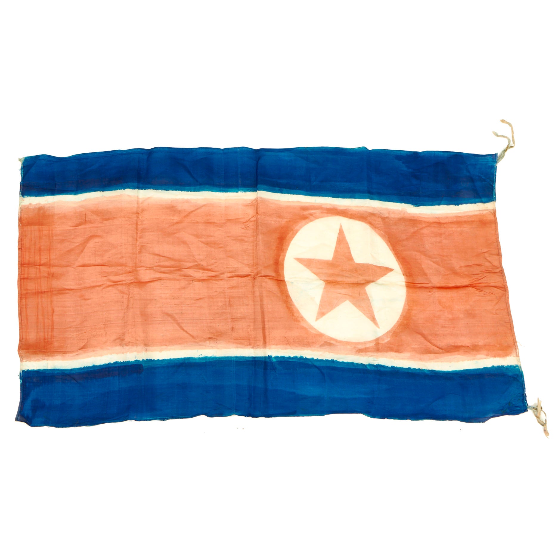 Original Item: Only One Available. The flag of North Korea, also known as the Ramhongsaek Konghwagukgi ( "blue and red-colored flag of the republic"), consists of a central red panel, bordered both above and below by a narrow white stripe and a broad blue stripe. The central red panel bears a five-pointed red star within a white circle near the hoist.