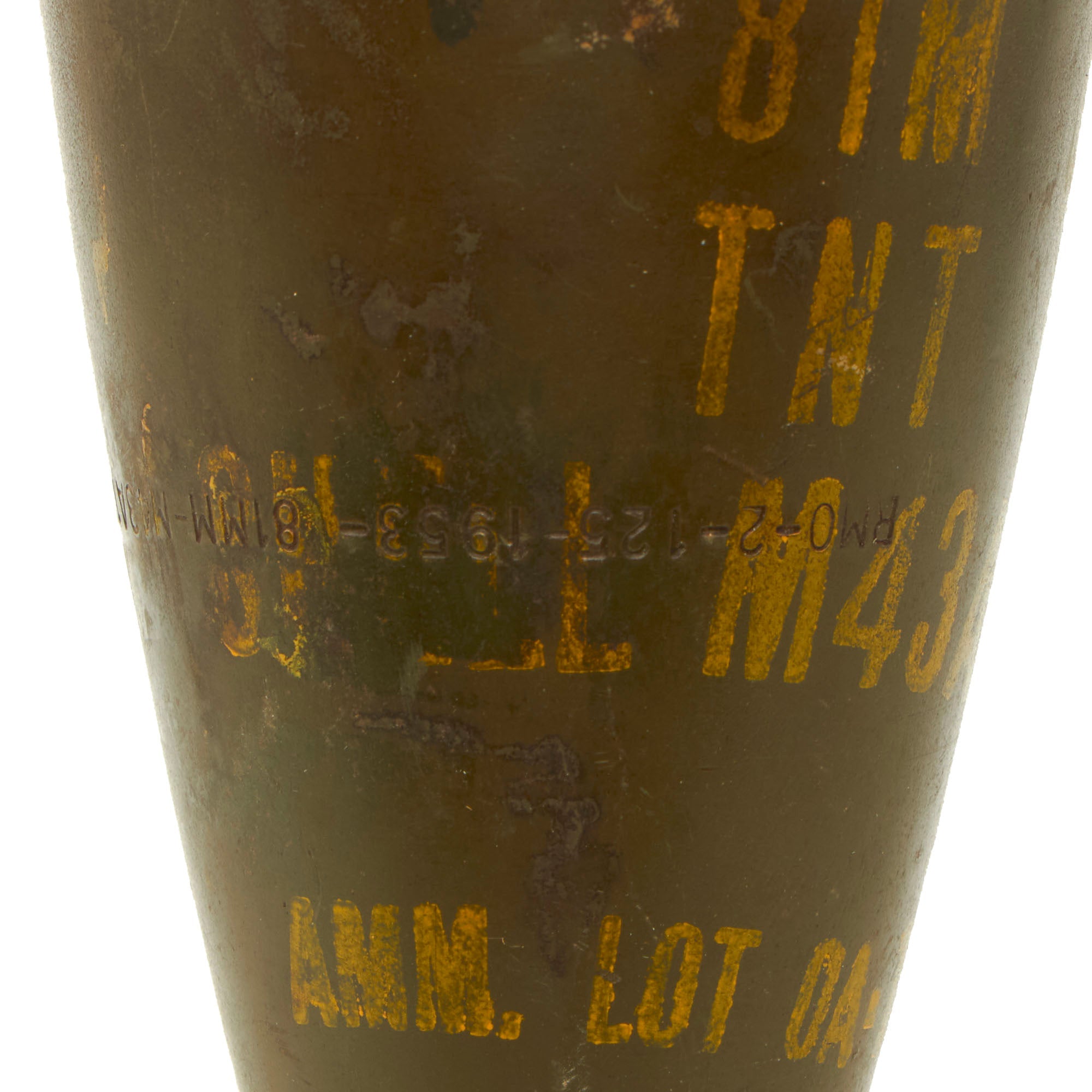 This is a totally genuine United States military Korean War produced SHELL, M43A1B1, without fuze but does have the base present. The fuse base is open and allows the explosive chamber to be inspected though the window to view is very small and a bore camera would be needed.
