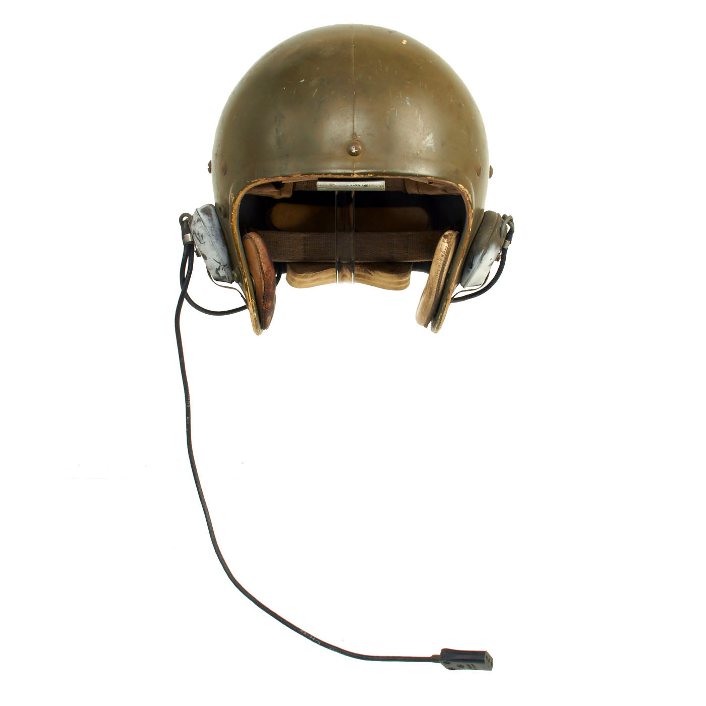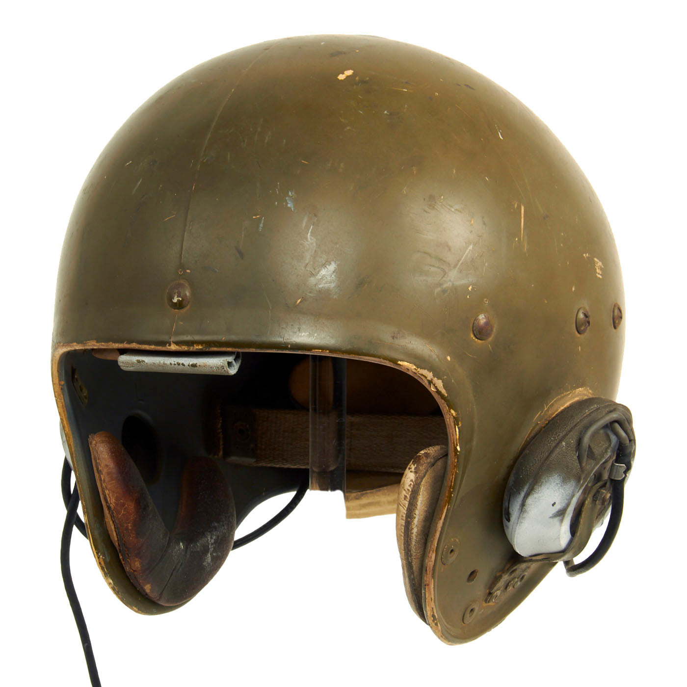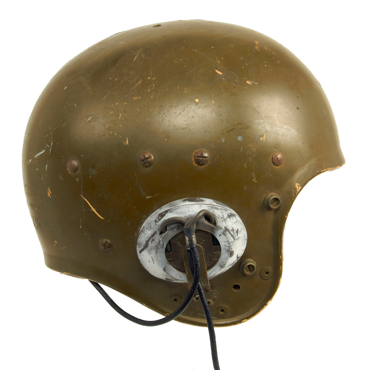This is a very scarce helmet that was a “stop gap” piece after the WWII Tanker Helmet and before they produced a Tanker specific helmet. The Football helmet was a state of the art lightweight helmet by Spalding with a Titanite shell and interior suspension webbing which even retains the original football helmet pads. Helmet also has additional padding around the crown which is secured with a screw through shell and has metal clips to hold the added ear phones in rubber cups. Helmet is stamped on the back "Spalding Titanite Made in USA" and "SPS 62-2087 7 1/4". Helmet appears complete and is in very good to very good condition with some moderate scuffs and scratches to the OD finish, the ear pads have lost their padding and there is some wear to the rubber earphones.