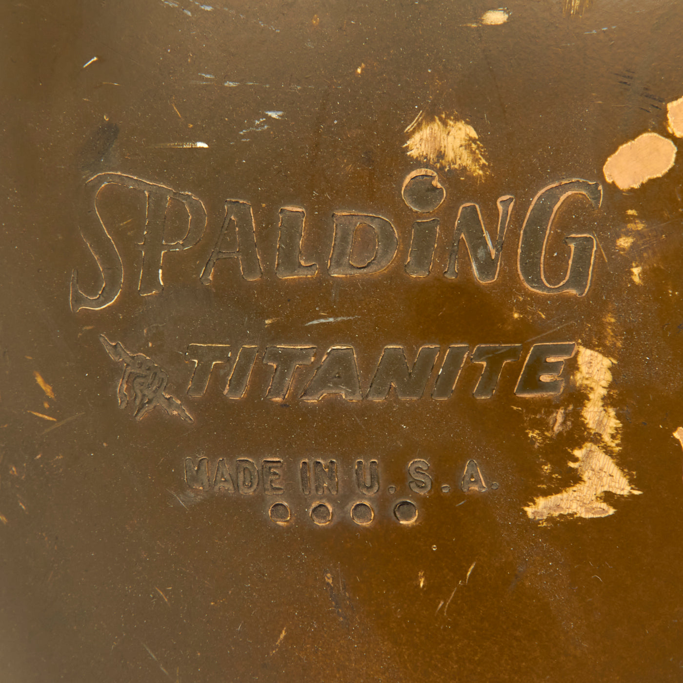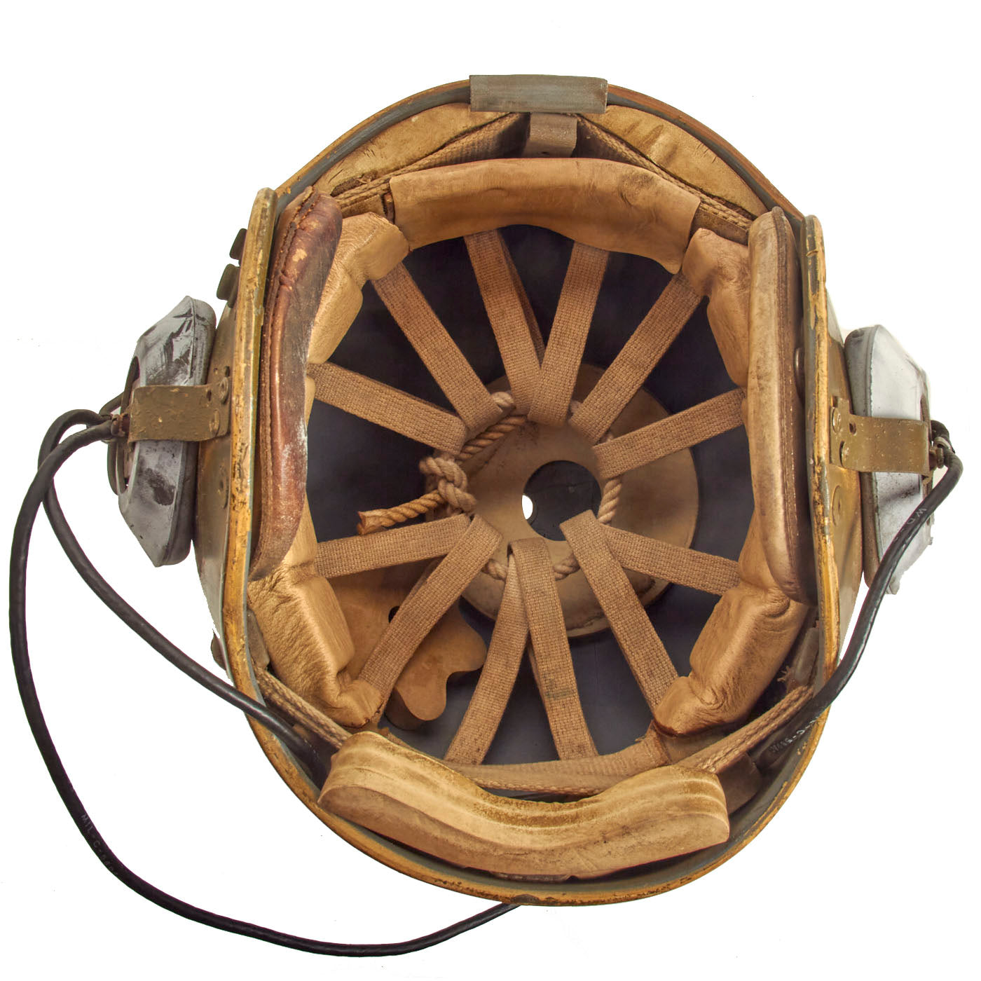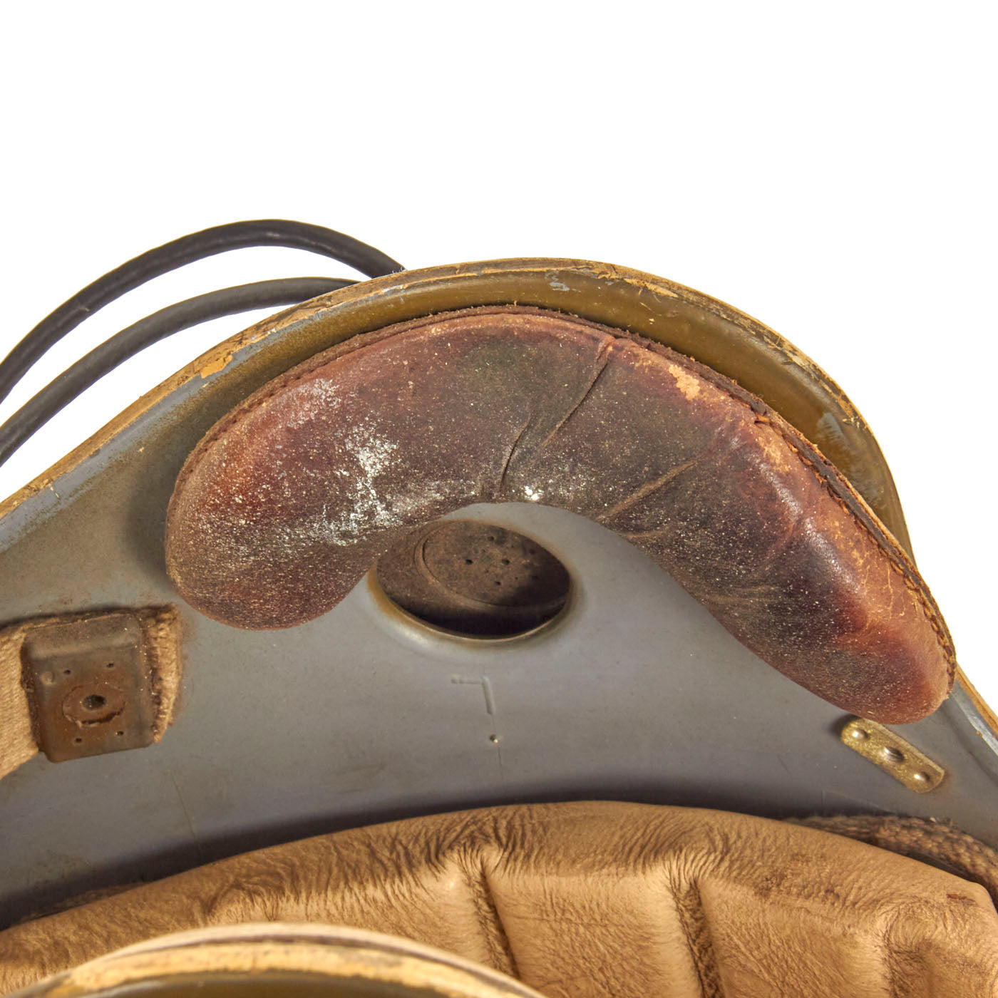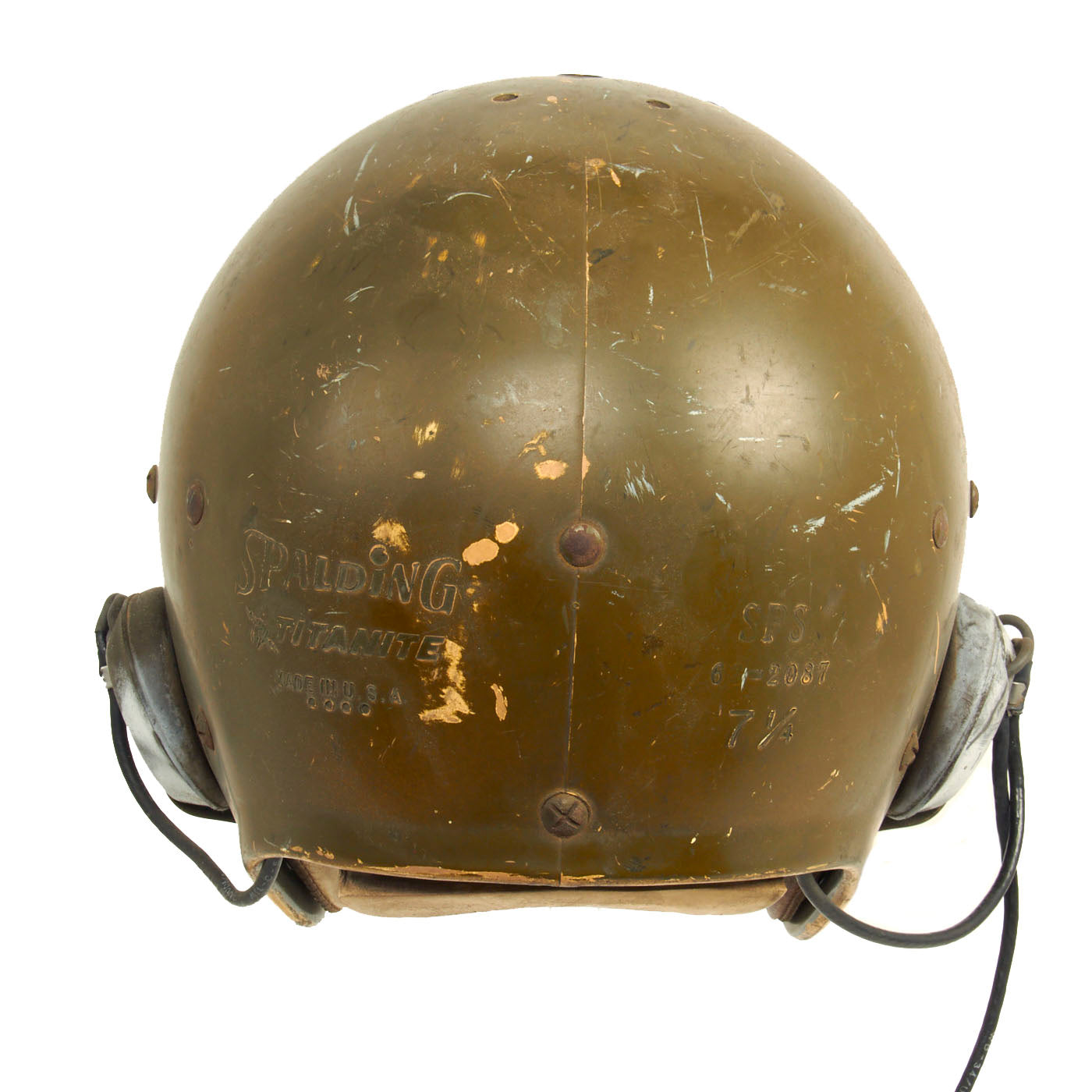 This is a very scarce helmet that was a “stop gap” piece after the WWII Tanker Helmet and before they produced a Tanker specific helmet. The Football helmet was a state of the art lightweight helmet by Spalding with a Titanite shell and interior suspension webbing which even retains the original football helmet pads. Helmet also has additional padding around the crown which is secured with a screw through shell and has metal clips to hold the added ear phones in rubber cups. Helmet is stamped on the back "Spalding Titanite Made in USA" and "SPS 62-2087 7 1/4". Helmet appears complete and is in very good to very good condition with some moderate scuffs and scratches to the OD finish, the ear pads have lost their padding and there is some wear to the rubber earphones.