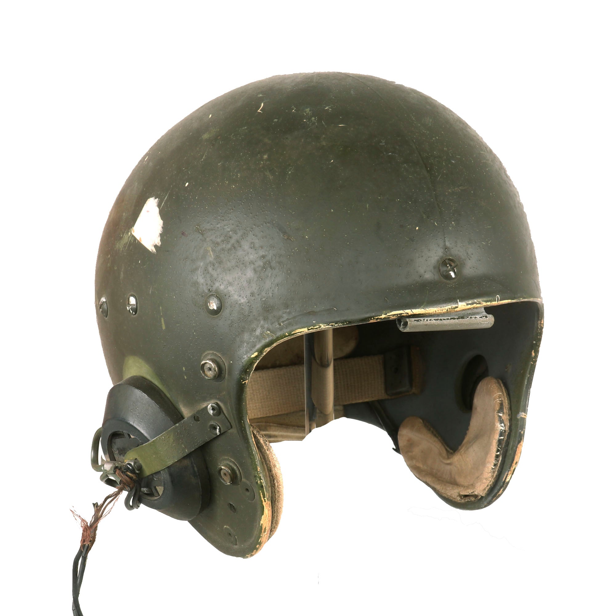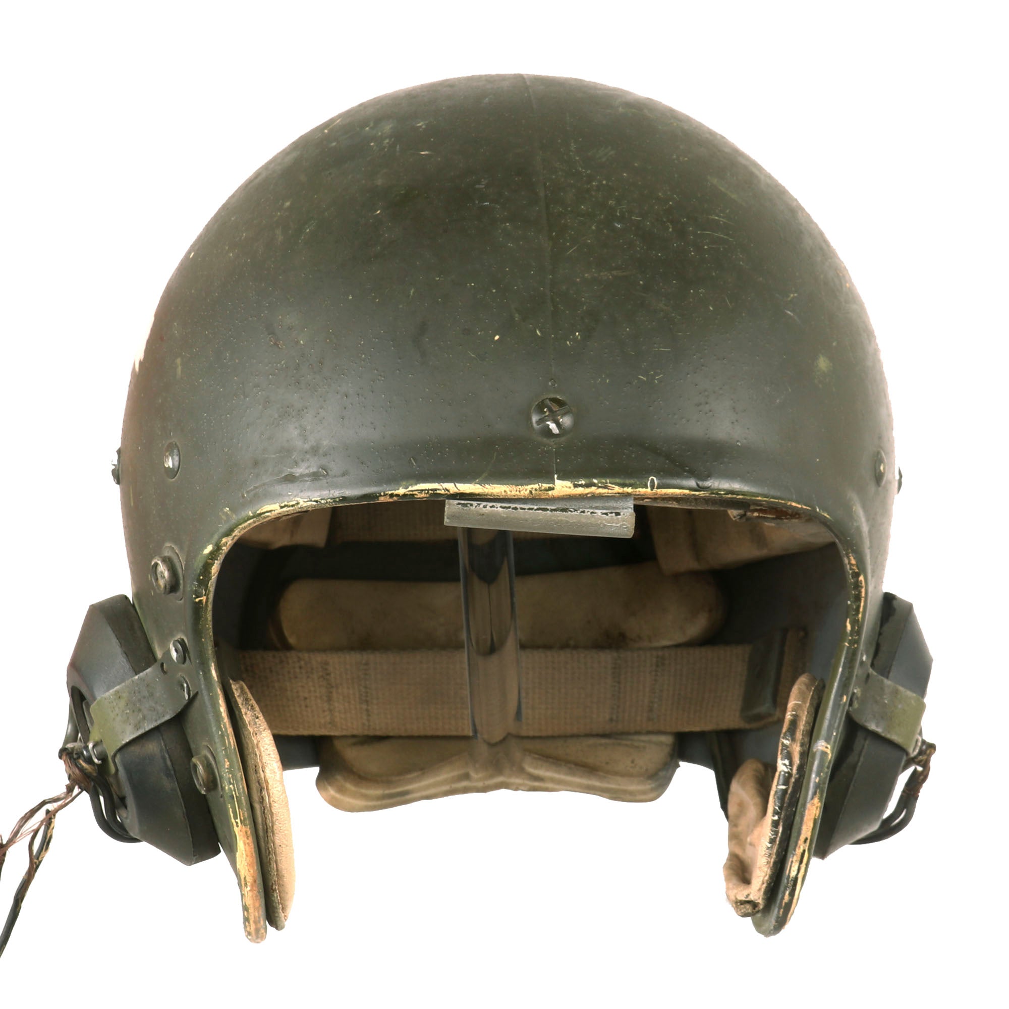 Original Item: Only One Available. Now this is an interesting helmet for sure! This is basically a football helmet made by Spalding and converted for use in the U.S. Military as a tankers helmet, or possibly a door gunner’s helmet in Vietnam.