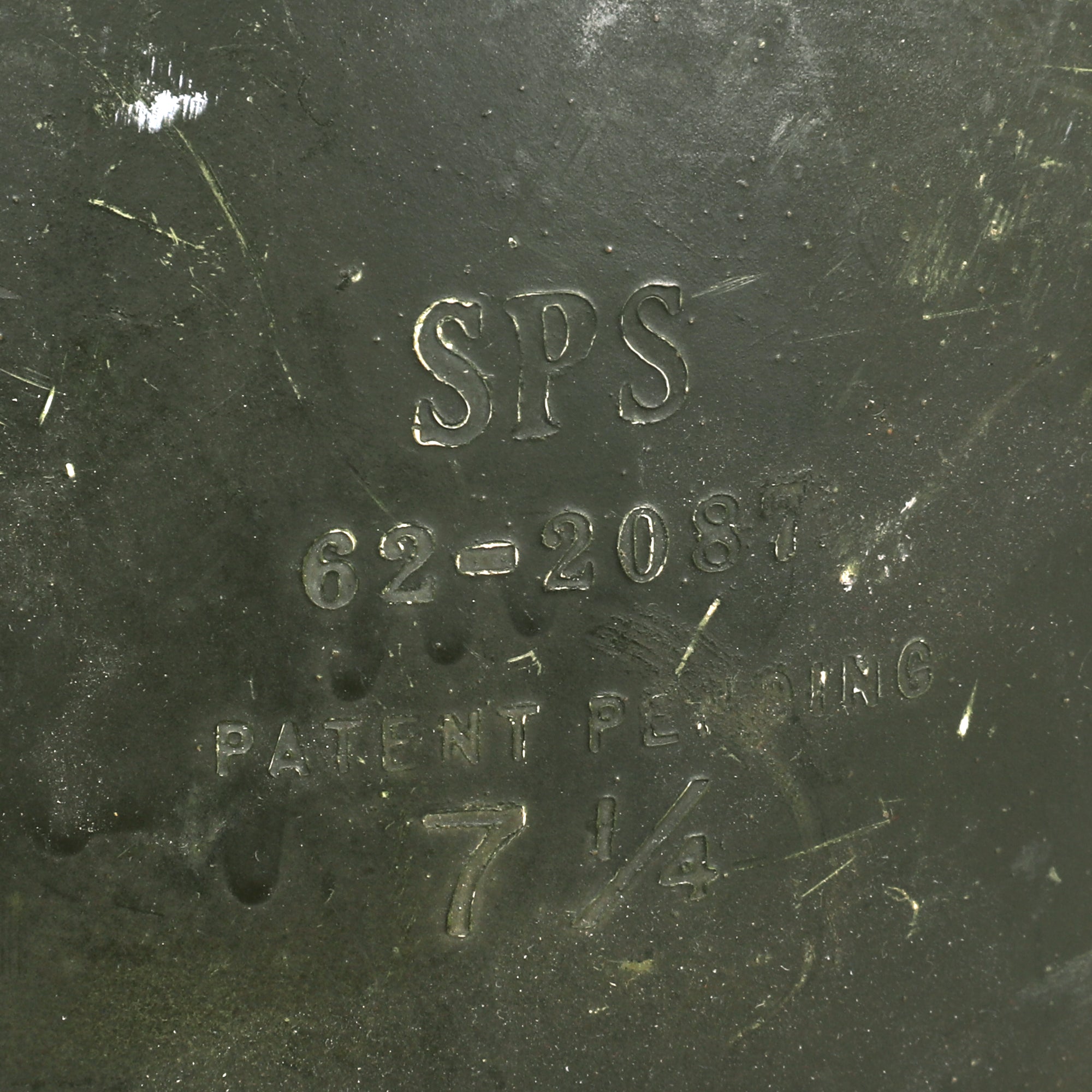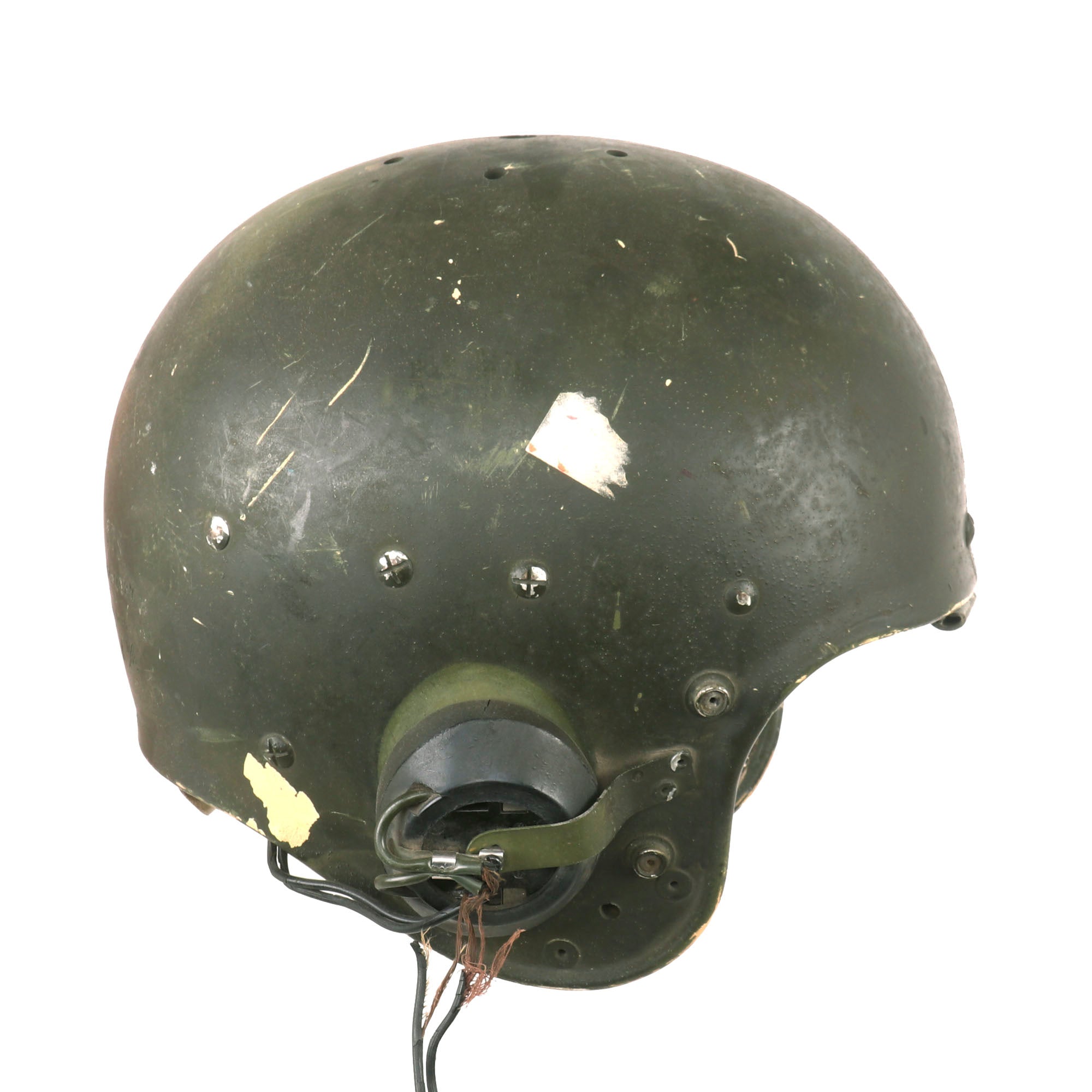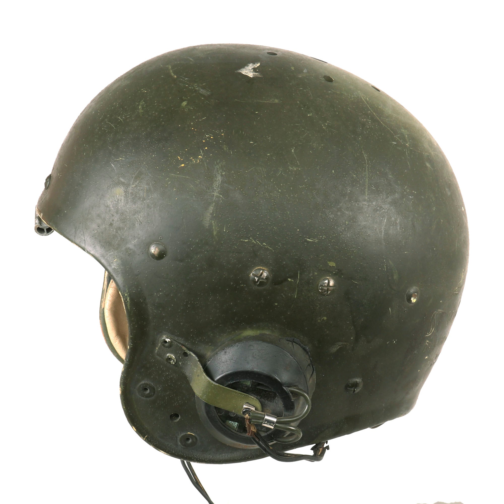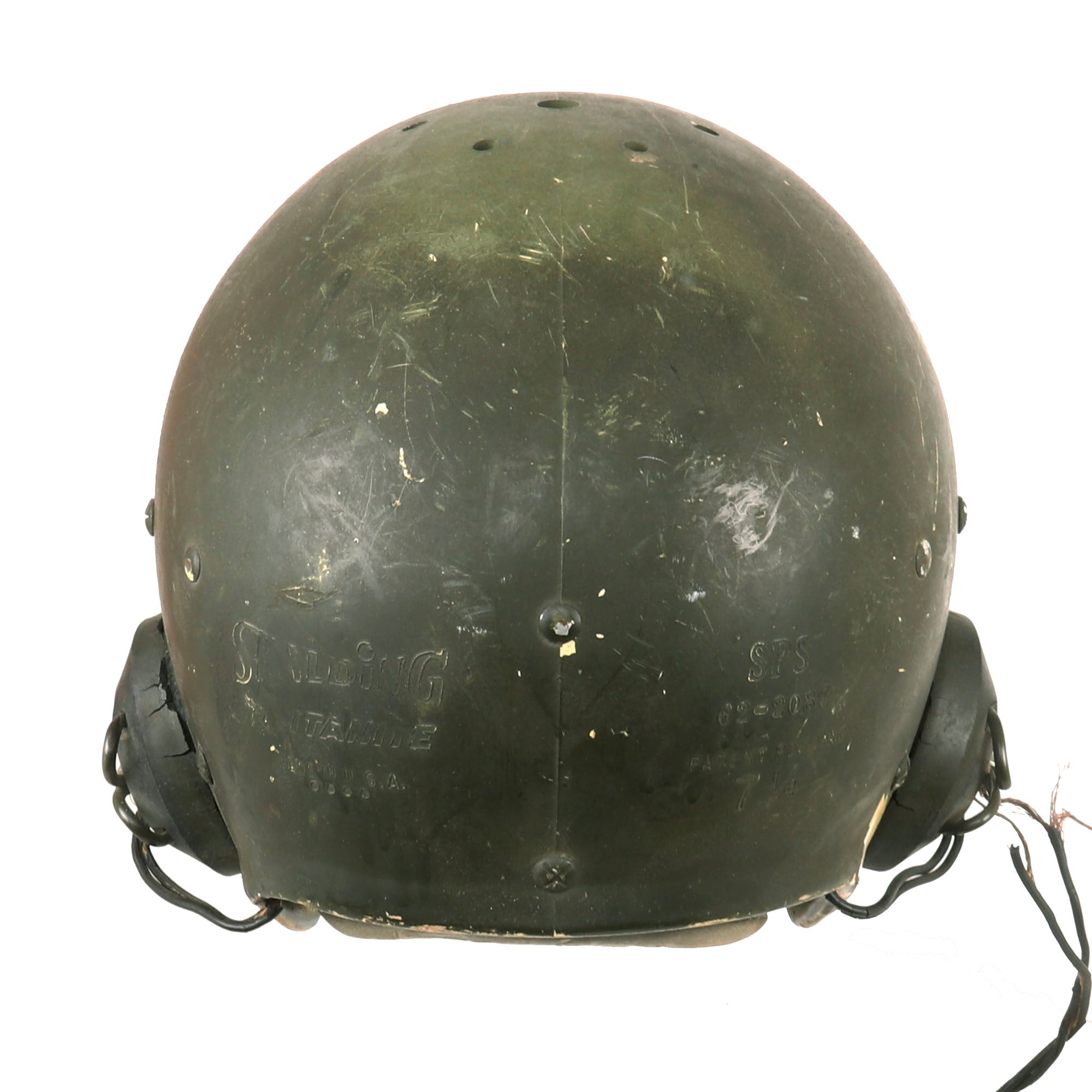 This is a very scarce helmet that was a “stop gap” piece after the WWII Tanker Helmet and before they produced a Tanker specific helmet. The Football helmet was a state of the art lightweight helmet by Spalding with a Titanite shell and interior suspension webbing which even retains the original football helmet pads. Helmet also has additional padding around the crown which is secured with a screw through shell and has metal clips to hold the added ear phones in rubber cups. Helmet is stamped on the back "Spalding Titanite Made in USA" and "SPS 62-2087 7 1/4". Helmet appears complete and is in very good to very good condition with some moderate scuffs and scratches to the OD finish, the ear pads have lost their padding and there is some wear to the rubber earphones, with some damage to the wiring of the earphones.