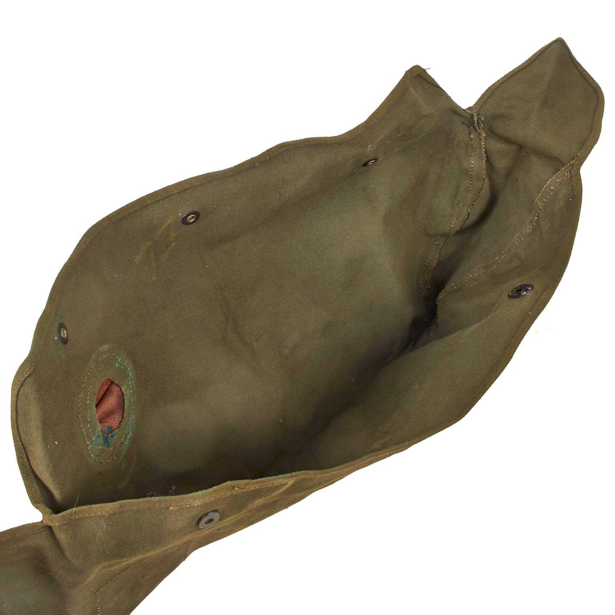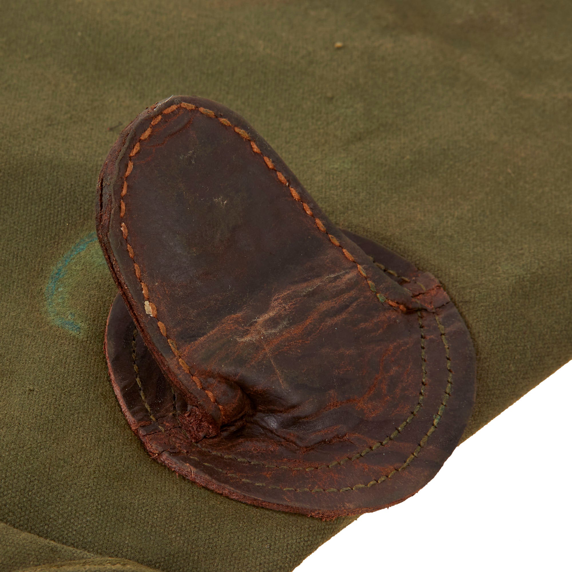 This indicates production in 1954, though it is possible that is just when the MRT (mildew resistant treatment) was applied. The overall length of the cover is approximately 43", and it is in good service-worn condition. There is a bit of staining, and the leather has caused some discoloration where it was in contact with the fabric, but overall it presents very nicely. The leather piece shows some heavy wear and minor dry rot.
