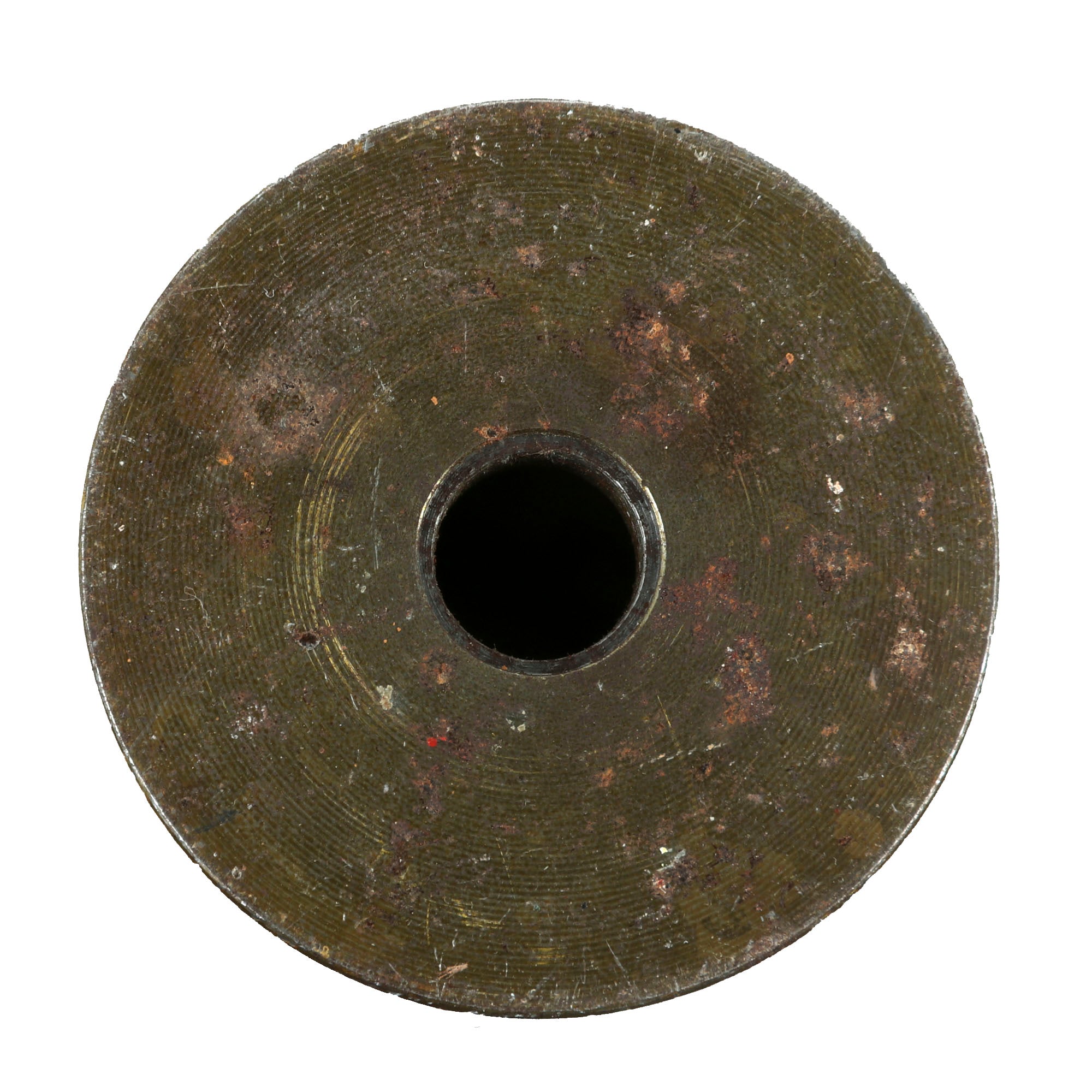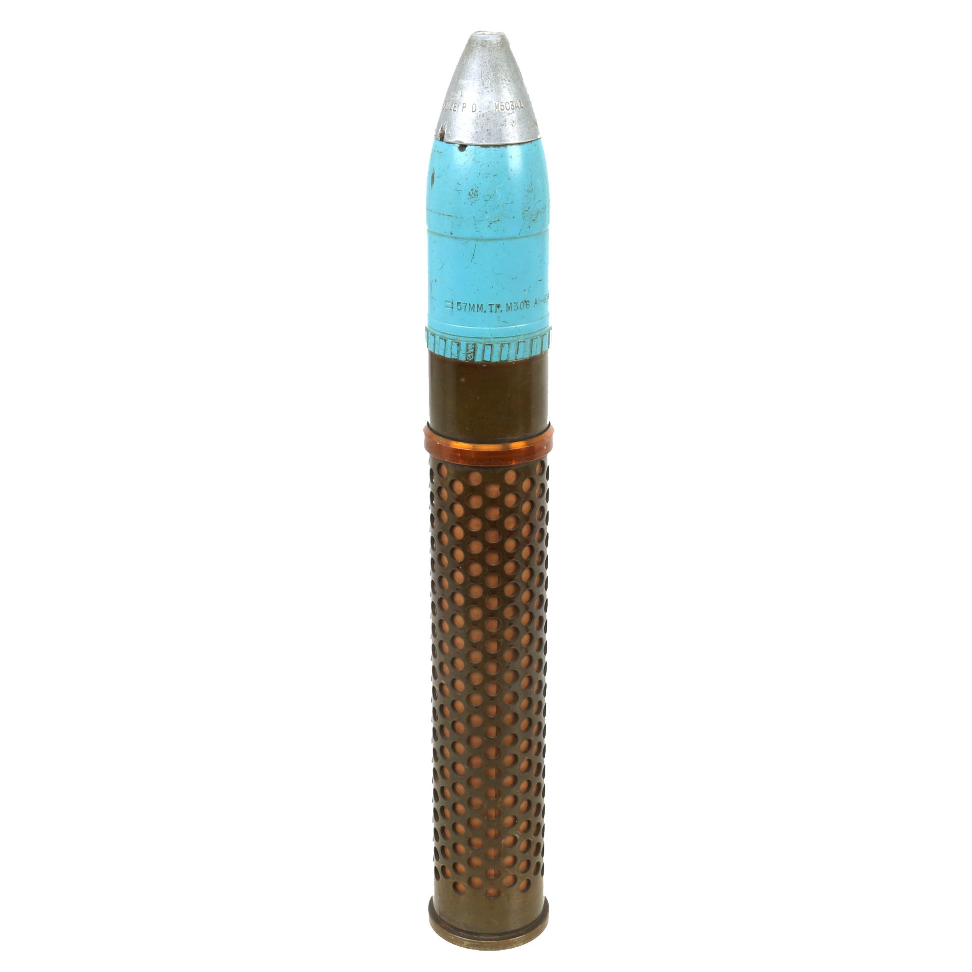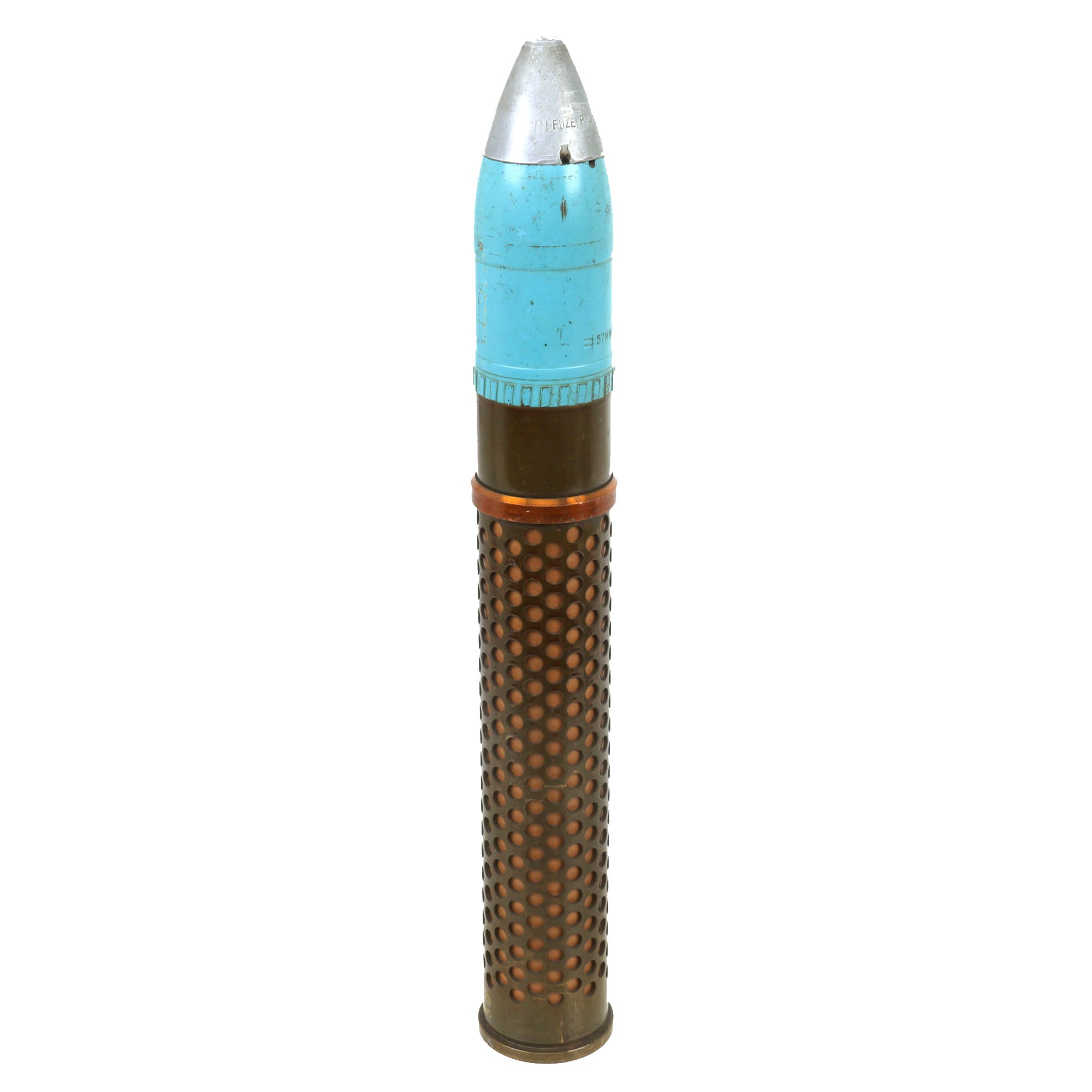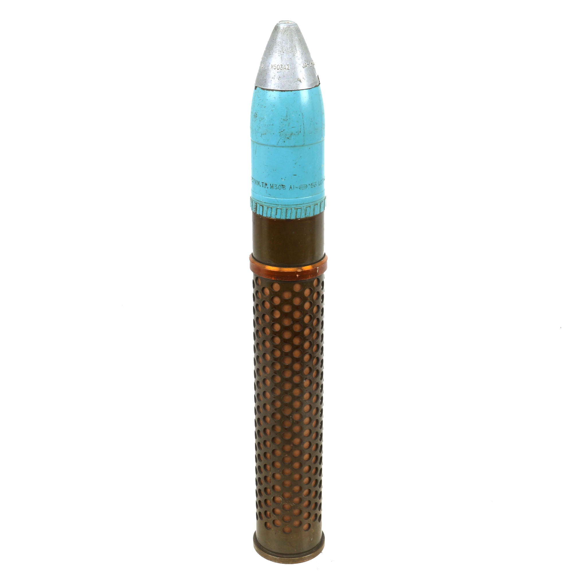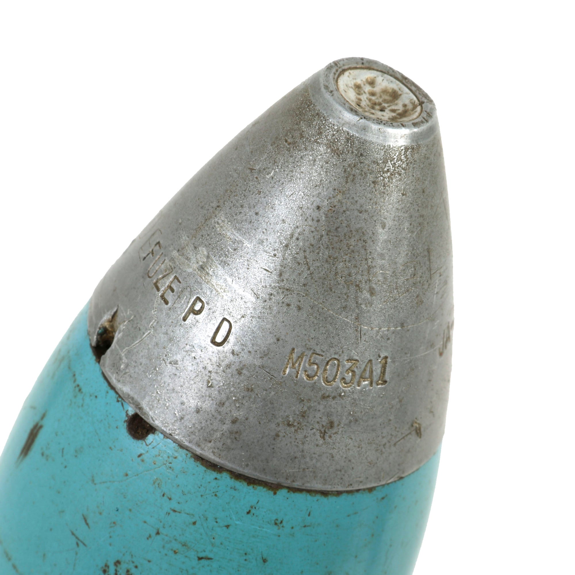The H.E. Shell, T22, was developed to provide a high explosive, anti personnel round for the 57-mm recoilless rifle. This round is provided with a point detonating fuze, M503A1. This example stands at 17 ½” tall and is fitted with a fuse marked FUZE PD M503A1 JA-1-116 9-52. The condition is excellent with much of the original paint having been retained. There is no significant damage present and the projectile is able to be removed from the perforated shell casing for inspection of the interior. The projectile is marked 57MM TP M306 AI-HECO ‘53 LOT-4-305. The shell is stamped near the bottom 37MM M30 / LOT AC 1945, so the shell appears to be WWII production.