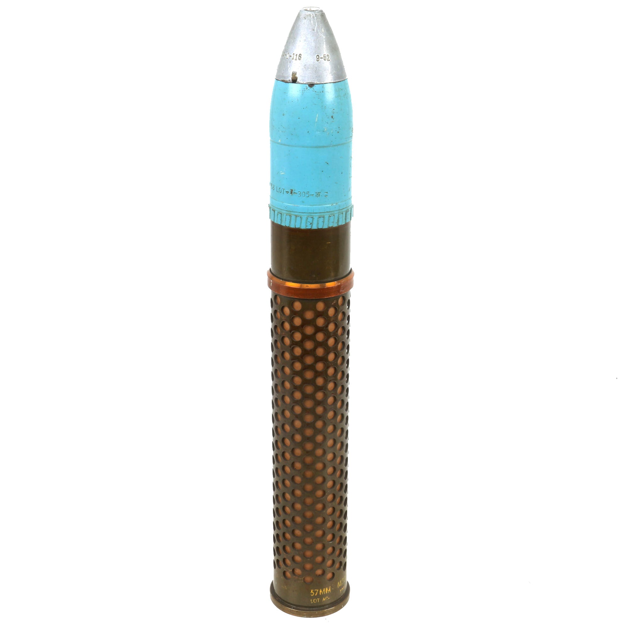 Original Item: Only One Available. This is a wonderful example of a T-22, 57mm HE Round as used with the M18 Shoulder-Fired, Anti-Tank Recoilless Rifle. The round is completely inert and no longer has any explosive charges present and is equipped with a dummy fuse. The round is in total compliance per the current BATF regulations governing inert ordnance.