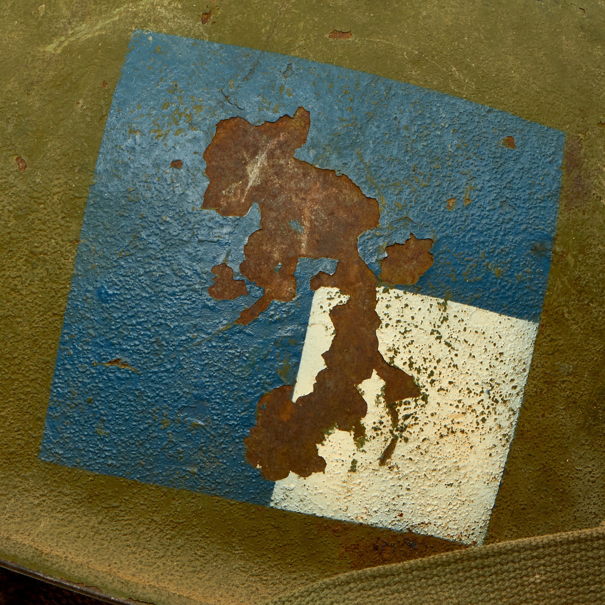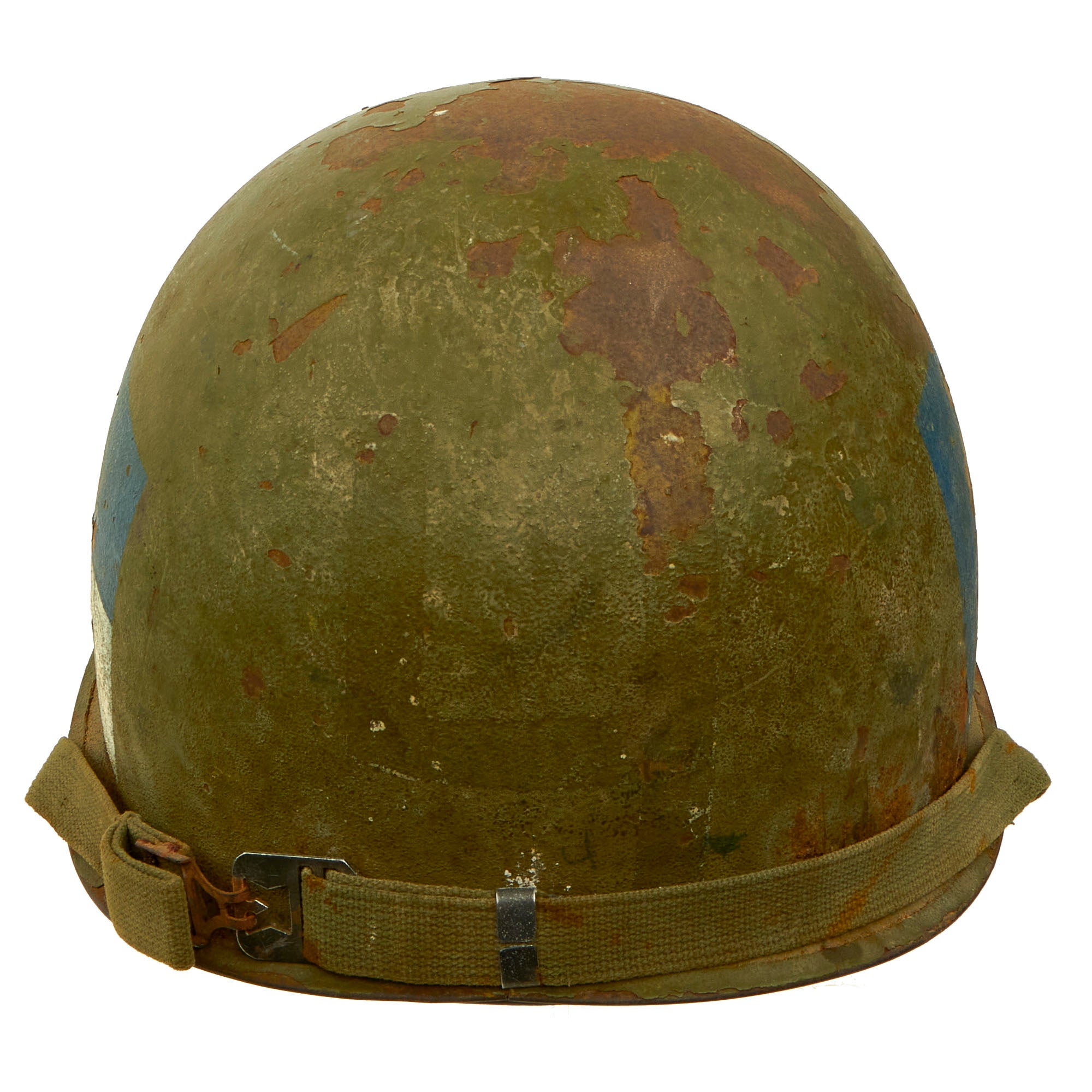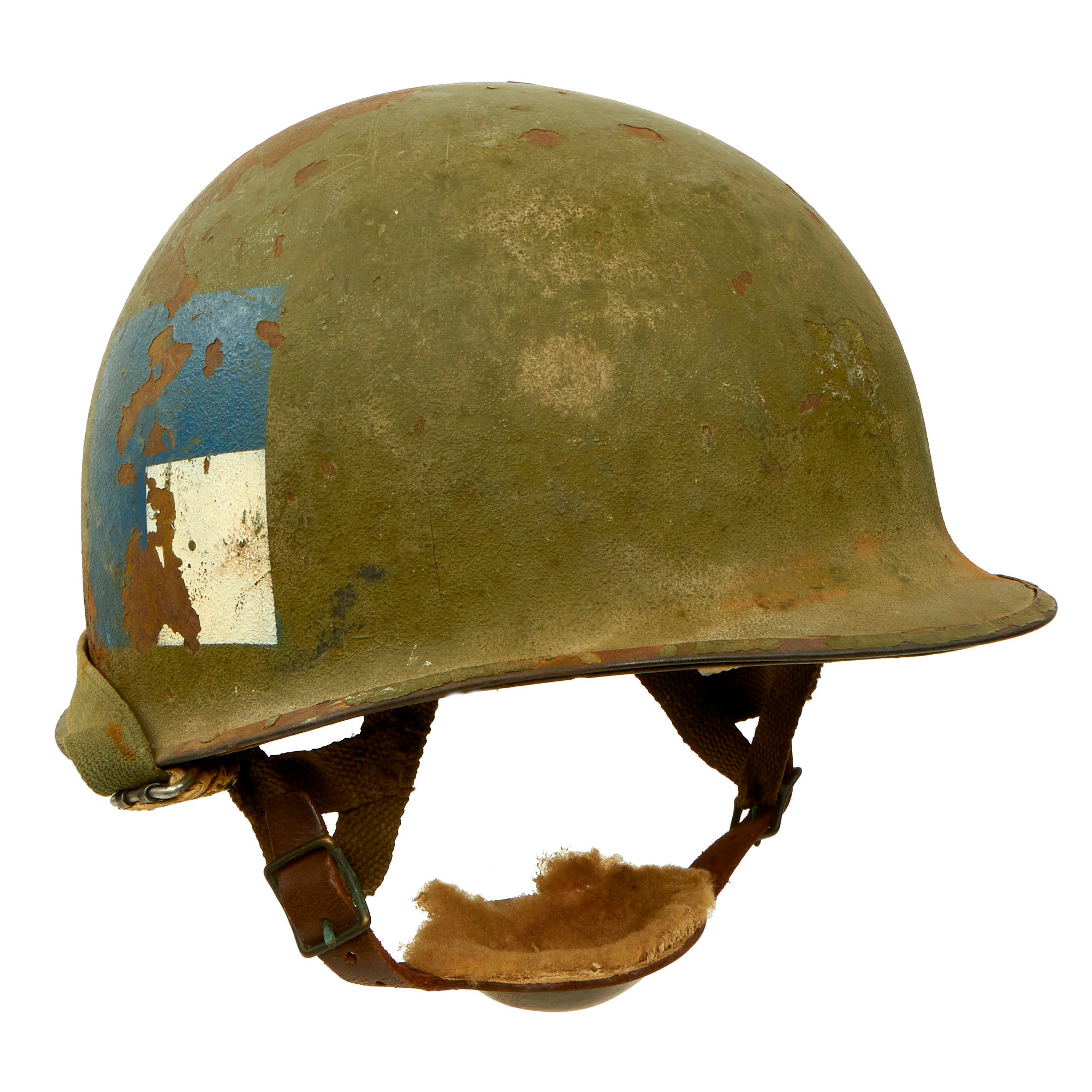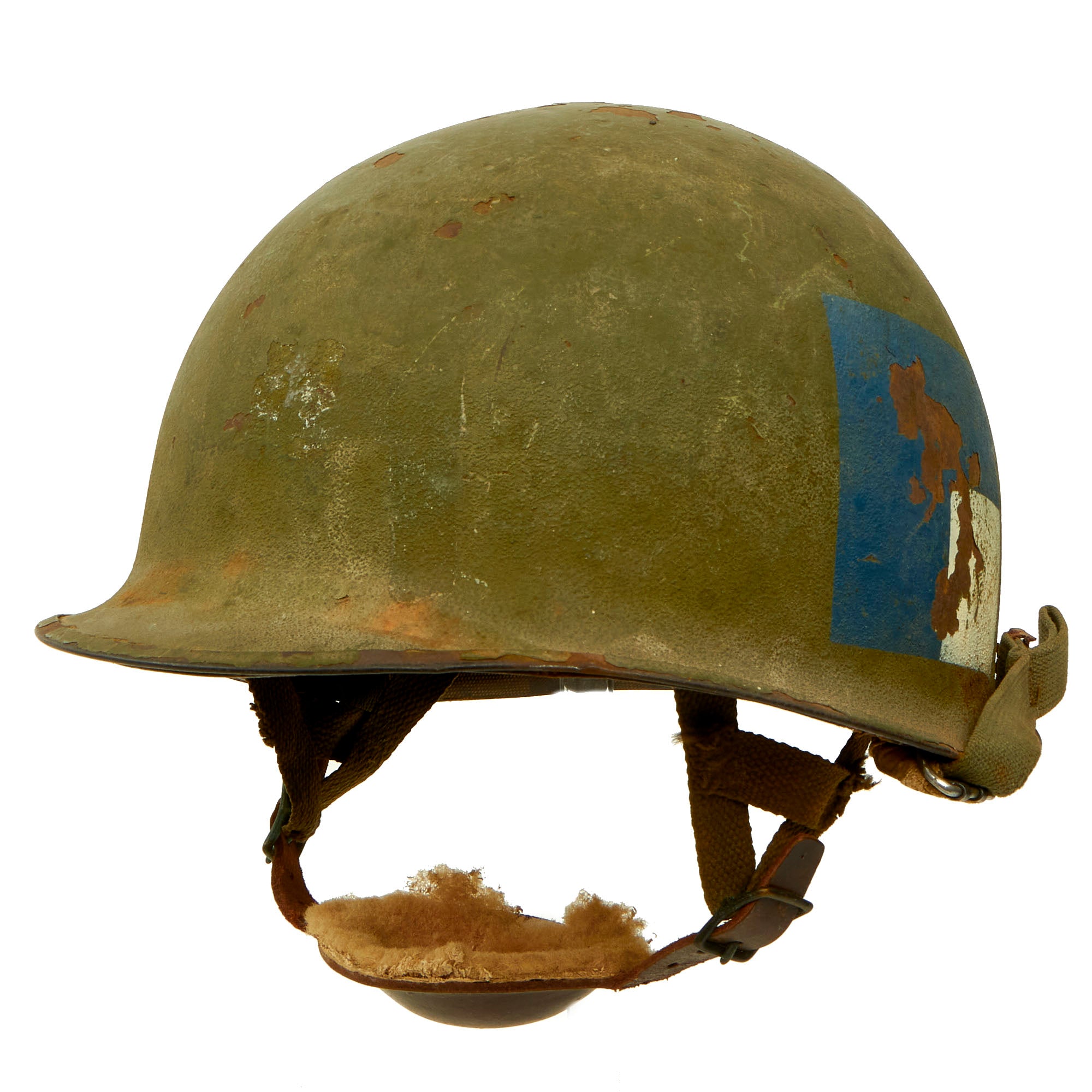 • Original Item: Only One Available. This is a wonderful example of an RCT marked M1-C Airborne helmet, made, used and worn during the Korean War into the Vietnam War. The sides of the shell contains a large blue square with a white square marking on the lower right side. We have encountered this type of marking in the past, and we have not been able to identify it. It came to us as being for the 187th Airborne, but it does not follow their half circle markings as used on their helmets. This is a perfect M1-C candidate for research.