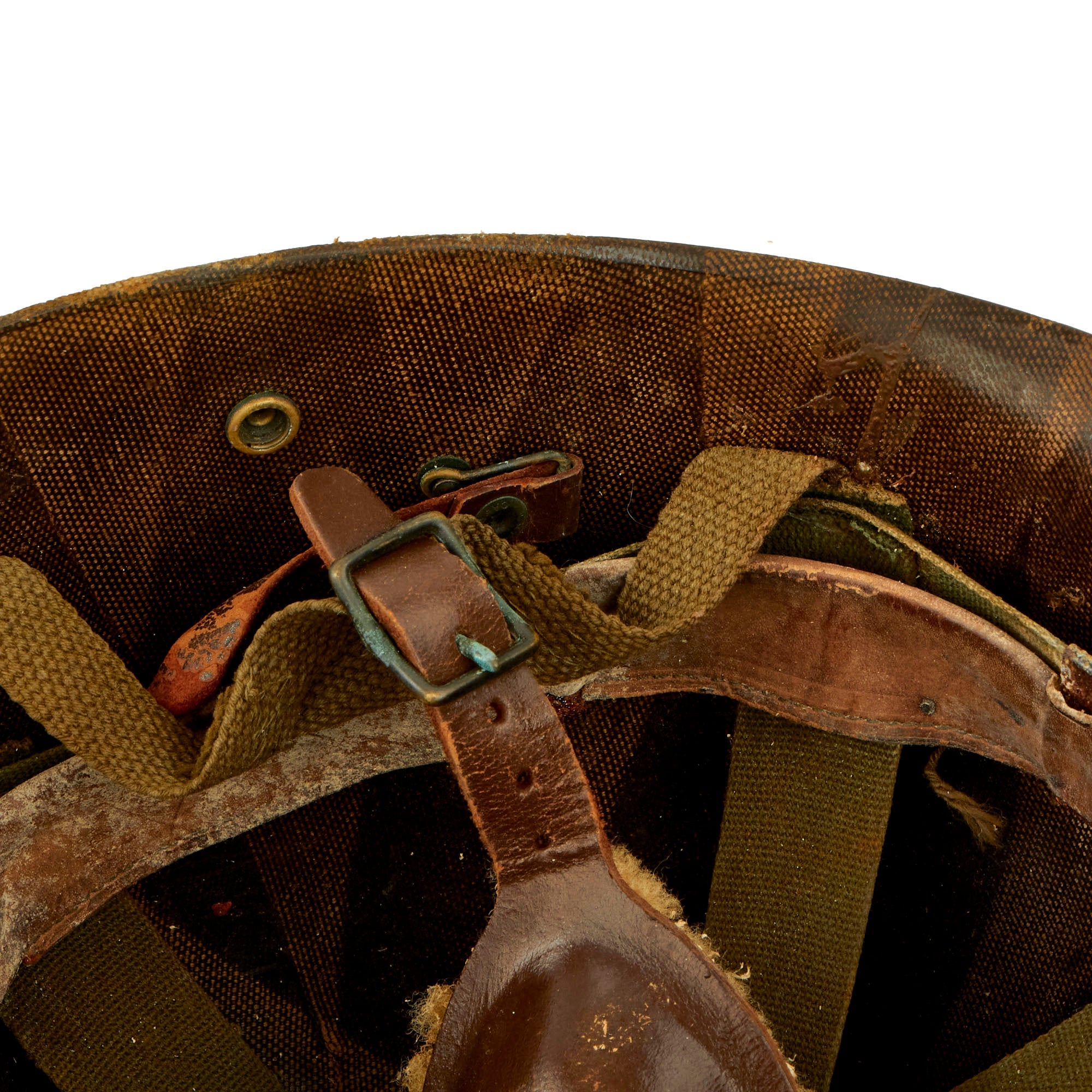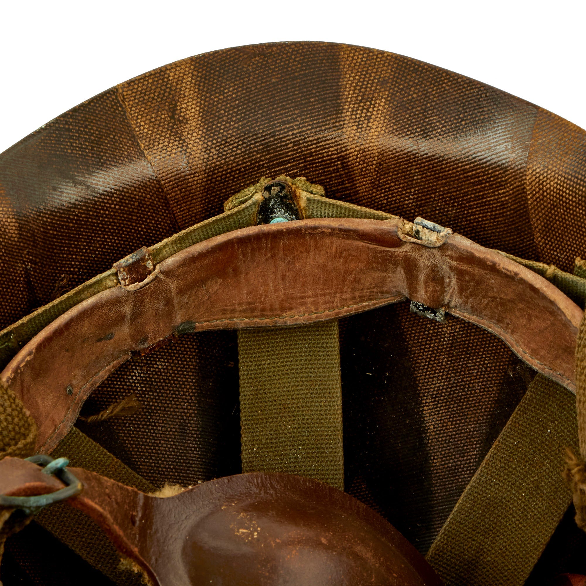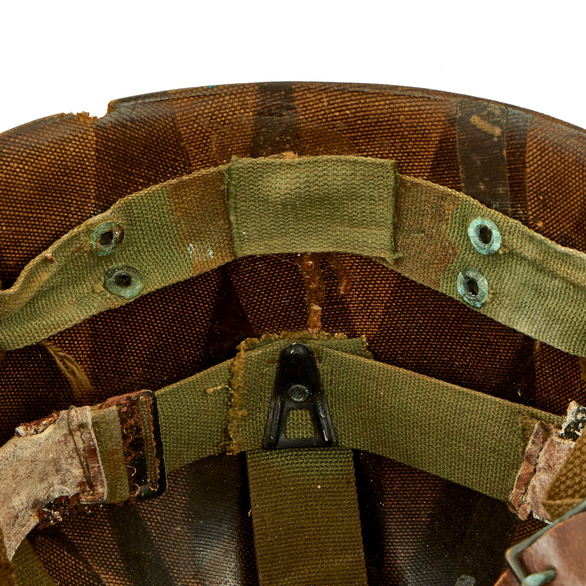 This true US WWII M-1 helmet liner be identified through the frontal eyelet hole. Other correct WWII features include OD Green #3 cotton herringbone twill (HBT) cloth suspension liner, with the webbing in good shape. This HBT suspension is held tightly within the M-1 helmet liner by rivets and a series of triangular "A" washers. The three upper suspension bands are joined together with a shoe string. This way the wearer could adjust the fit. The sweatband is still present, showing moderate use and staining.