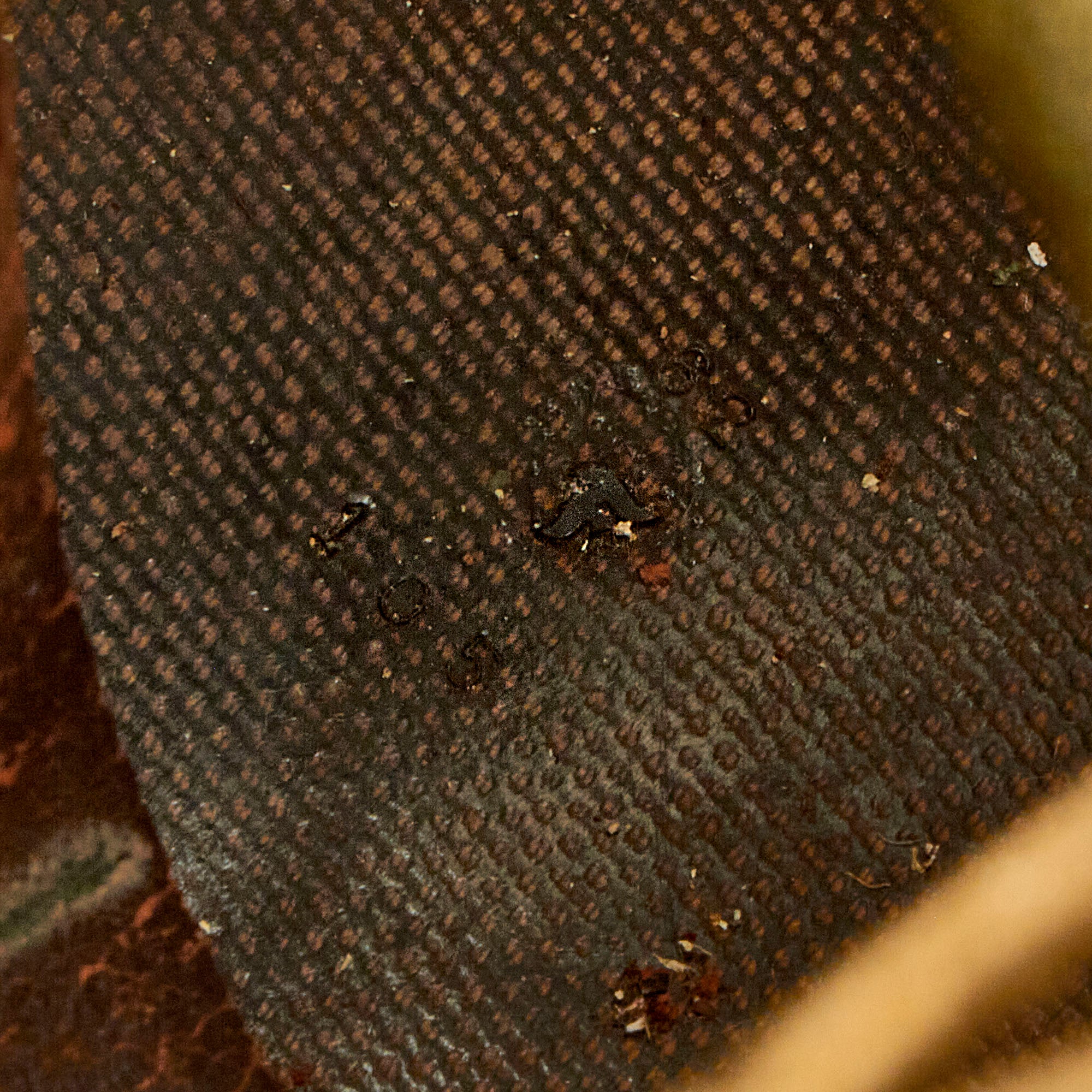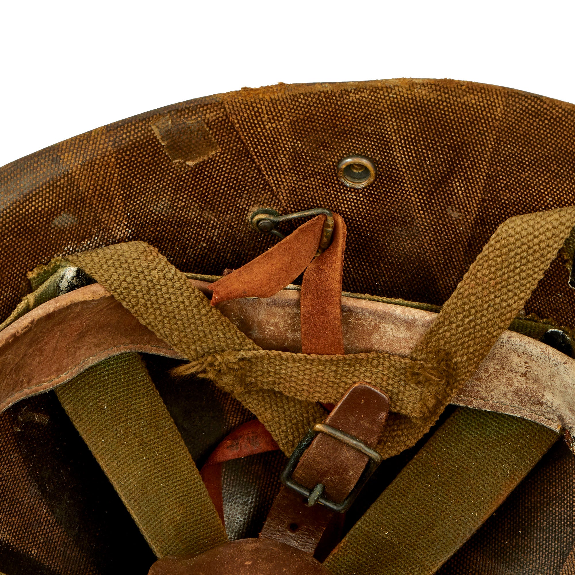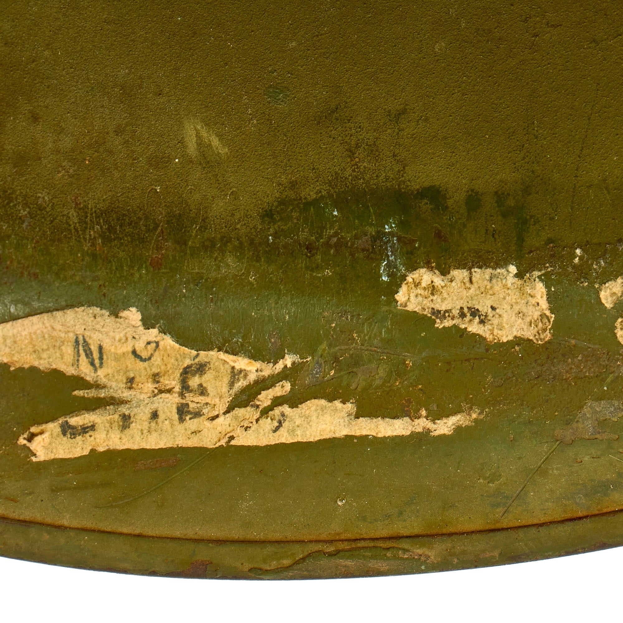 This true US WWII M-1 helmet liner be identified through the frontal eyelet hole. Other correct WWII features include OD Green #3 cotton herringbone twill (HBT) cloth suspension liner, with the webbing in good shape. This HBT suspension is held tightly within the M-1 helmet liner by rivets and a series of triangular "A" washers. The three upper suspension bands are joined together with a shoe string. This way the wearer could adjust the fit. The sweatband is still present, showing moderate use and staining.