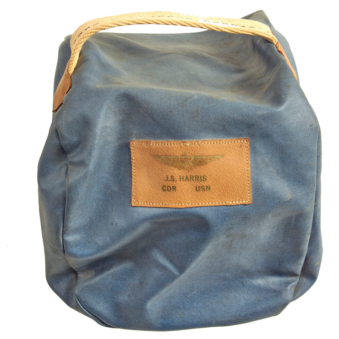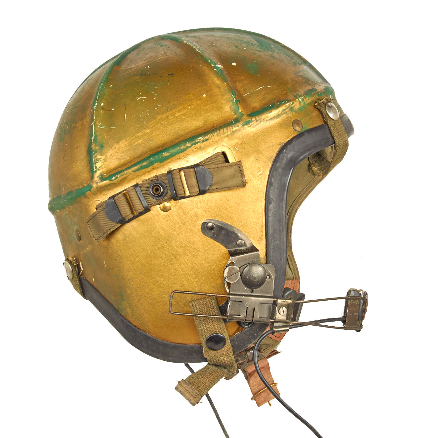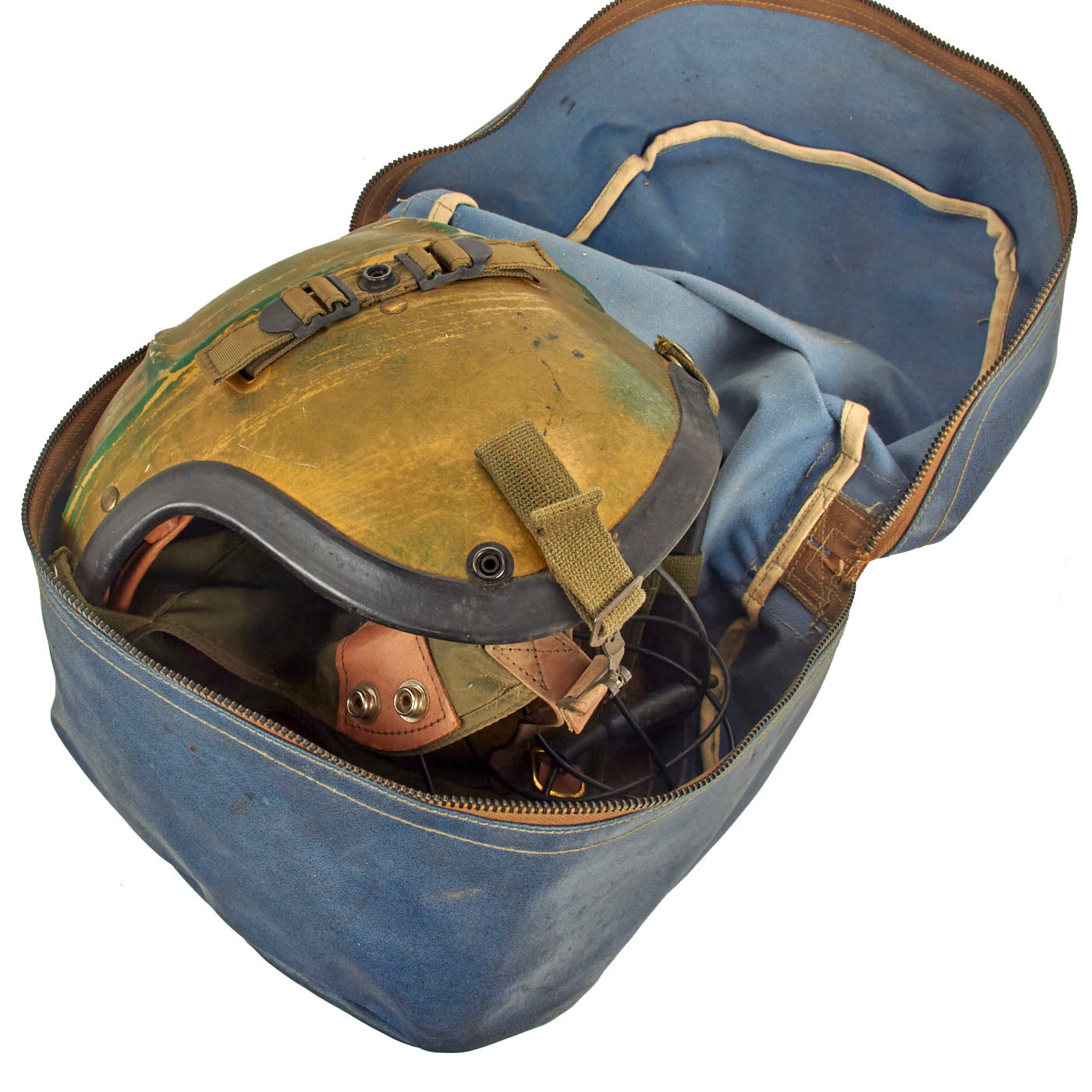 Original Items: Only One Available. This is an excellent condition, 1950s USN size “X-LARGE” Gentex H-3 helmet that comes complete with an internal cloth helmet “EX-LARGE” which contains the ear phones and boom mic. Helmet features original gold paint and USN / USMC Aviator wings to front. All parts are in very good to excellent condition. Also included is a wonderful helmet bag which has the pilot’s name rank and branch on a leather name tag: