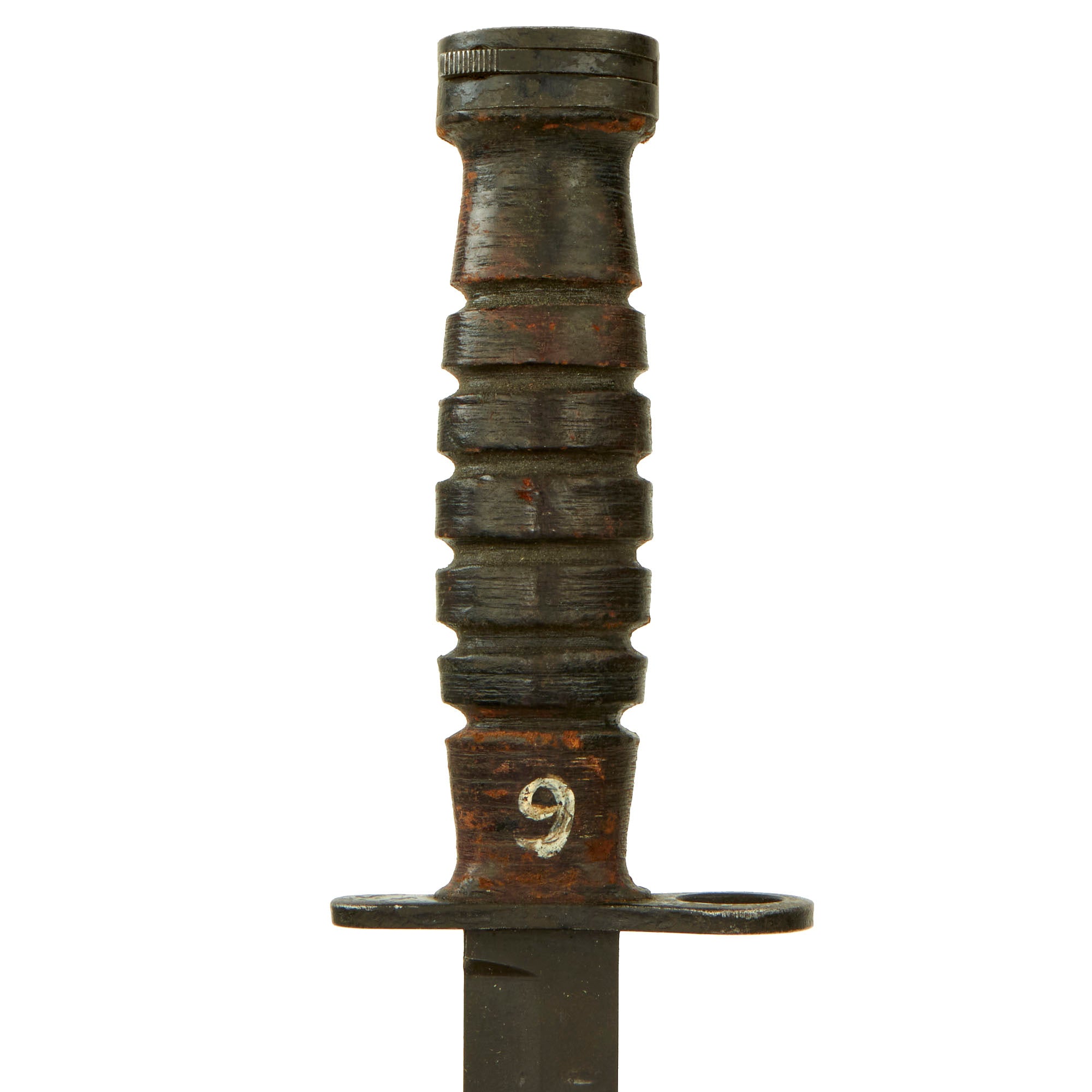 These are generally considered to be of good construction, but definitely not as collectible as the U.S. made versions. These were originally produced to meet the demand for bayonet when many M1 Carbines were released from surplus. This one is still in great shape, with a nice blued body and factory lower edge. The upper edge has been sharpened somewhat. The pommel lock works fine, and it's altogether solid, though the crossguard wiggles a tiny bit.