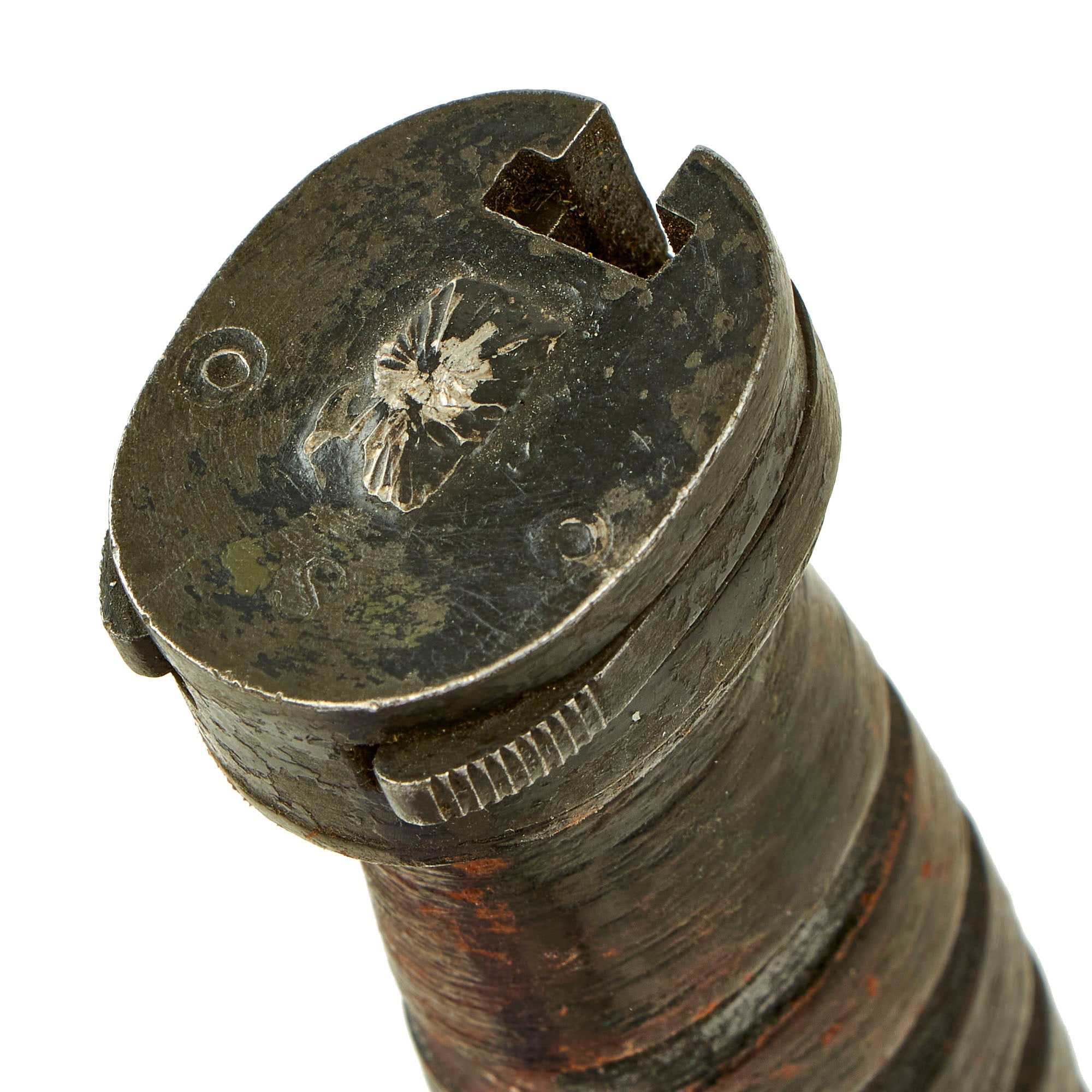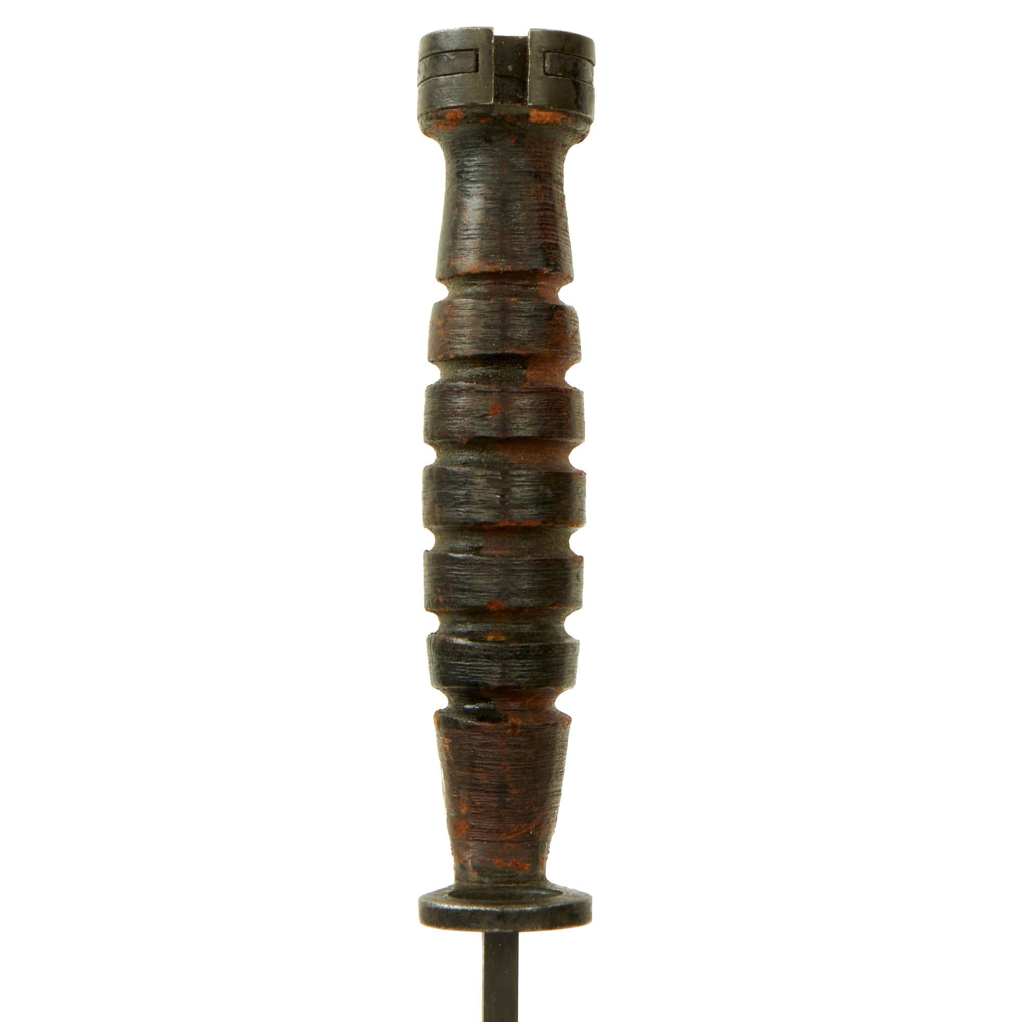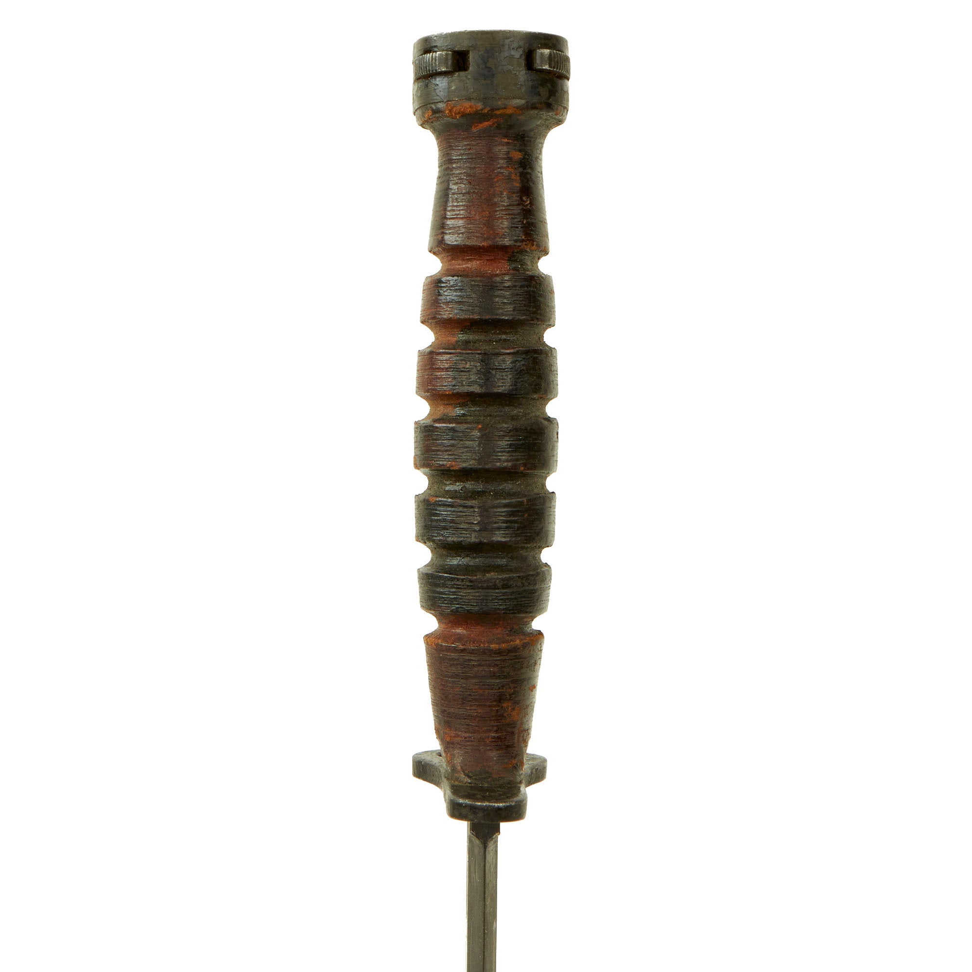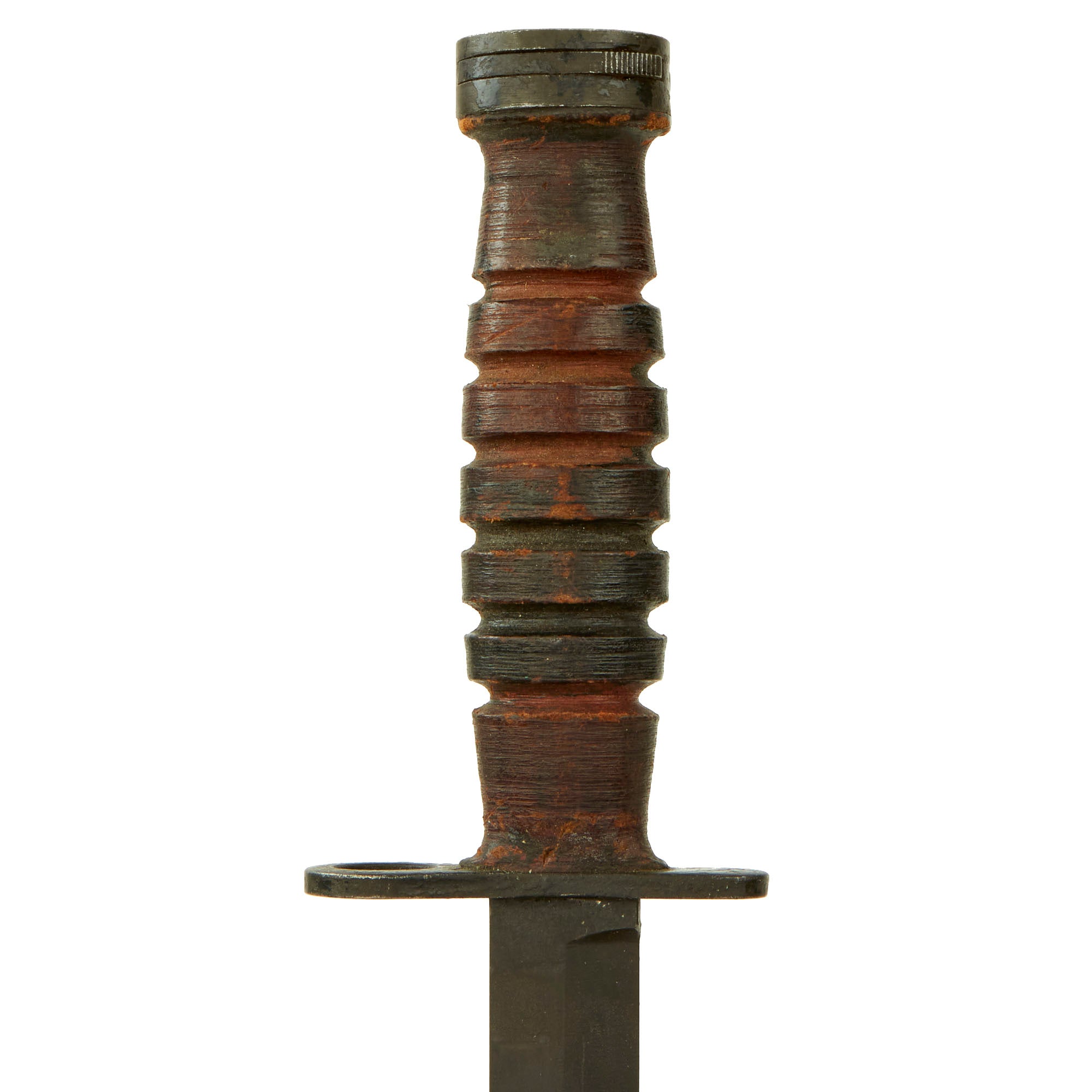 Original Item: Only One Available. This is something rather interesting, which we have not had before. At first glance, we assumed this was a typical U.S. Made M4 bayonet, with a WWII Period stacked leather grip. However, it is not marked as it should be, so we assumed it was a Korean-made example. However further inspection showed a faint U.S.J. M4 / S.I. stamped on the crossguard, so this is definitely a Japanese-Made M4 Bayonet for the M1 and M2 carbine. Unlike the preceding bayonets that are commercial copies, this next bayonet is an extremely well made substantial bayonet. It is the same quality as the US military contract bayonets. It has a segmented leather grip with six grooves. It does not have the resin spacers at either end. All metal parts are Parkerized. According to M. H. Cole in Book IV, these bayonets were made in Japan under U.S. control most likely during the Korean War.