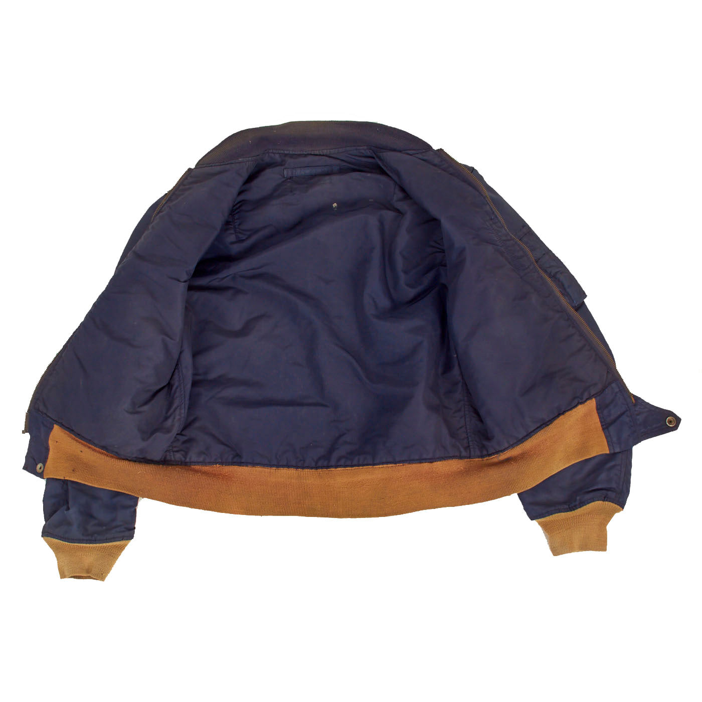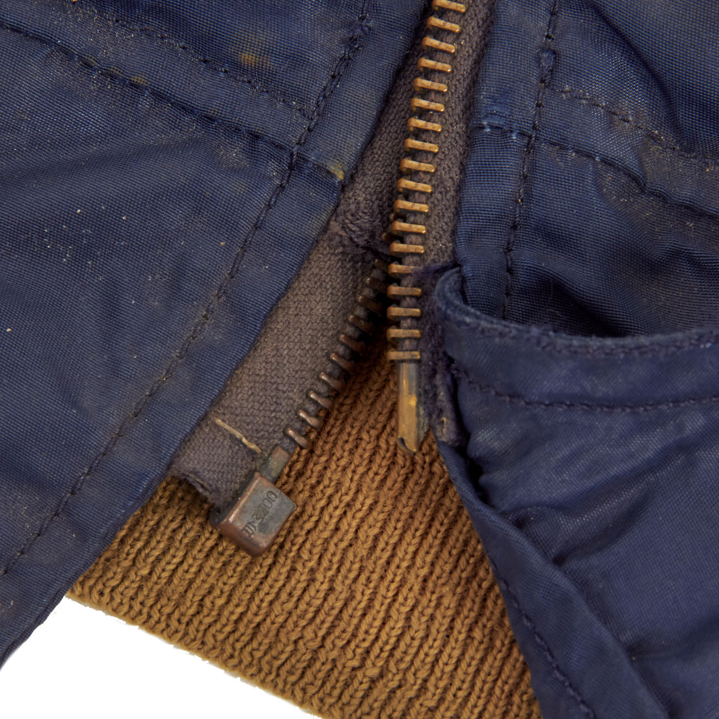 The jacket is made from nylon with wool knit collars, cuffs, and waist. The shoulders feature snap down epaulets and the left sleeve has a zip pocket and pen-holders. The last detail is a small triangular snap at the waist. The jacket is in very good condition, however it does show signs of service use and wear. The most noticeable issue is that the slider for the front zipper closure is missing, and there is also a tear in the right zipper track. The left arm pocket zipper is intact, but very stiff.