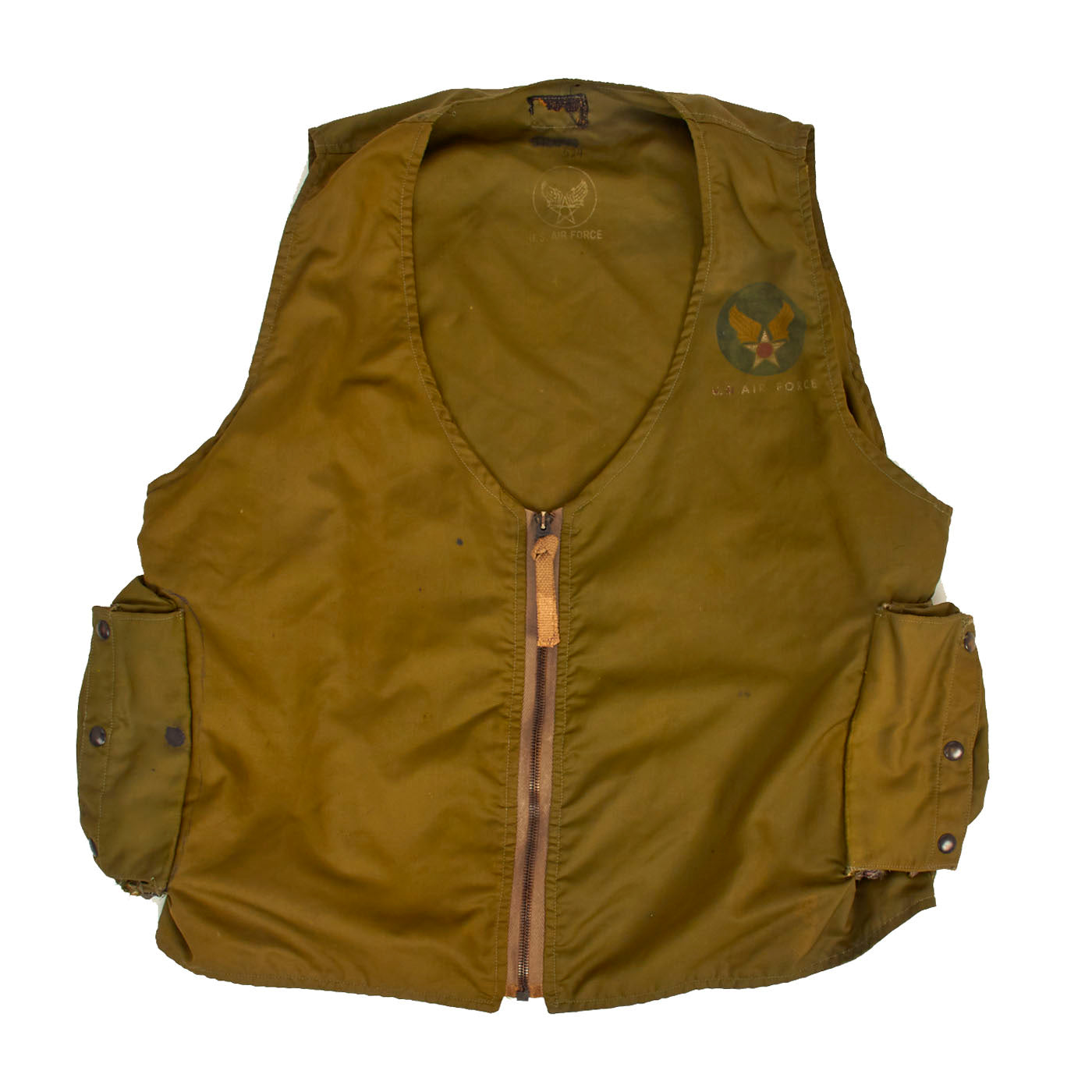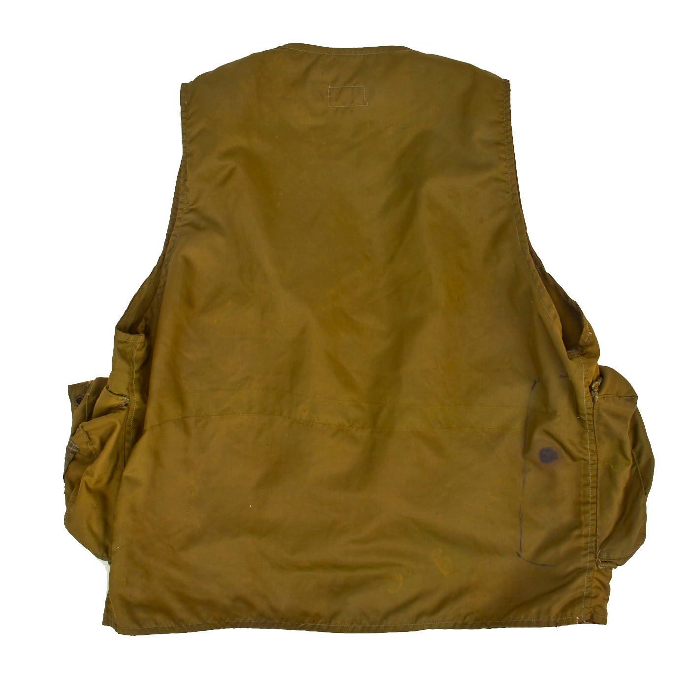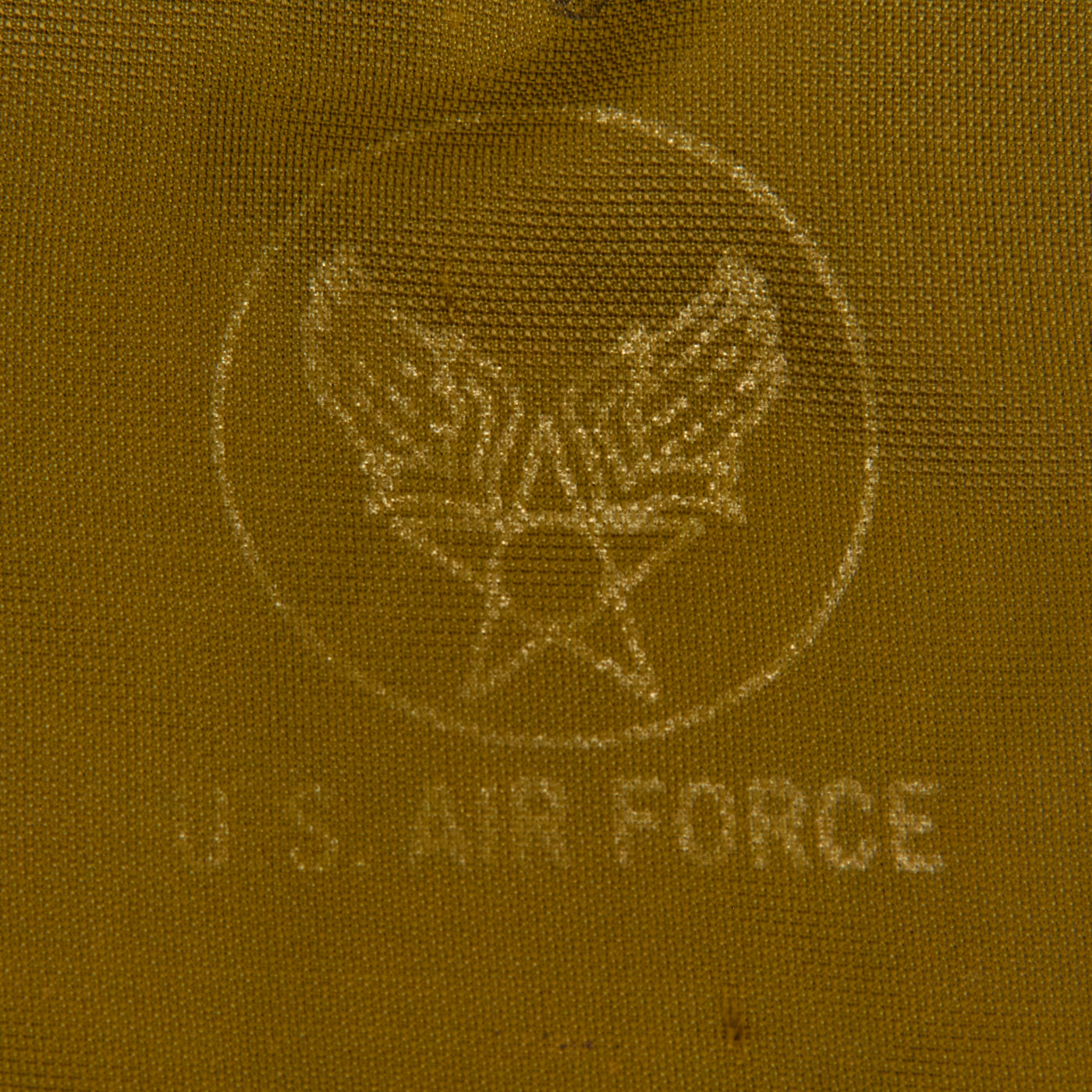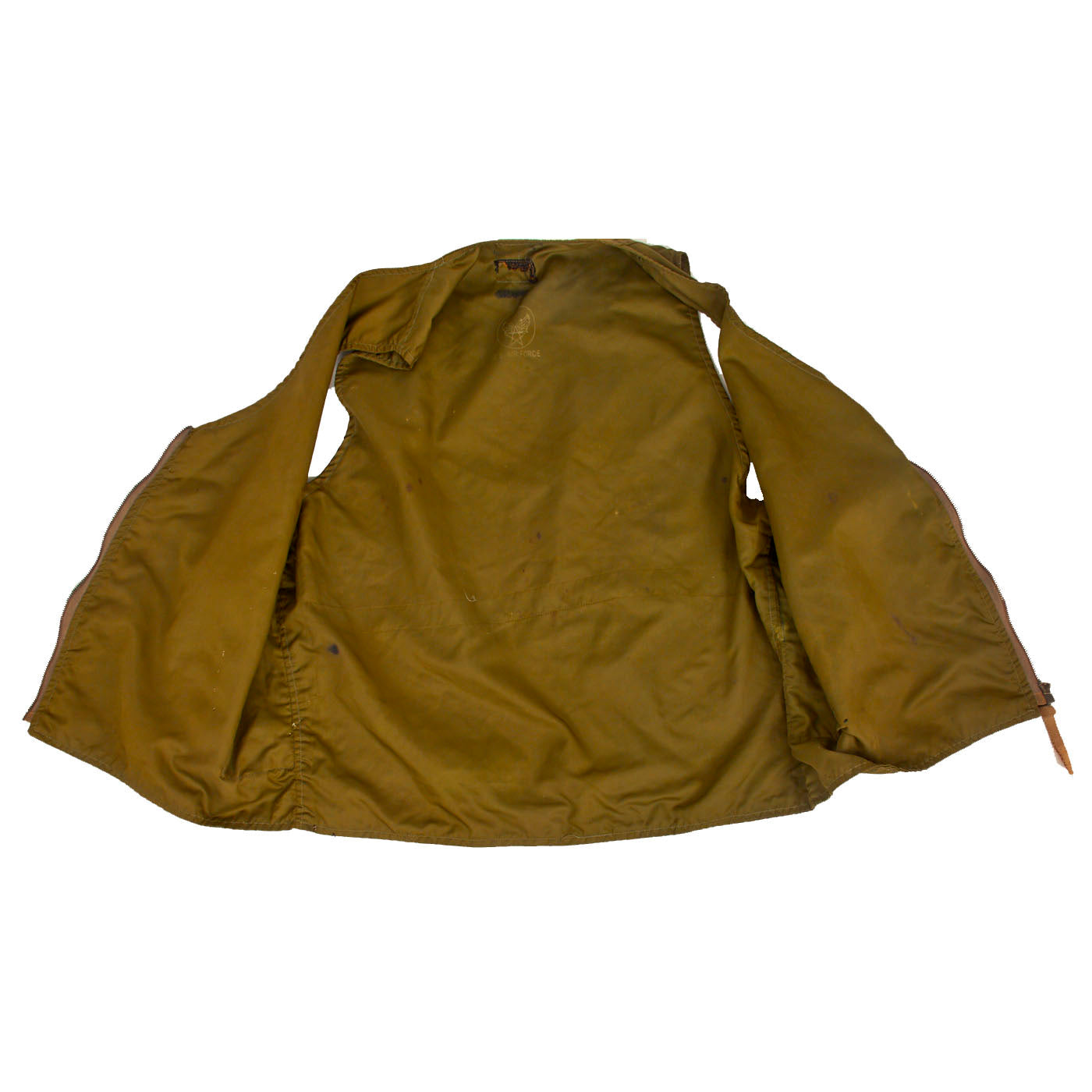 Accompanying the L2A is the rare E-1 USAF marked radio vest. The vest was originally developed in the late 1940s and it was designed to enable pilots to carry a survival radio in emergency situations. Normally worn over coveralls and flight jackets, the water-repellent E-1 features two pockets to carry a radio and battery. Originally there was a belt that was worn around the vest, but unfortunately it is missing on this example. Additional features on the vest is a front zipper closure as well as a faded USAF insignia on the left side. The “US” in “US Air Force” has “UN” written over it in red ink, which was a common sight during the Korean War.