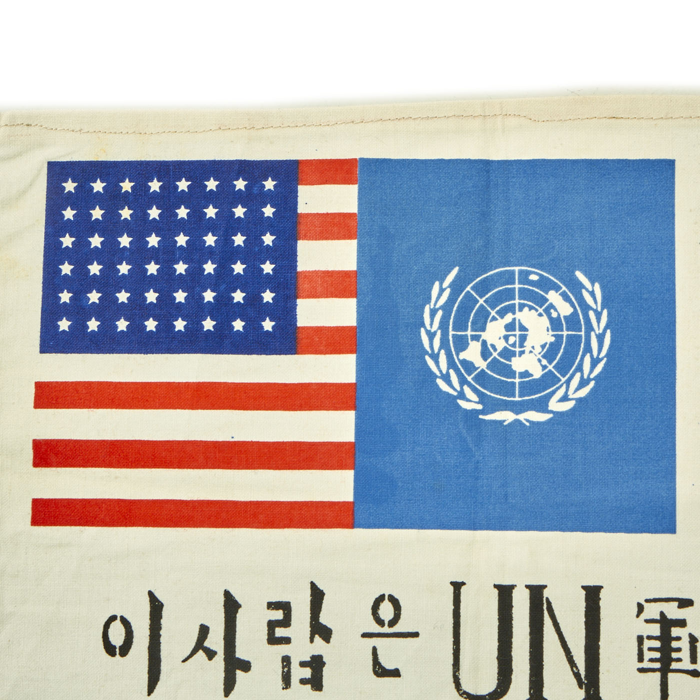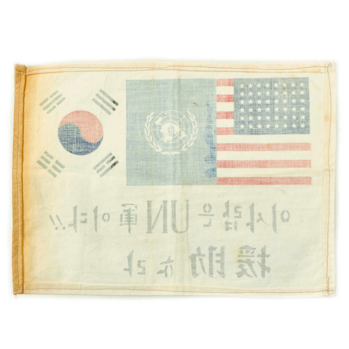 Original Item: Only One Available. Blood chits were used by U.S. aviators as a way of communicating with non-English-speaking people. Made of leather, cotton, silk, or rayon, they served as a safe-conduct pass for a downed aviator in need of help from local people. This blood chit used during the Korean War is fabric embroidered with the U.S. flag, Japanese, Korean and the UN flag. Normally it would have been accompanied with text that read:
