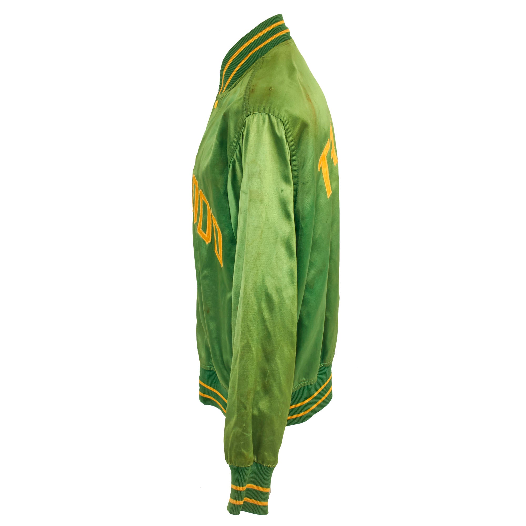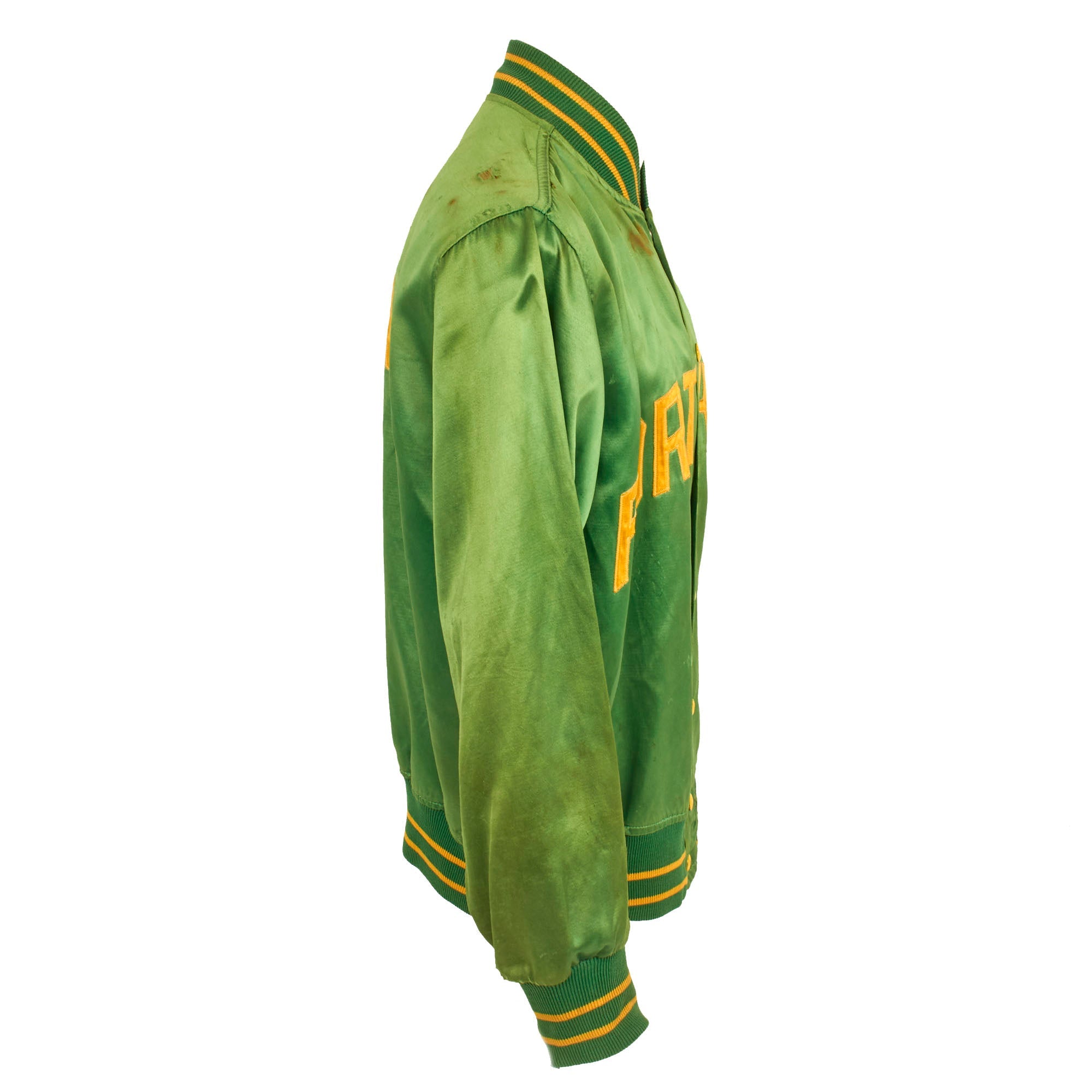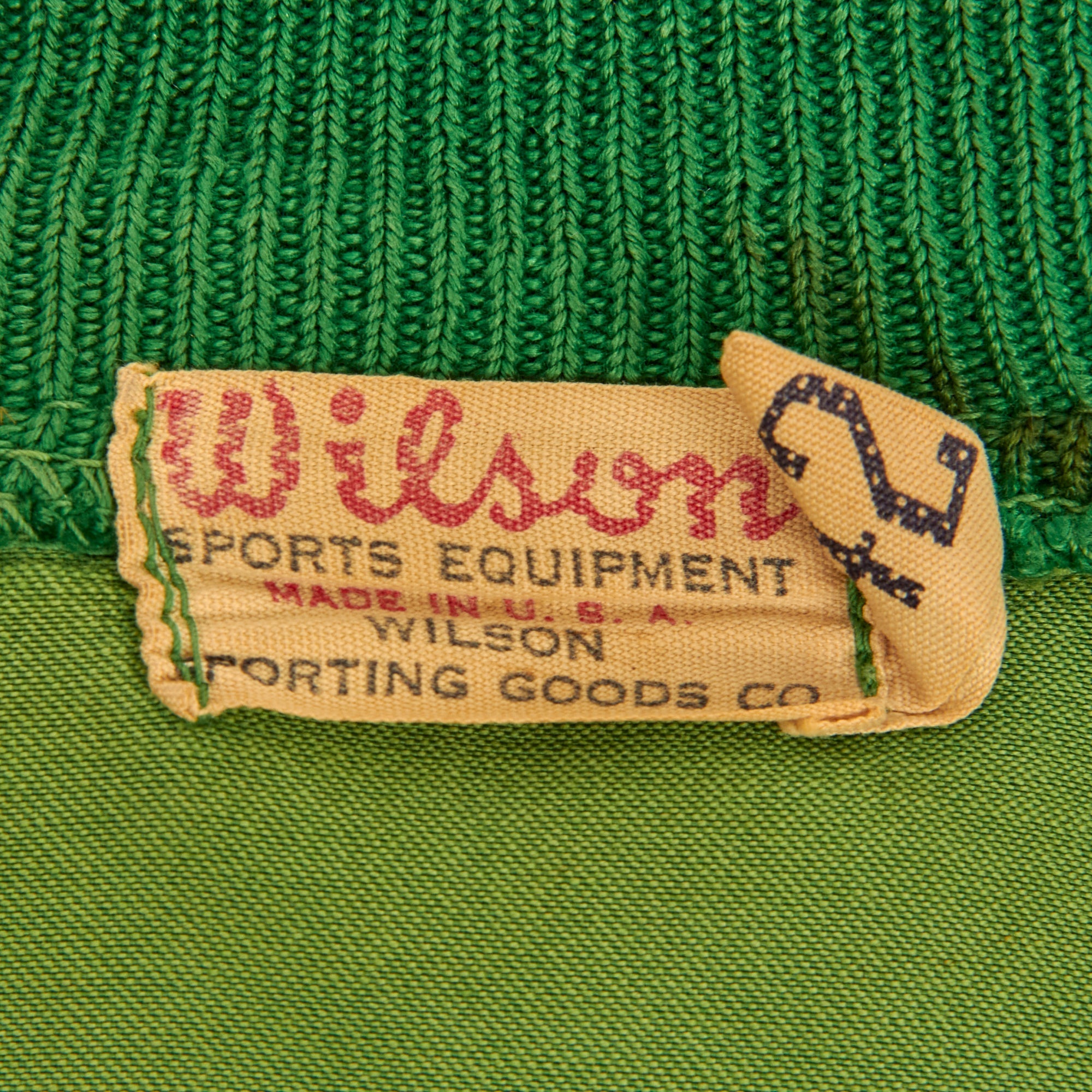 The jacket is in good condition but it does show wear and tear as well as some staining, which is expected with any piece of sports equipment. There are no dates or names present, only the Wilson Sports Equipment tag and the size 42 tag. All buttons are present and functional.