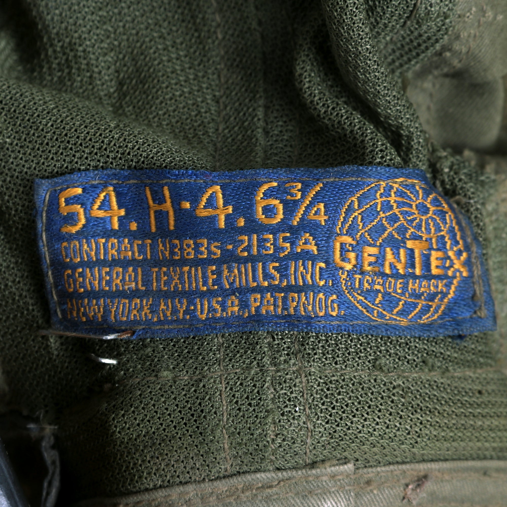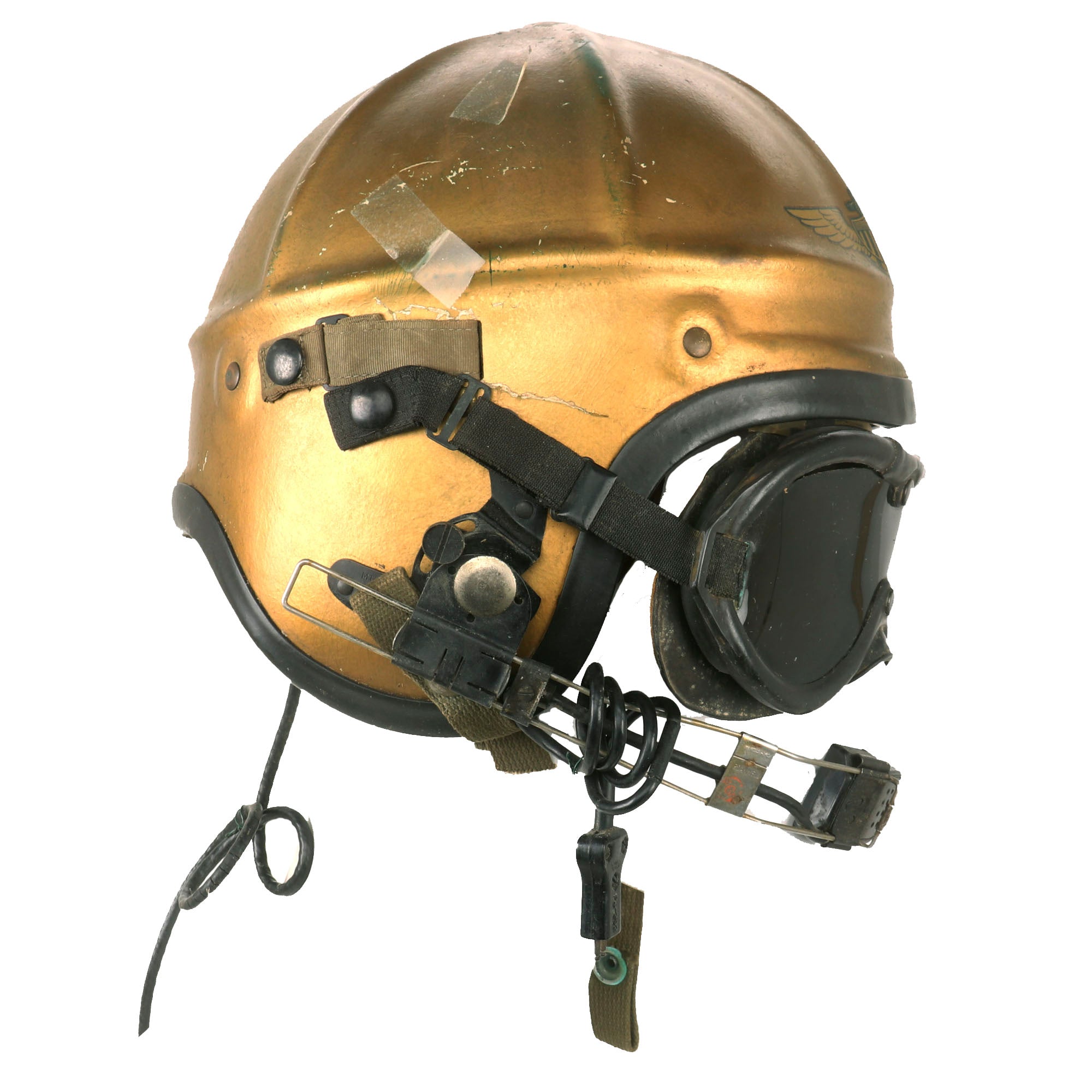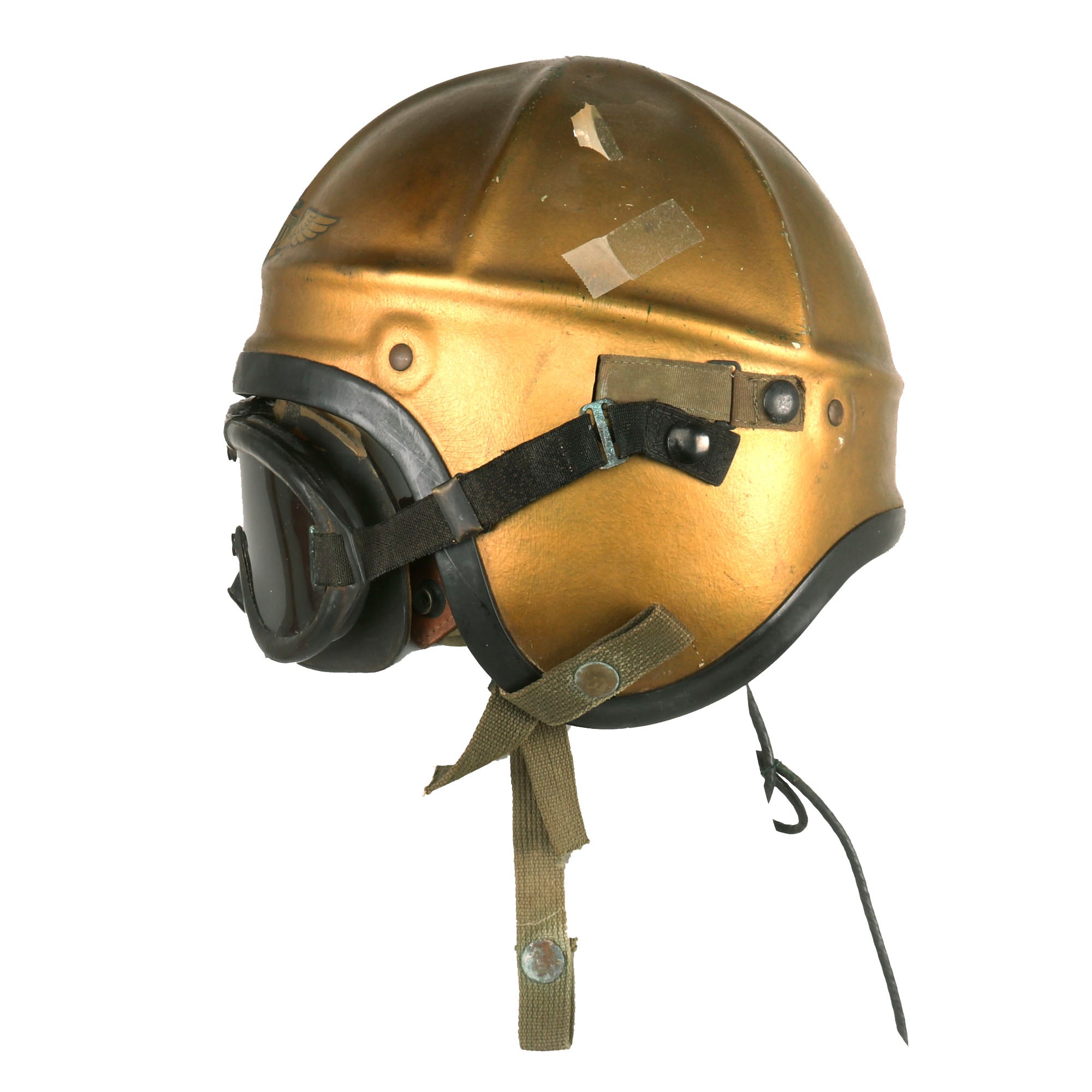 Original Items: Only One Available. This is a very nice 1950s USN size “Small” Gentex H-4 helmet that comes with correct U.S. Navy Marked “Snap-On” Goggles and a Summer Flying Helmet (Marked size Large) by General Textile Mills. Helmet features original gold and green paint with USN/USMC Aviator wings to front. All parts are in good condition.