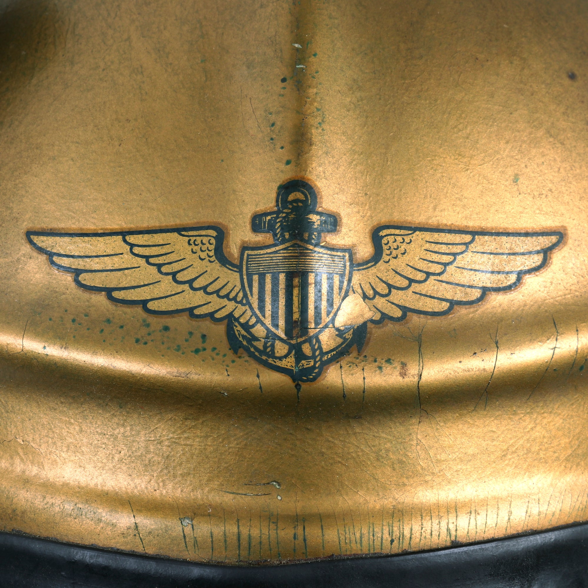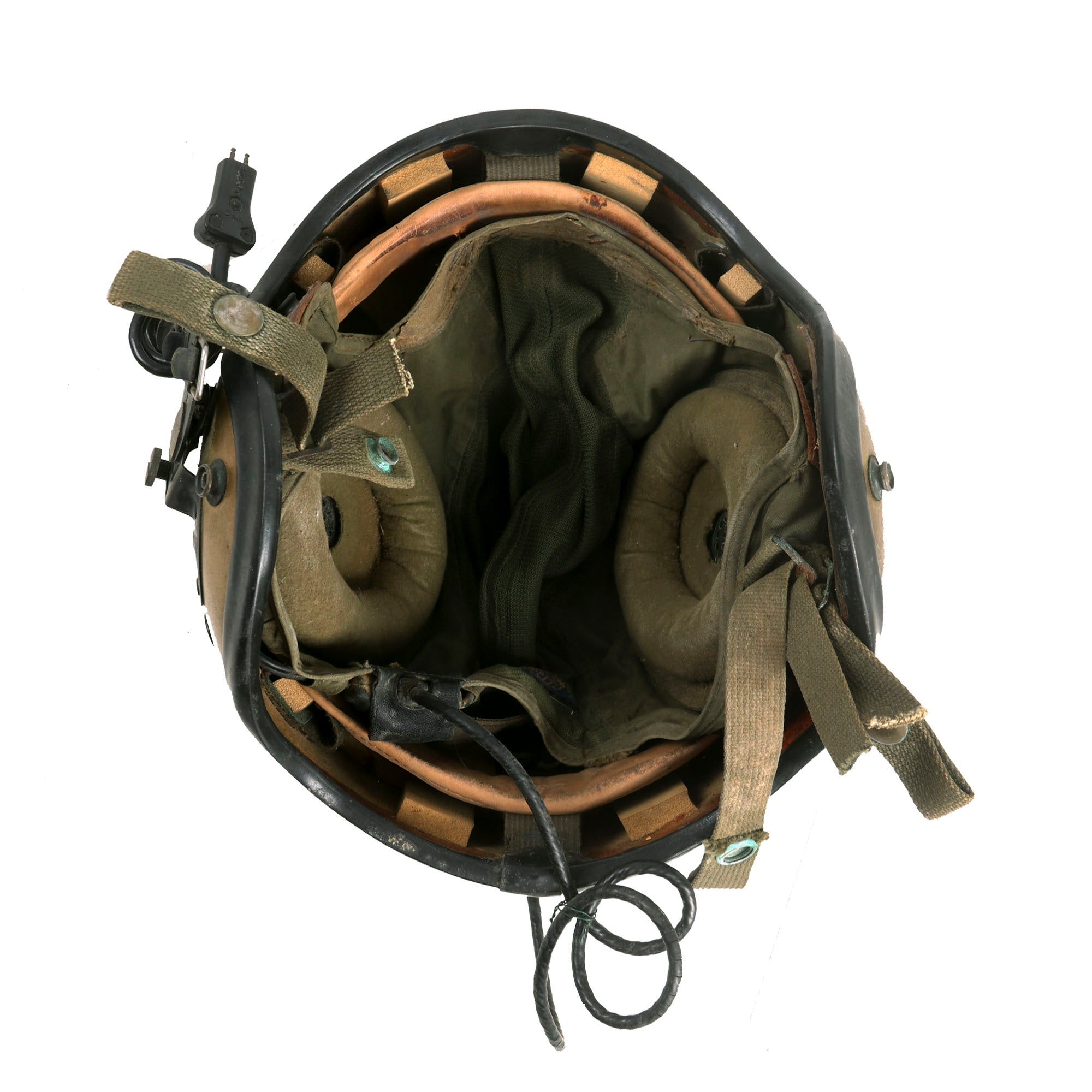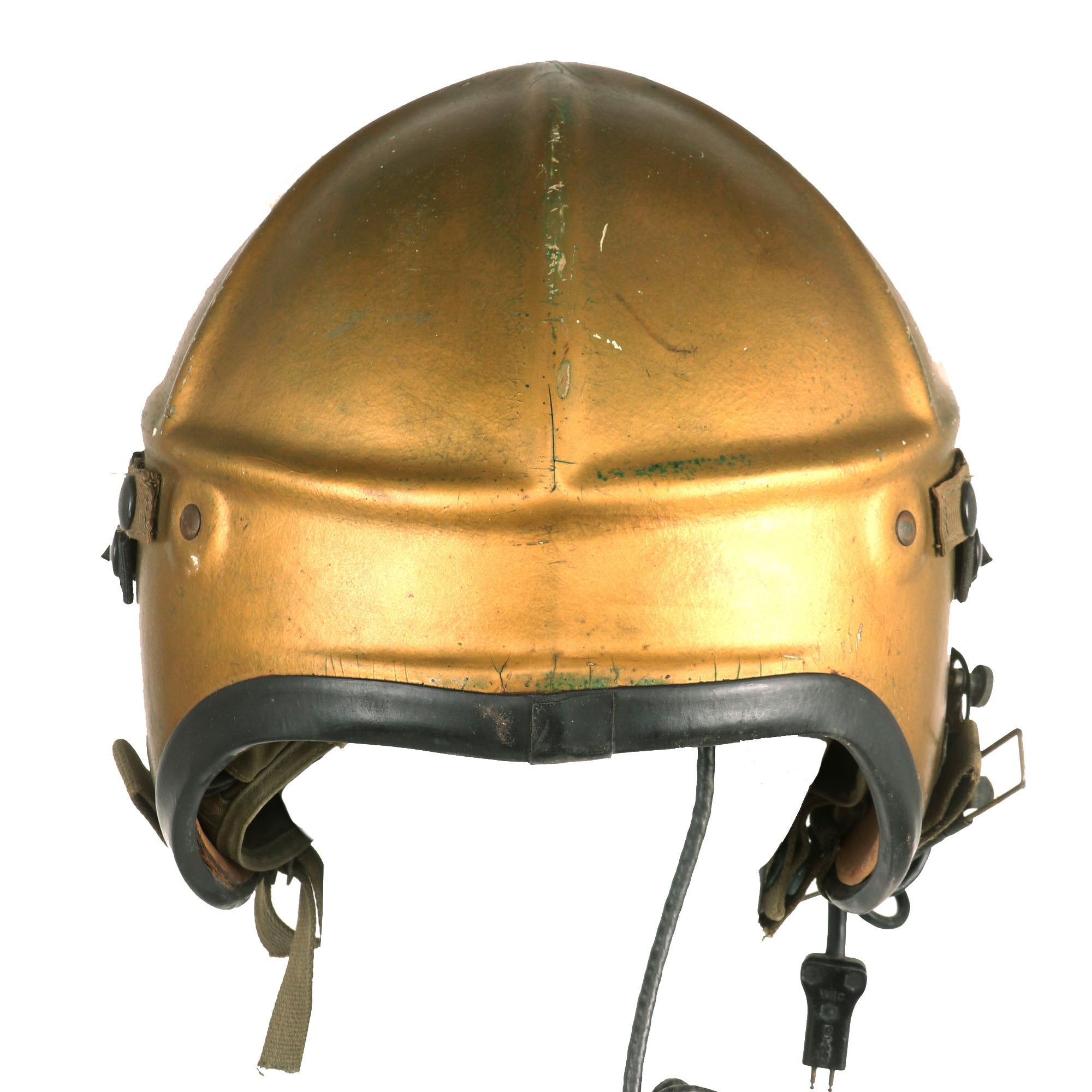 Original Items: Only One Available. This is a very nice 1950s USN size “Small” Gentex H-4 helmet that comes with correct U.S. Navy Marked “Snap-On” Goggles and a Summer Flying Helmet (Marked size Large) by General Textile Mills. Helmet features original gold and green paint with USN/USMC Aviator wings to front. All parts are in good condition.