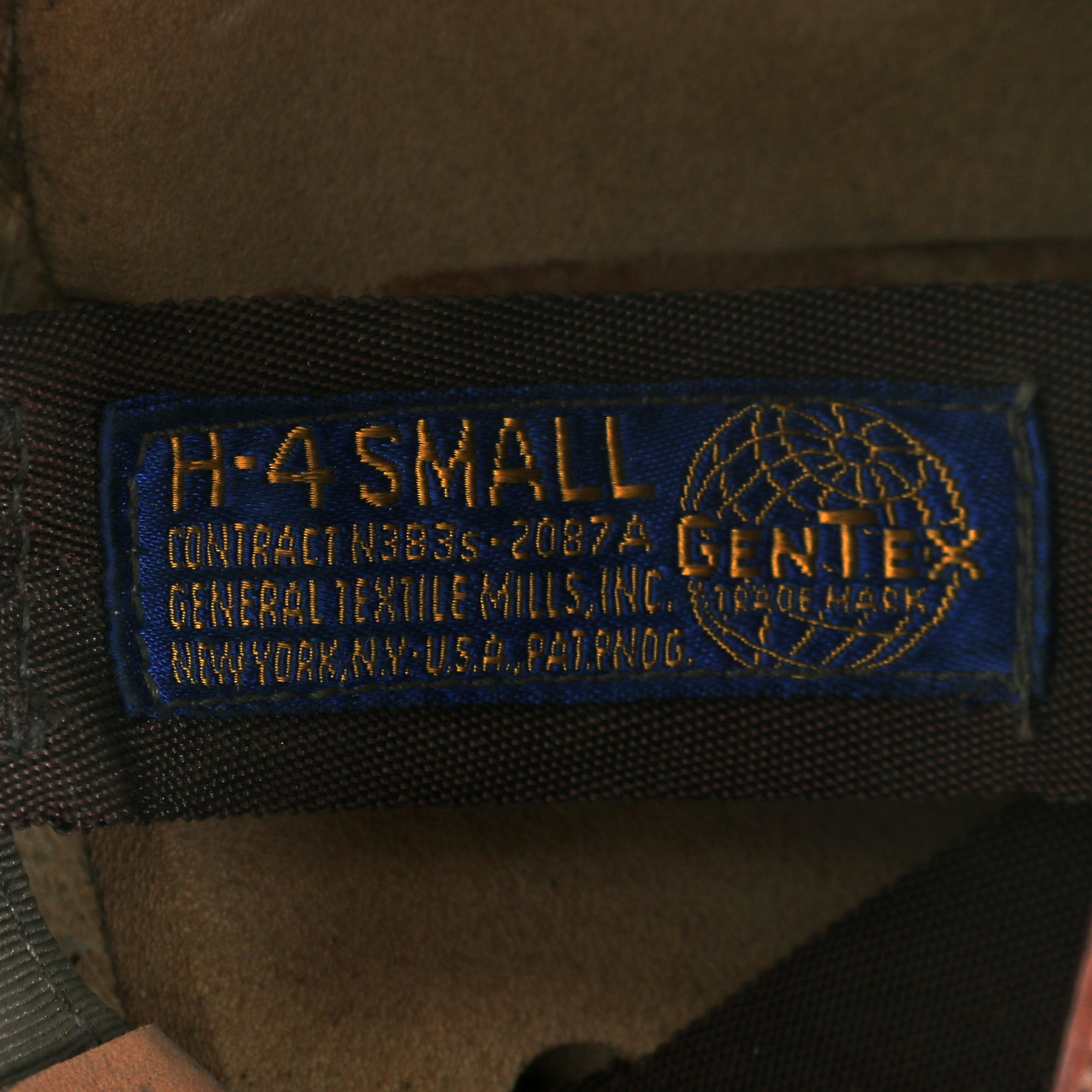 The H-4 features a rigid shell with reinforcing ridges and is constructed of a fiberglass cloth reinforced with epoxy resin. For this model a cloth inner helmet which incorporate the earphones was utilized. The inner helmet which accompanies the H4 is marked: “CONTRACT No. N288s-26302”. It is not the model which features the snaps which connect to the outer helmet, but to our understanding this helmet was used in conjunction with the H4.