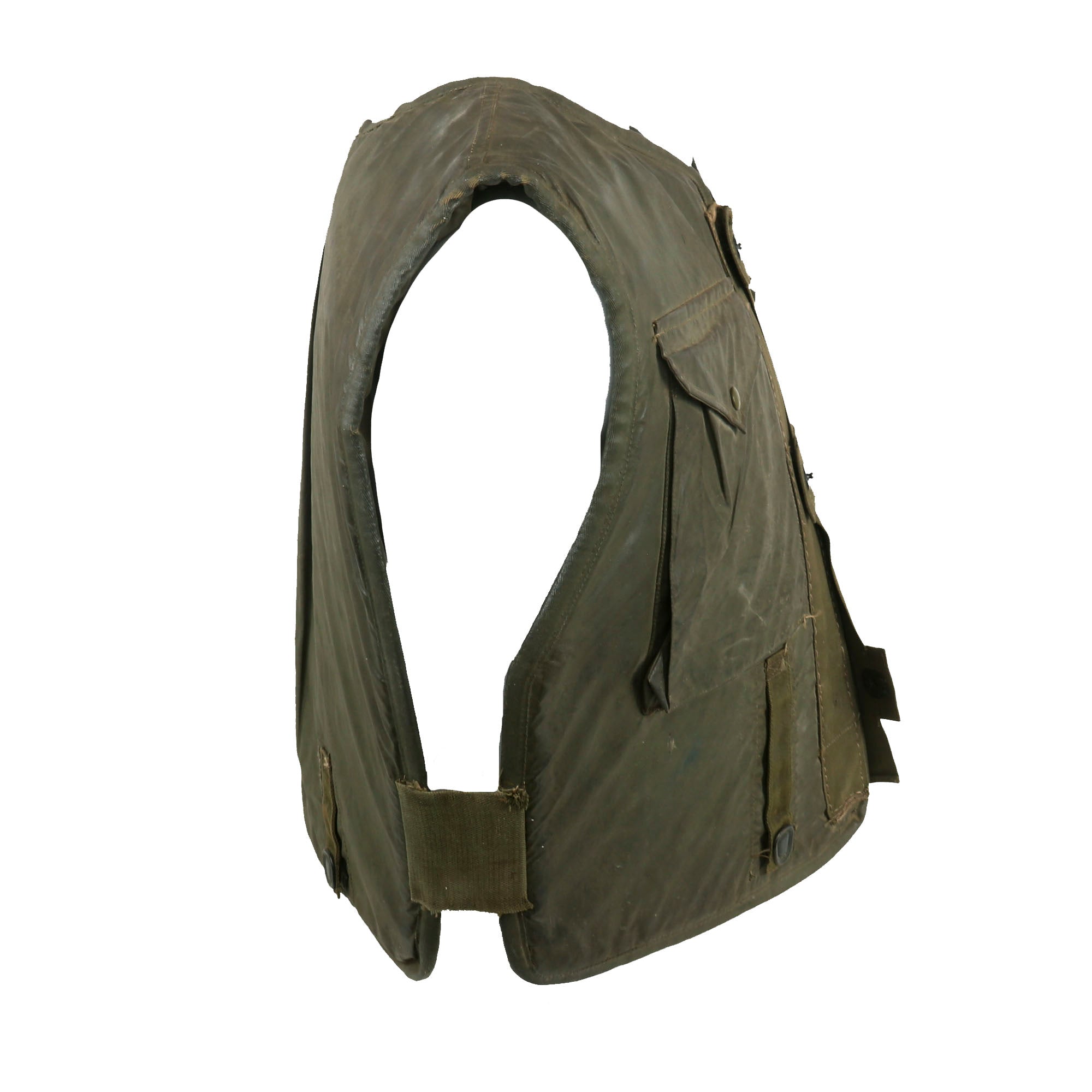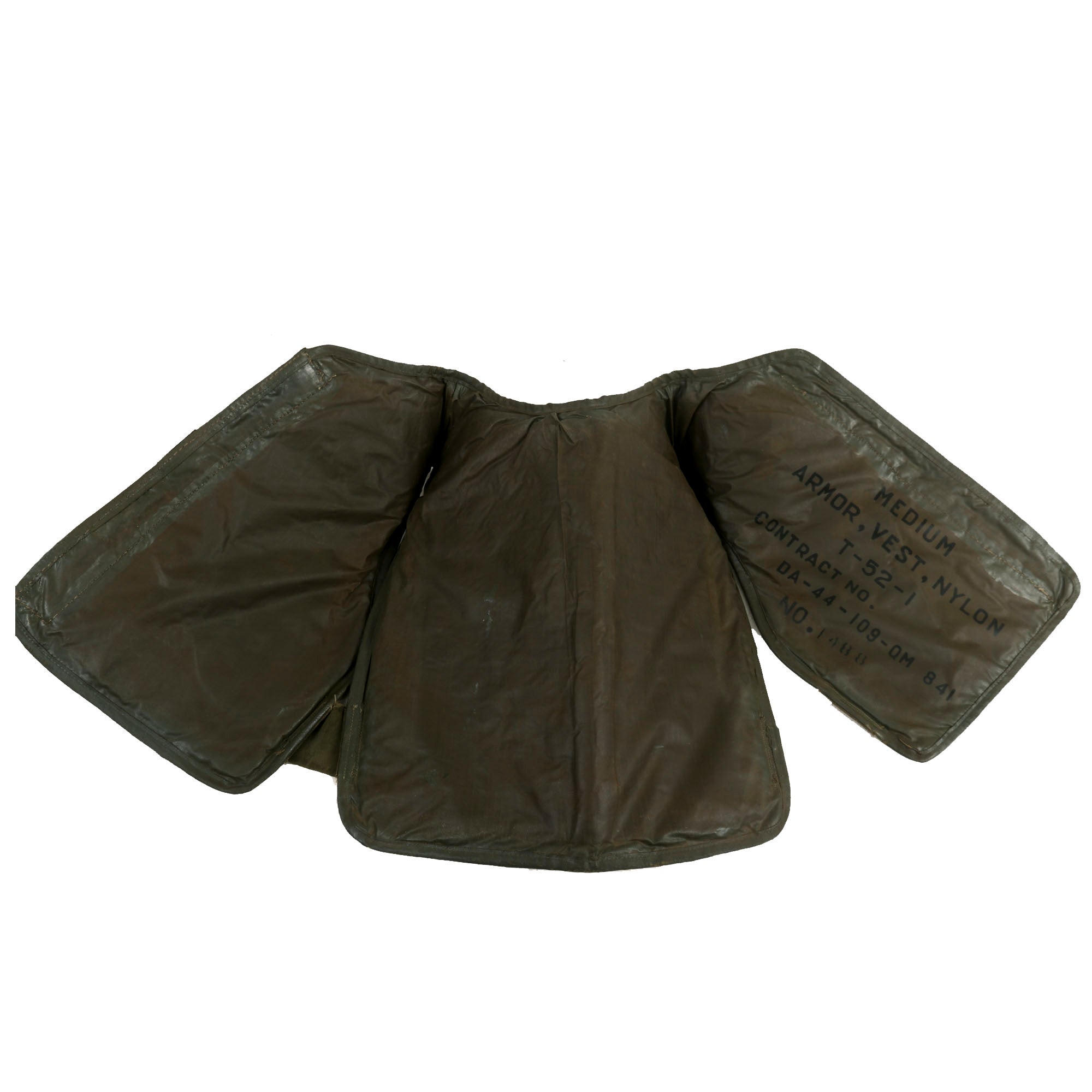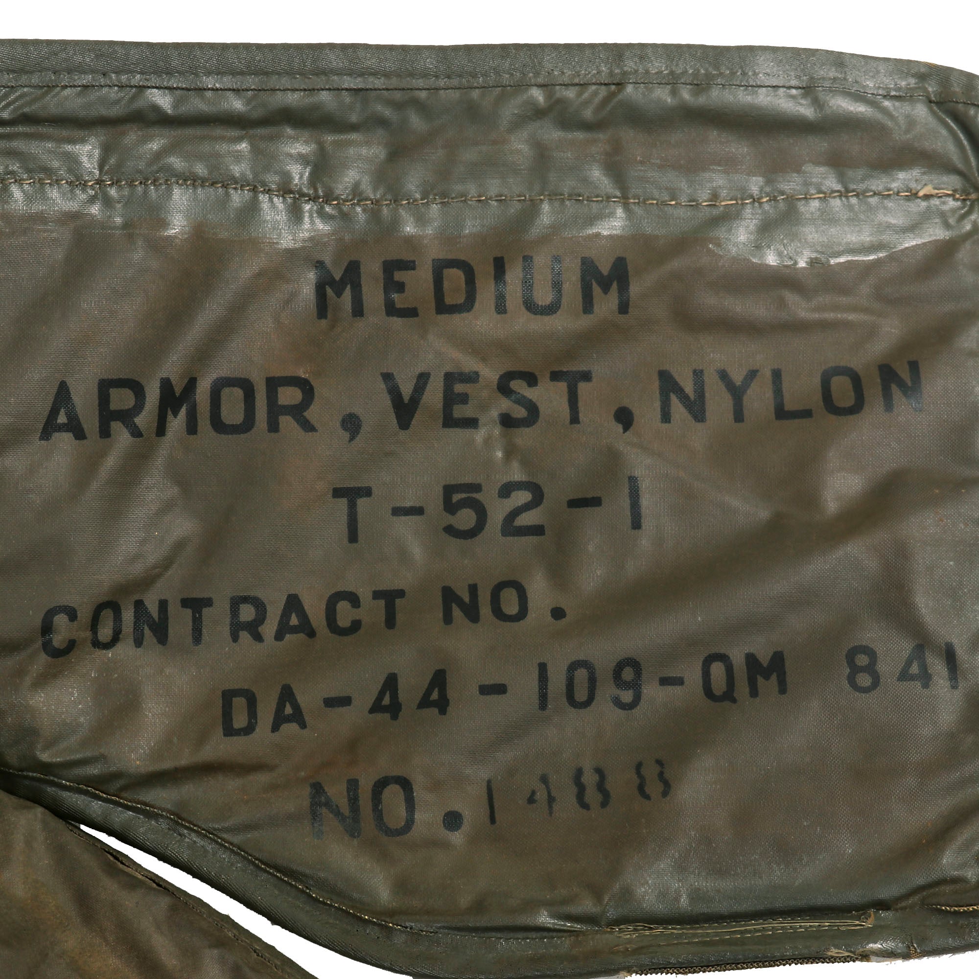 Original Item. Only One Available. This is a scarce set of ARMOR, VEST, NYLON T-52-1 dating to the 1950’s, likely an experimental example as there is very little reference to this set. The Army was experimenting with different materials across the vest, resulting in the T-52, T-52-1, T-52-2, and T-52-3. This set, the T-52-1, saw field testing in Korea in mid-1952. The set is marked Size Medium.