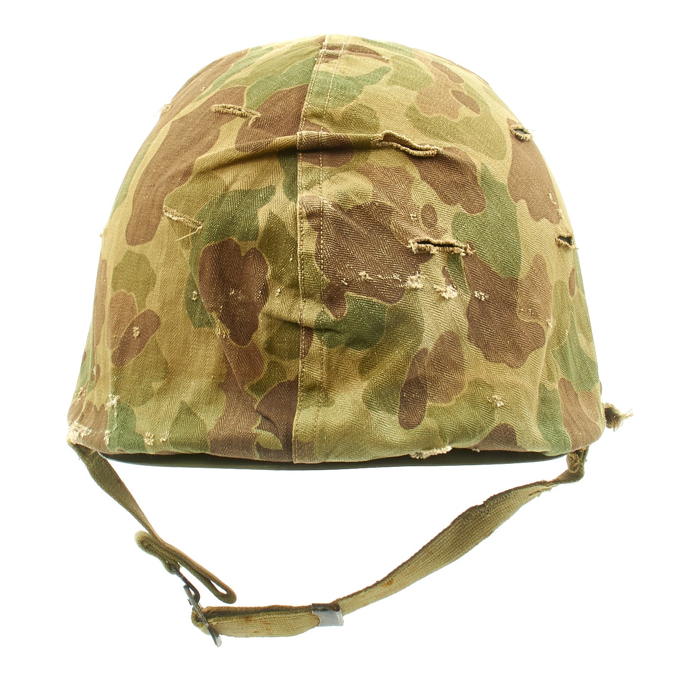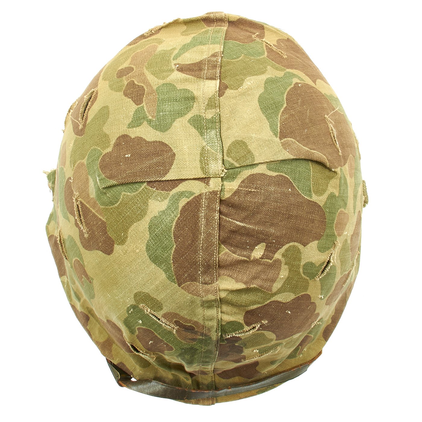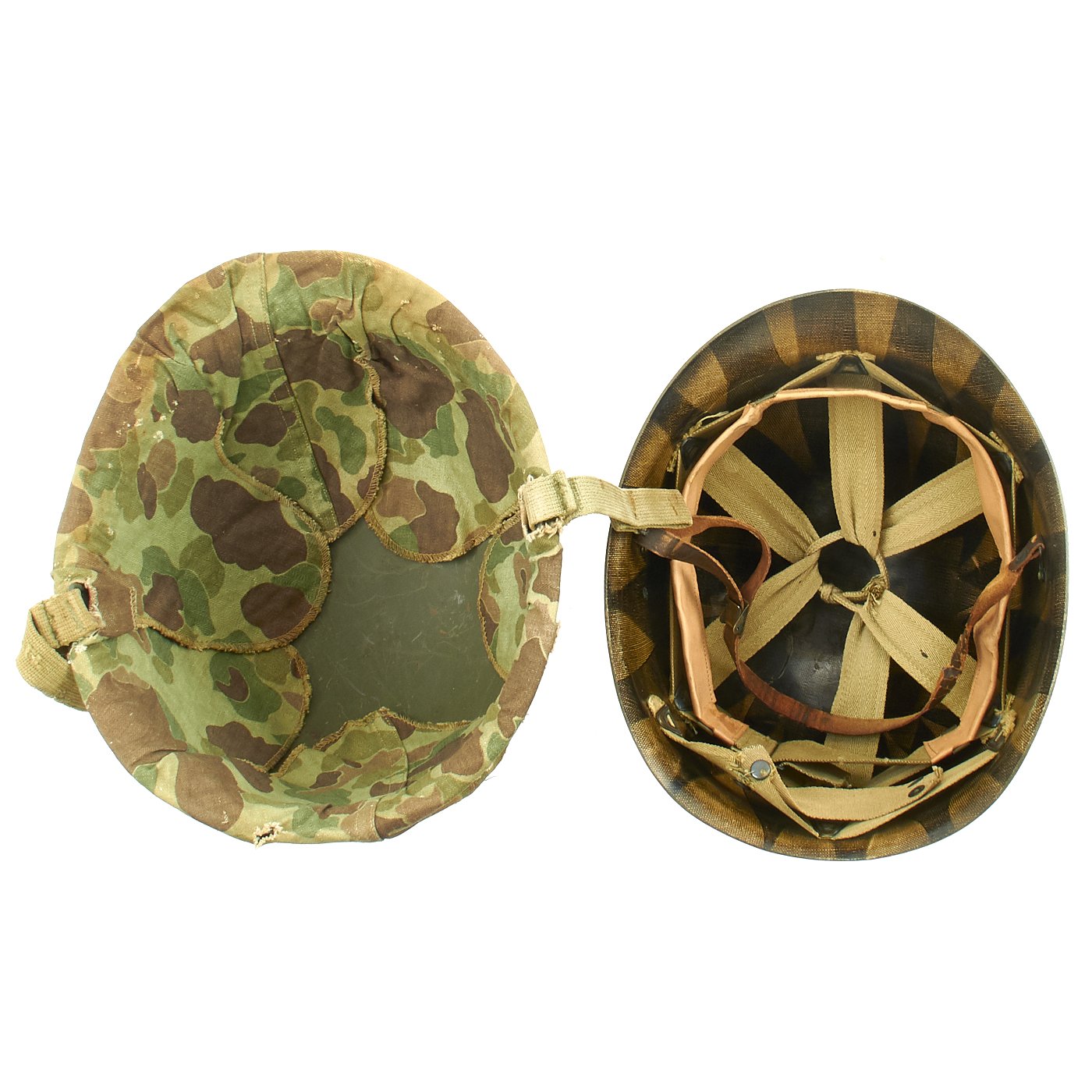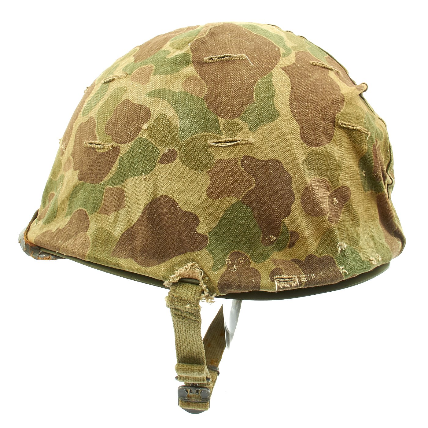 The shell is covered with a very good condition reversible 1953 dated USMC camouflage helmet cover, which is marked on both sides with the Marine Corps "EGA" (Eagle Globe Anchor) insignia.