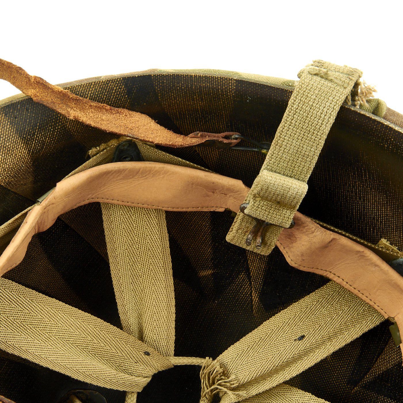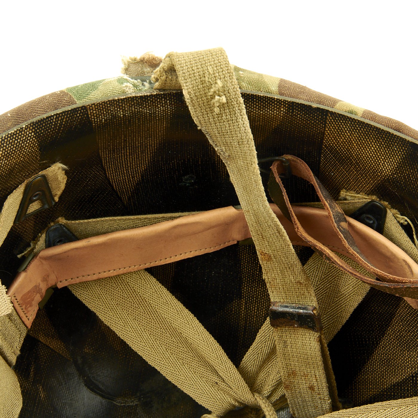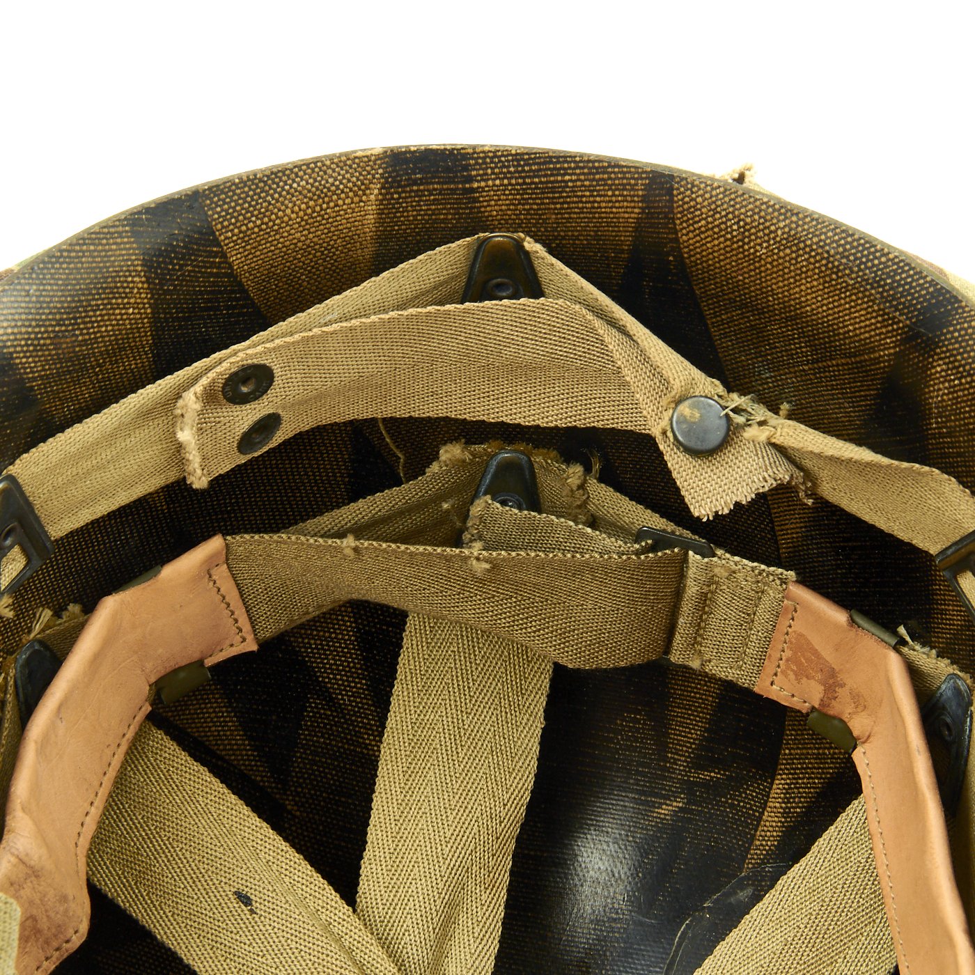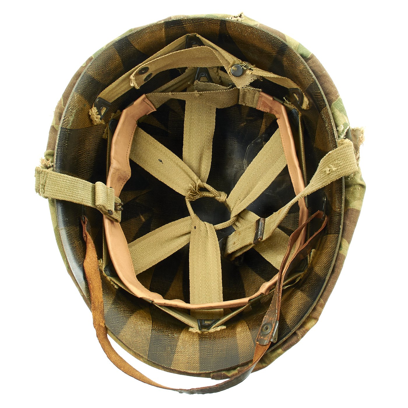 This true US WWII M-1 helmet liner be identified through the frontal eyelet hole. Other correct WWII features include cotton OD Green #3 herringbone twill (HBT) cloth suspension liner, with the webbing in very good shape. This HBT suspension is held tightly within the M-1 helmet liner by rivets and a series of triangular "A" washers. The three upper suspension bands are joined together with the correct OD green string. This way the wearer could adjust the fit. The sweatband is present. The liner chin strap is present, but delicate.