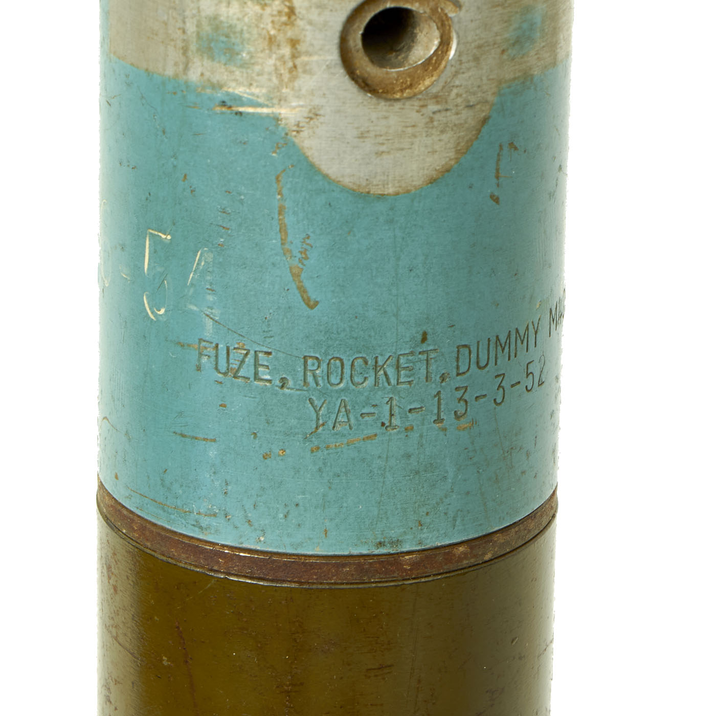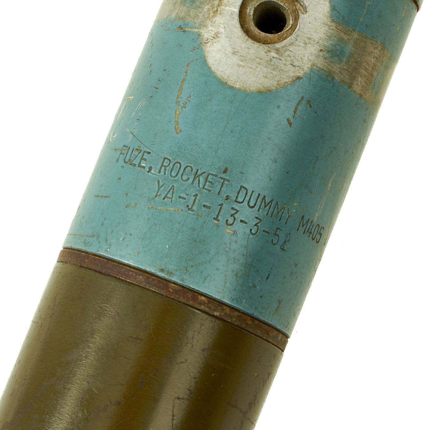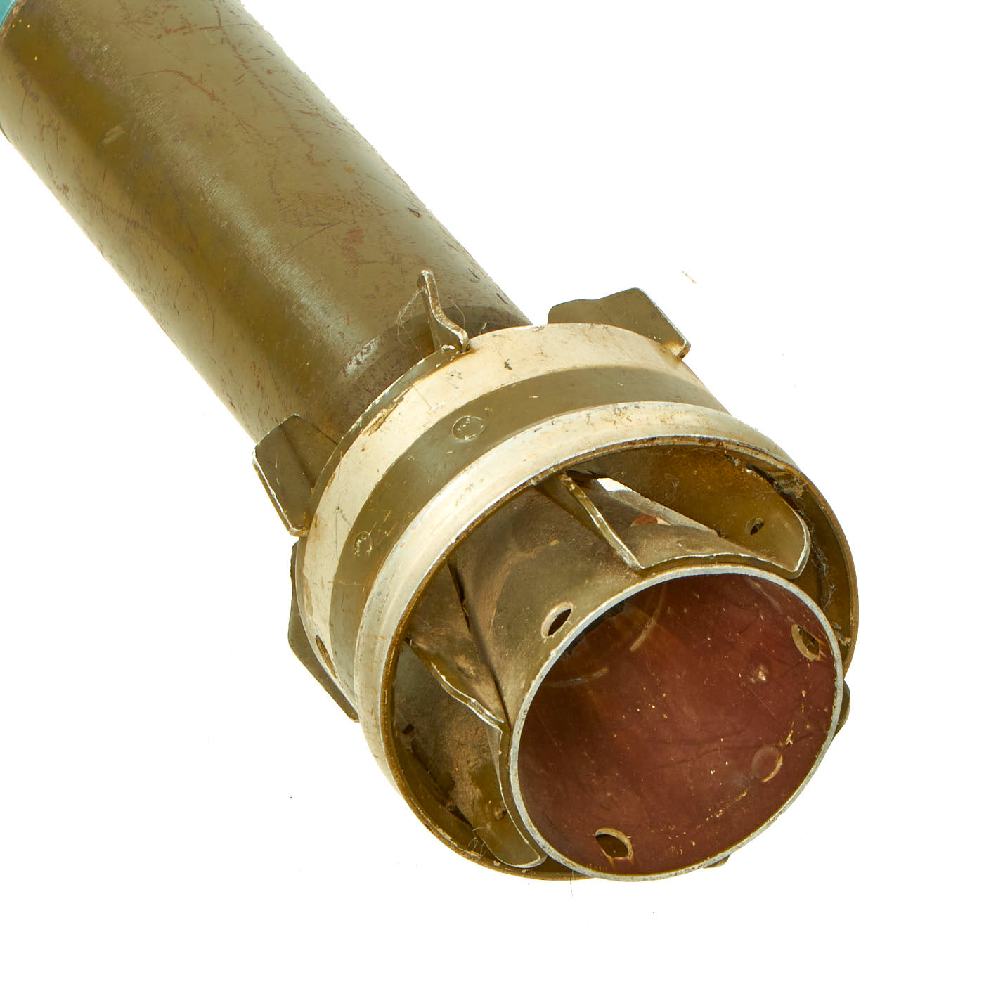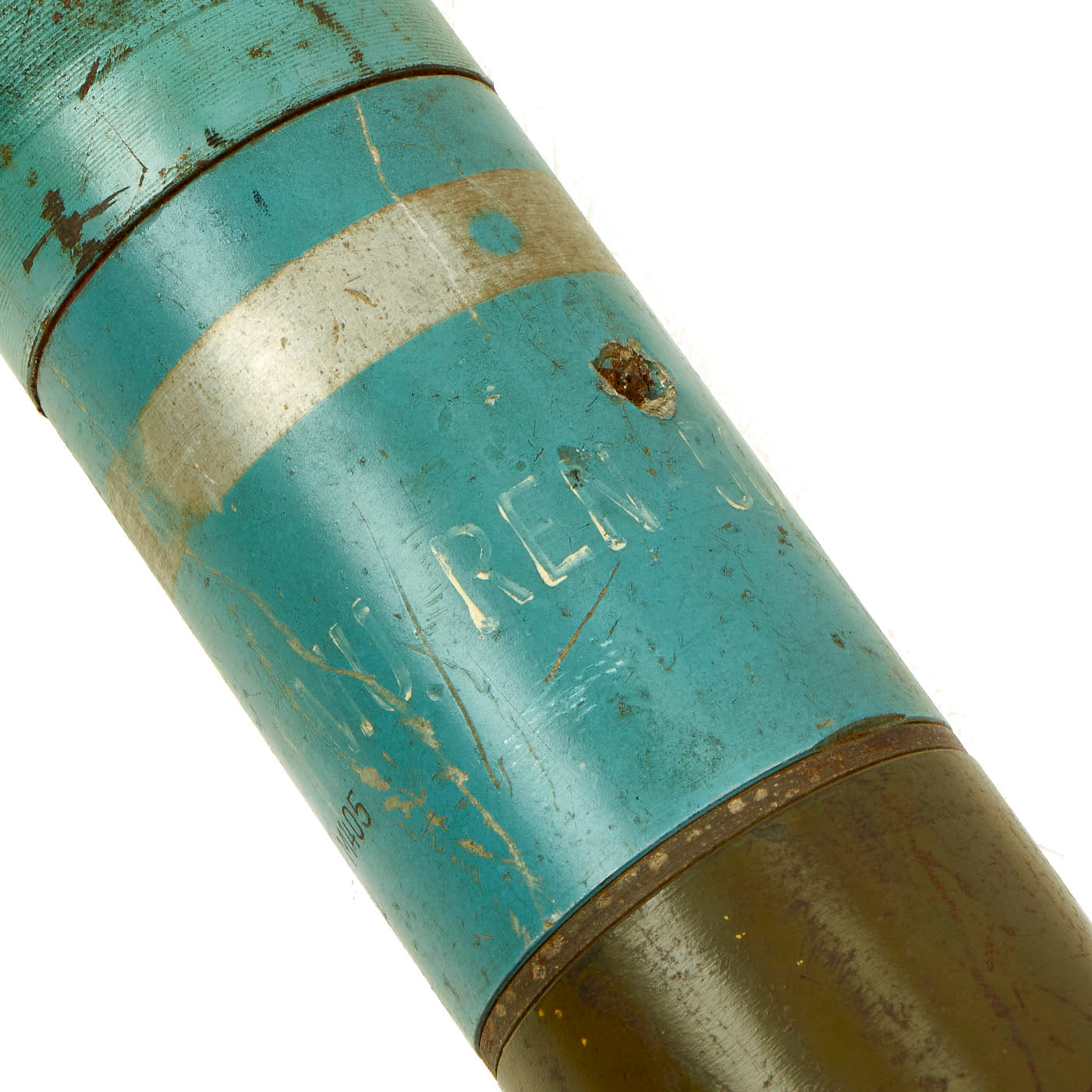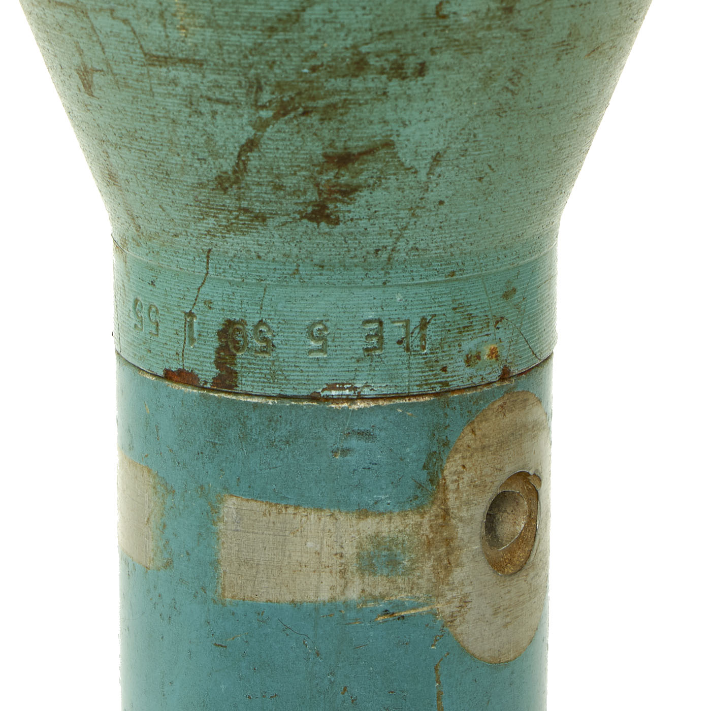 This is a U.S. military M29A2 Inert Practice Round for the M20 A1 B1 3.5 Inch Super Bazooka offered in very nice condition, and it still has the original OD green and Blue paint in very good shape. The Body has what appears to be a 1950s manufacturing code and date, and there are also clear paint markings on the inert warhead, with 8-55 dates painted.